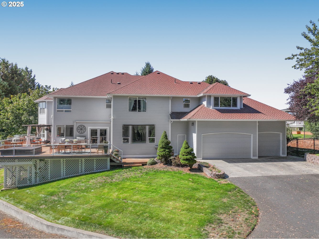 Stunning Custom Home with Breathtaking Views!Step into luxury as the grand entry opens to hand-scraped hardwood floors throughout the entire main level. The chef's kitchen is an entertainer's delight- commercial grade built-in 48" refrigerator, 6-burner gas stove, 2 built in ovens, large island, breakfast nook, butler's pantry with sink and beverage fridge. Butler's pantry opens to the formal dining room with french doors leading to the spacious deck including a covered pergola with plummed gas fire pit, hot tub & epic sunset views! Oversized living room, family room (currently used for a pool table), extra large laundry room w/workspace and tons of storage cabinets, bedroom (or office), and bathroom with walk-in shower complete the main level.Upstairs you'll find an elegant primary suite w/ dual vanities, middle tower, soaking tub, wardrobe mirror, large walk-in shower with multiple shower heads, floor to ceiling linen cabinet, walk-in closet with built in storage and organization. Three additional bedrooms (2 that share a jack and jill bathroom), a full hall bathroom and a large bonus room with countertop, cabinets and a beverage fridge round out the upper level.Fully-fenced back yard w/automatic gate opener. Many upgrades have been made over the past few years including 3 remodeled bathrooms, remodeled kitchen (last 5 mo), brand new carpet, new refrigerator, new ovens, new trash compactor, new dish washer, whole house water filtration system, ect. This home provides luxury, function and views all in one!Concessions available. Please contact agent.