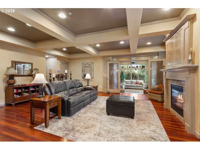 BeamedCeilings, BuiltinFeatures, Fireplace, FrenchDoors, HardwoodFloors, SoundSystem