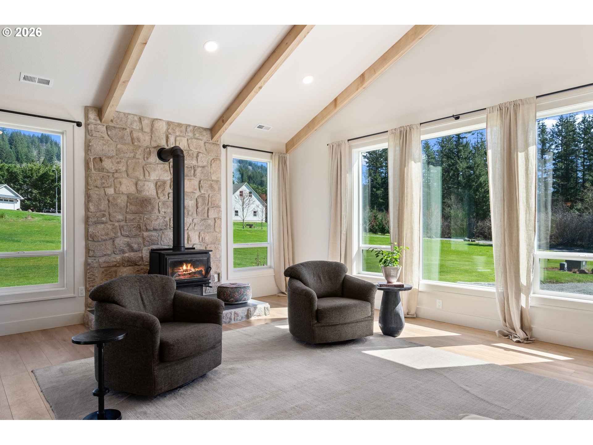 Open House Sat 4/11 12:30-3pm A Charming Year-Round Creek sparkles brightly at the back of the property! This nearly new home is set on 5 beautiful, open, and highly usable acres with plenty of room to build the shop of your dreams - just the rare find you have been seeking! A circular drive and elegant entry welcome you home in style. The thoughtfully designed floor plan delivers generous gathering areas to bring family and friends together, while still offering ideal separation from the bedroom spaces for privacy and comfort. The great room is a true centerpiece, featuring soaring ceilings with beautiful beam details and a charming woodstove, all surrounded by large windows that capture picturesque views in every direction. The chef’s kitchen is both stunning and functional, complete with a massive island, quartz countertops, induction range, double oven, and a walk-in butler’s pantry with exceptional storage and organization.The main-level primary suite offers a functional retreat with dual walk-in closets and a walk-in shower. The fourth bedroom or office with a small closet is also located on the main floor for added convenience. Upstairs, a large bonus room provides flexible space for work, play, or guests. Two more bedrooms and a bath complete the upper level. Additional highlights are generous cabinetry and a large sink in the utility room with sink, a large mudroom area, and extensive concrete walkways and patios.Outdoor living spaces invite you to fully embrace the setting—whether relaxing, entertaining, or enjoying the rare creekside backdrop. No HOA, a dead-end road, public water, sprinklers in the garden beds & lawn near the house, highspeed internet, a large shed, plenty of level parking - All of this just minutes to shopping, schools, and major highways—giving you the best of both worlds: peaceful acreage living without sacrificing everyday convenience.
