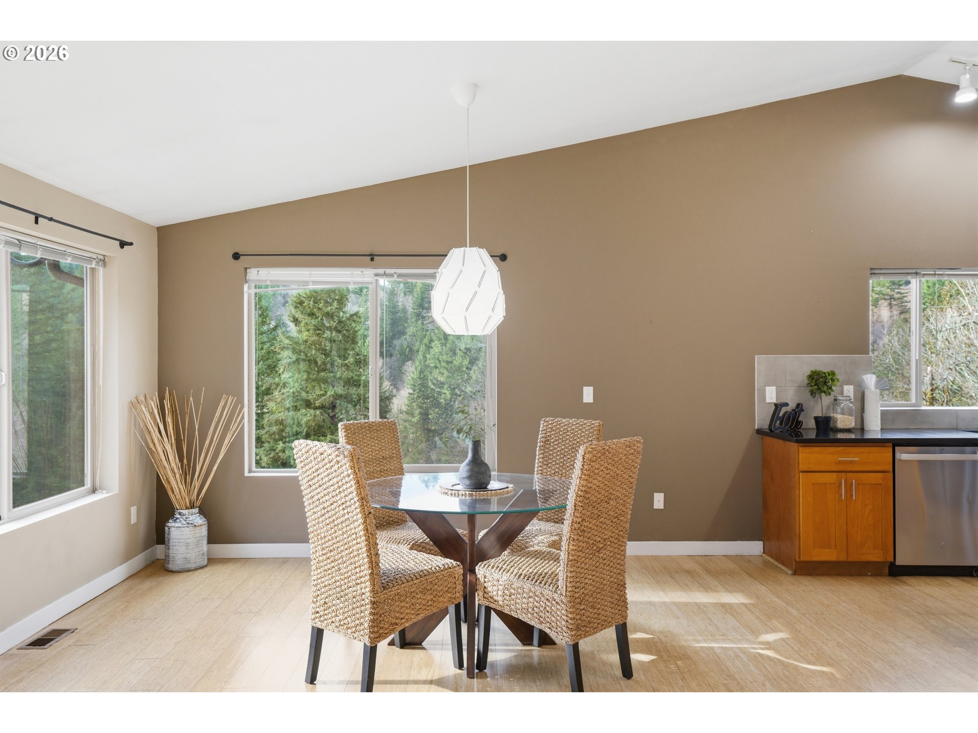 Located in the picturesque town of Washougal, WA, this one-level home at 2329 NE 380th Ave offers a flexible floorpan with 3 bedrooms + office, 2.5 bathrooms and large open living area. Situated on 7.36 private acres within the gated Cougar Creek community, this home has room for all your favorite people, animals and outdoor toys. Built in 2016, this ranch-style home features 2,127 sq ft of living space with bamboo flooring throughout. The open great room serves as a central hub with high vaulted ceilings and loads of windows for bright natural light. The kitchen is equipped with granite countertops, a large island, pantry, stainless steel appliances, propane range and sweeping views of the nearby hills and forest. The primary suite provides a large ensuite bathroom with soaking tub, walk-in shower, double sinks, and double closets. Being on well water and a septic system keeps utilities low. For all the critters, you'll find that this property includes a barn with two 12x12 corrals + elevator for over head hay storage. Additionally, a 32x65 covered indoor horse arena with three 10x10 horse stalls and a flexible room for ranch hand quarters or a heated tack room make this property an absolute dream come true! Outdoors you'll find a wrap around porch for taking in all the beauty around you, cross-fenced areas and a mix of partially cleared land and wooded terrain all the way down to Cougar Creek. 2 car attached garage, 2 car carport, and dedicated RV/trailer parking to top it off. Cougar Creek is a tight knit gated community of 22 lots, with low $416/year dues for road maintenance, gate and snow removal. Open House: 03/07 from 12-2PM!