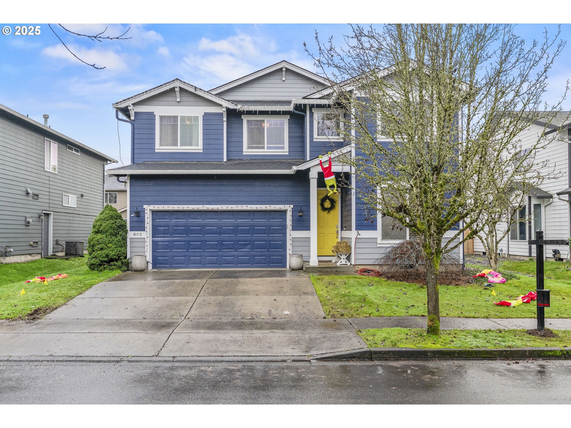 Immaculate, custom-built 2023 home with breathtaking views on 10.5 acres! This 3,900 sq. ft., 2-story home offers 5 bedrooms, 3.5 bathrooms, and exceptional design throughout. The main-level primary suite features a spacious walk-in closet with laundry hookups, a luxurious bath with double vanity, walk-in shower, and soaking tub. Upstairs you’ll find 4 bedrooms—two with a Jack-and-Jill bath—plus a second laundry room and generous bonus room above the garage. The gourmet kitchen boasts quartz countertops, propane cooktop, wall oven, and a large Butler's pantry. Cozy up in the carpeted living room with a propane fireplace, or host in the additional seating area. Energy efficiency shines with heat pump water heater and a full 34-panel solar system. Enjoy view from the covered back patio with gas hookups for grilling! Approximately 3 acres of pasture, and the remainder in forest classification with planting done. 1 acre orchard- blueberries, thornless blackberries, Apples, Pears, and Plums. Property includes power and water for a future shop—plans and permits are ready. A rare combination of luxury, functionality, and usable acreage just minutes from Battle Ground!