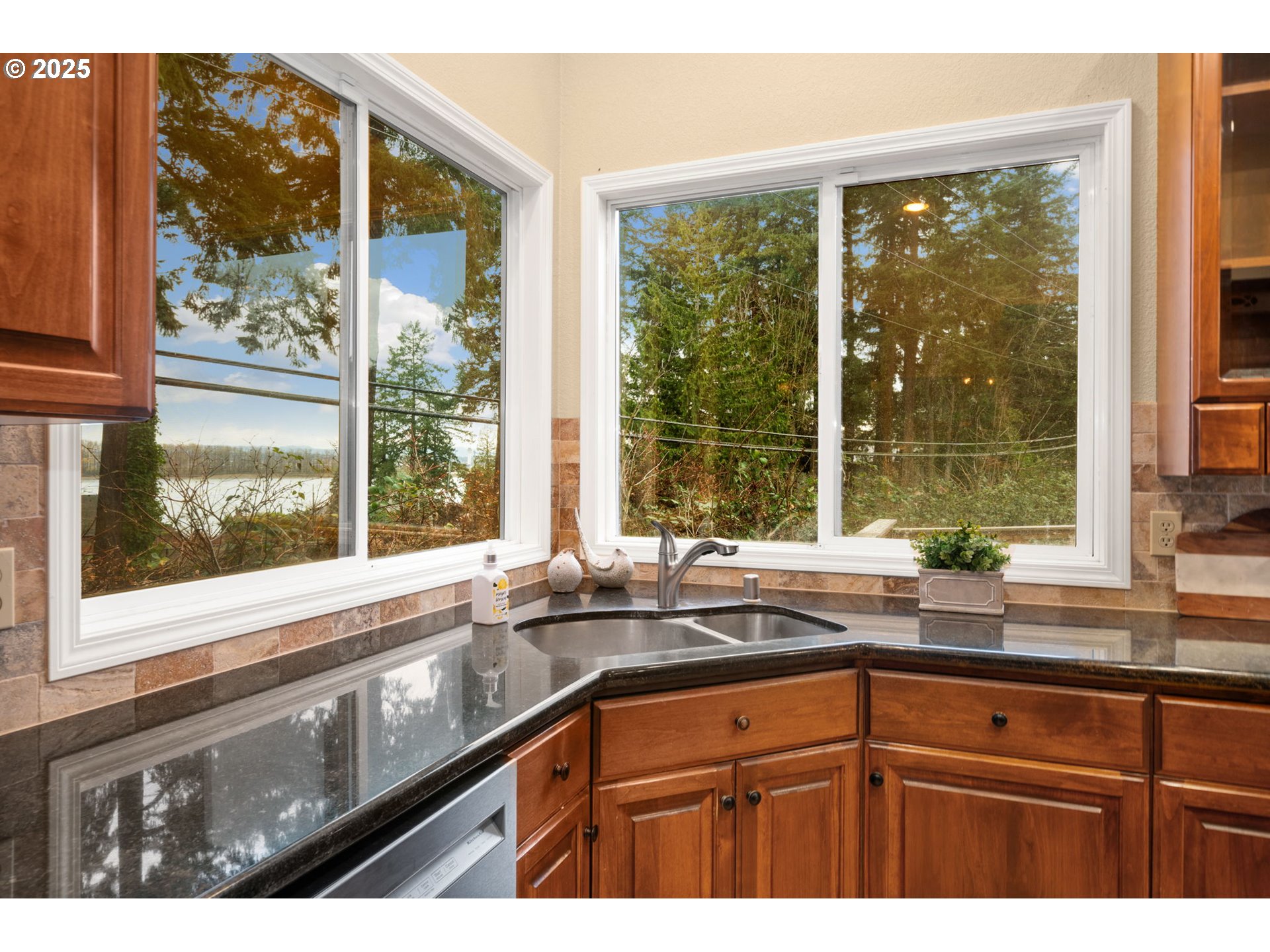 Columbia River views and timeless upgrades in this beautifully maintained Craftsman home on a cul-de-sac corner lot! Enjoy wall of floor-to-ceiling windows in the living room, family room, and primary bedrolm, bringing in abundant natural light and showcasing the scenery. Updated kitchen features elegant cabinetry, slab granite counters, a large island with Jenn-Air gas cooktop, stainless appliances, hardwood floors, and a built-in desk. Spacious family room with fireplace plus formal living room with fireplace and formal dining. Main level bedroom and full bath—ideal for guests or multi-generational living. Upstairs offers a generous primary suite plus three additional bedrooms. Step outside to the expansive Ironwood deck—known for exceptional durability and natural resistance to rot, and enjoy river views from the deck and backyard. Tile roof, plumbed for central vacuum, gated RV/boat pad, sprinkler system, mature landscaping and privacy hedges PLUS 3-car tandem garage for all your storage needs. Million dollar views without the million dollar price tag!