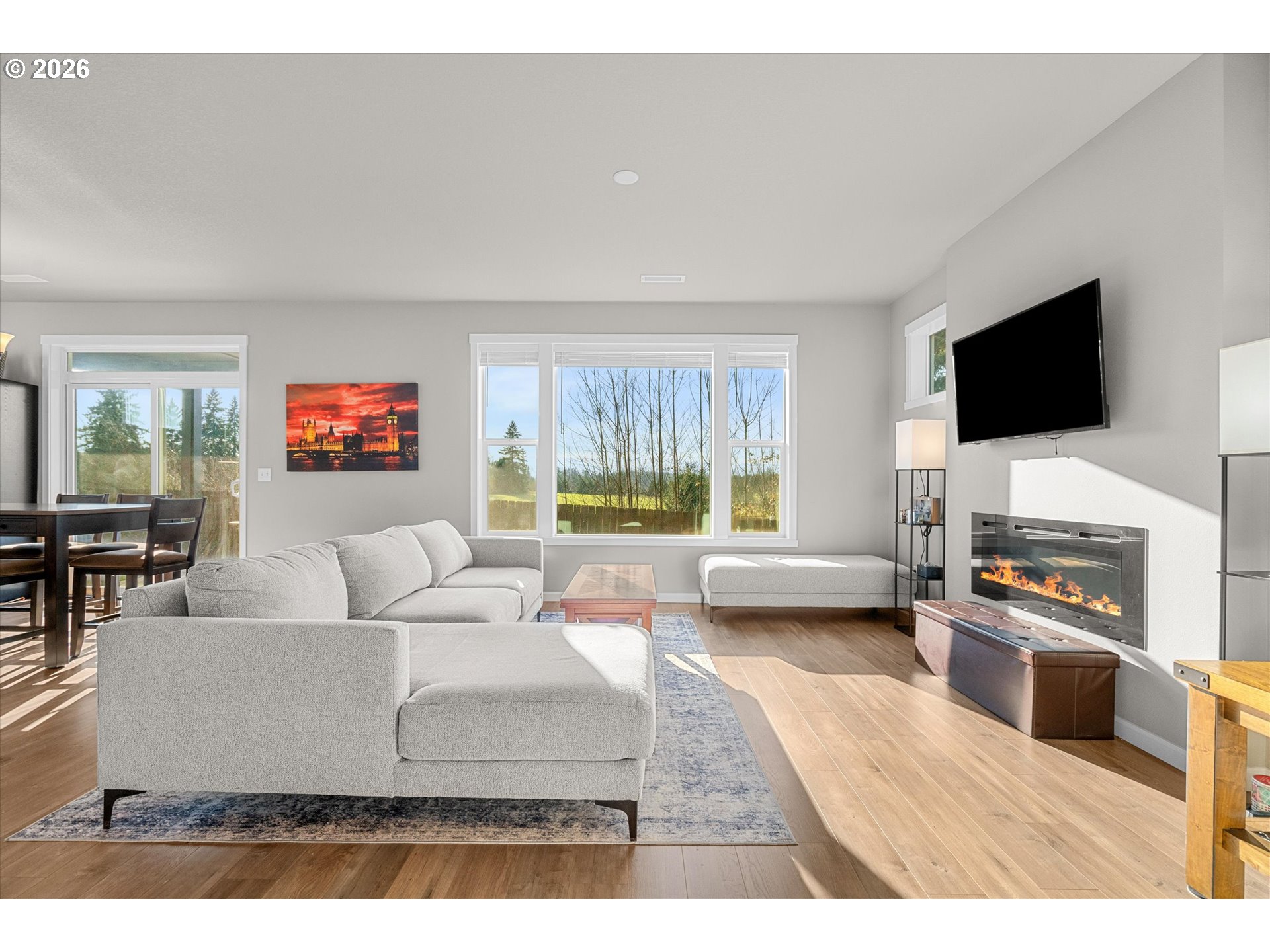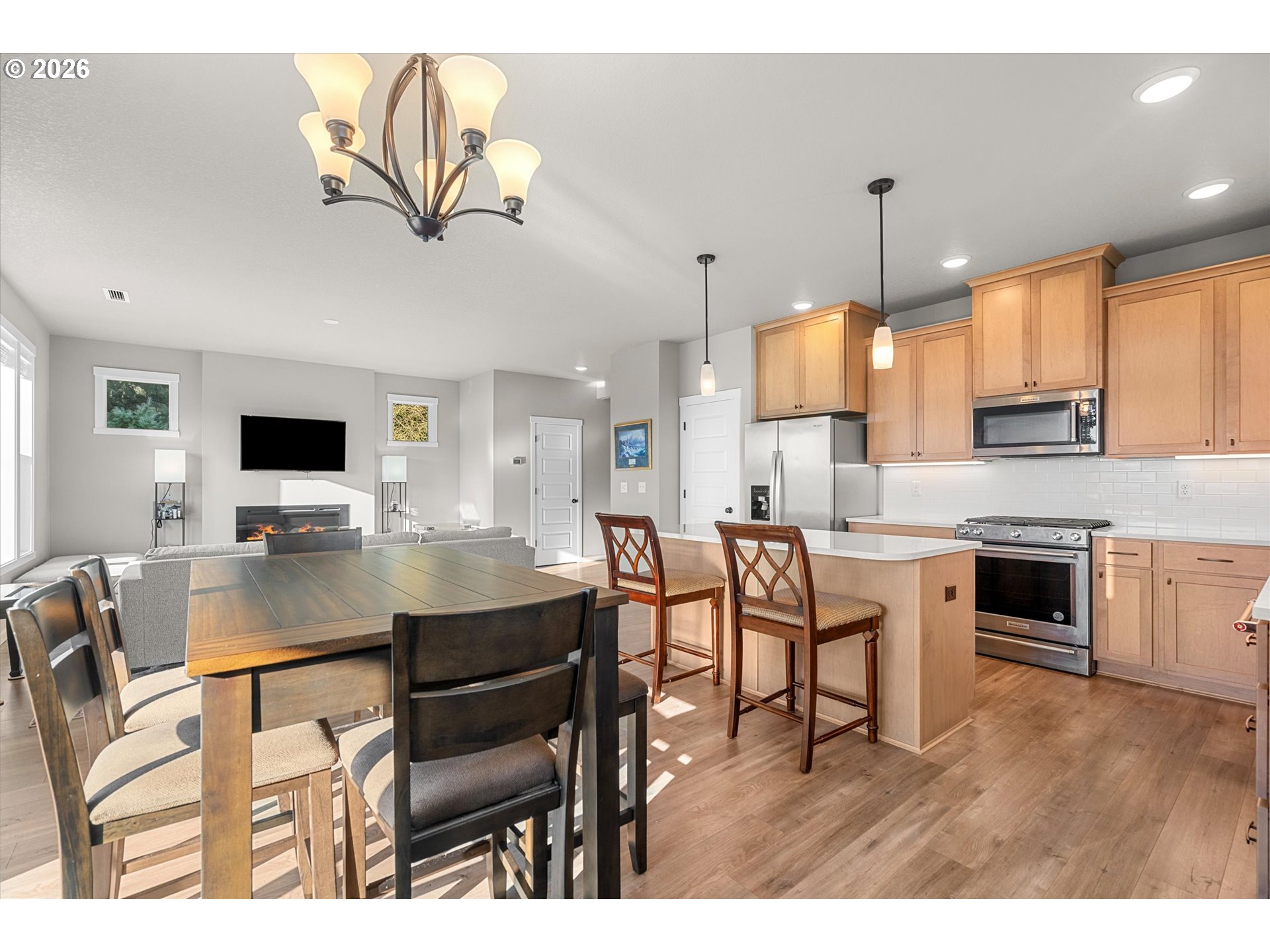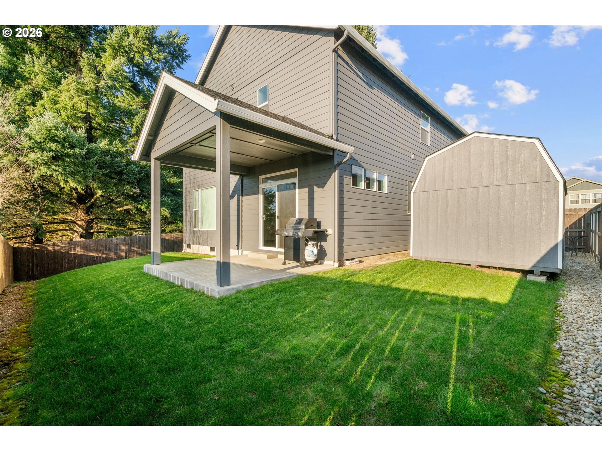Low-maintenance newer construction without the wait! This craftsman-style home offers modern finishes, a comfortable layout, and thoughtful upgrades already in place and ready for move-in. The main level features 9-foot ceilings and durable laminate plank flooring connecting the kitchen, dining, and great room in one open, functional space. The kitchen includes quartz slab countertops, light wood cabinetry, stainless gas appliances, and a subway tile backsplash with under-cabinet and pendant lighting. A sleek linear fireplace anchors the great room, while large windows bring in natural light and offer a peaceful spot to watch the birds. Upstairs, a central landing connects the bedrooms and living spaces. Double doors open to the primary suite featuring territorial views, dual sinks, and a large walk-in closet. Two additional bedrooms share a full bathroom, and a nearby laundry room includes extra storage cabinets and a utility sink. Outdoor living continues with a covered patio overlooking the fully landscaped and fenced yard. The yard also includes a 10-foot storage shed designed to match the home, providing convenient additional storage. A front storm door adds comfort and efficiency. Located minutes from Lewisville Park, a 159-acre regional park known for forested trails, picnic areas, playgrounds, and access to the East Fork Lewis River, one of Clark County’s favorite outdoor destinations. The heart of Battle Ground is also nearby, where Main Street offers locally owned shops, restaurants, coffee spots, and seasonal community events that give the town its welcoming small-town feel. Enjoy the ease of newer construction paired with convenient access to parks, trails, and the small-town charm of downtown Battle Ground.