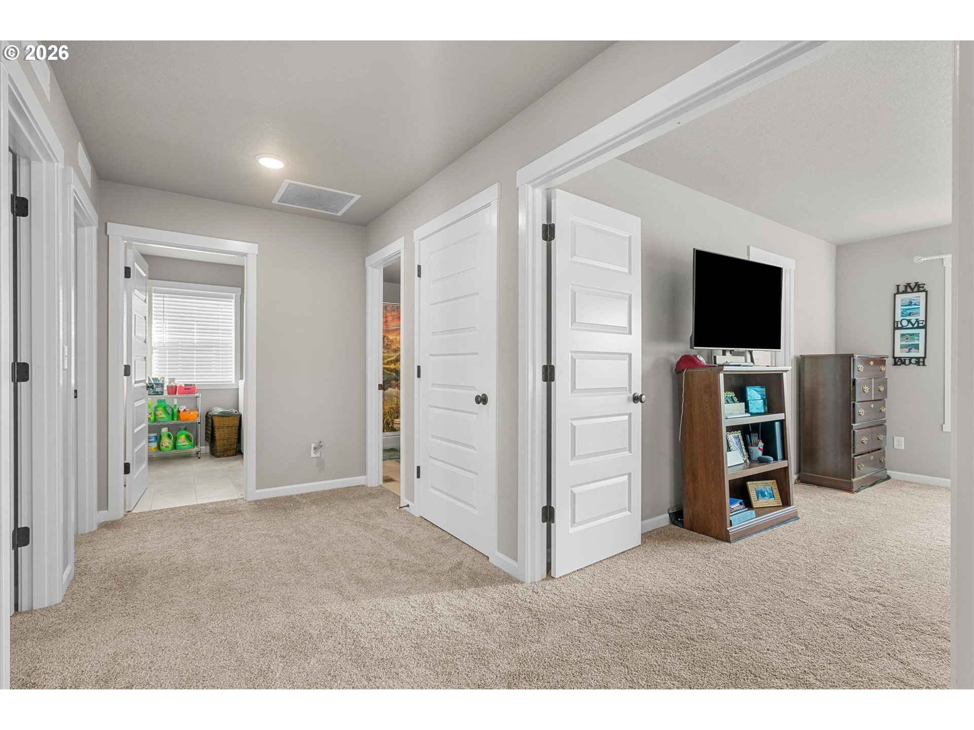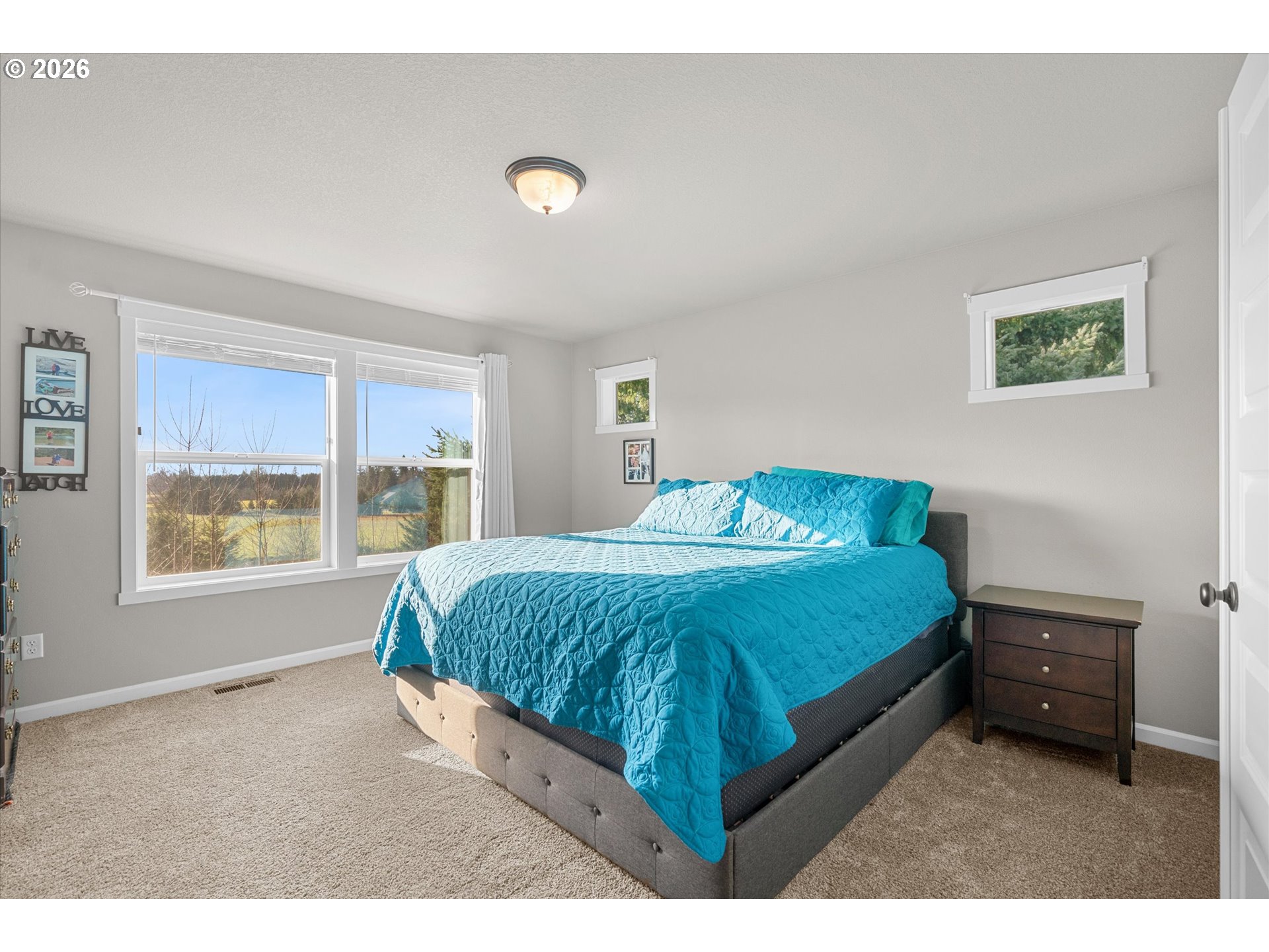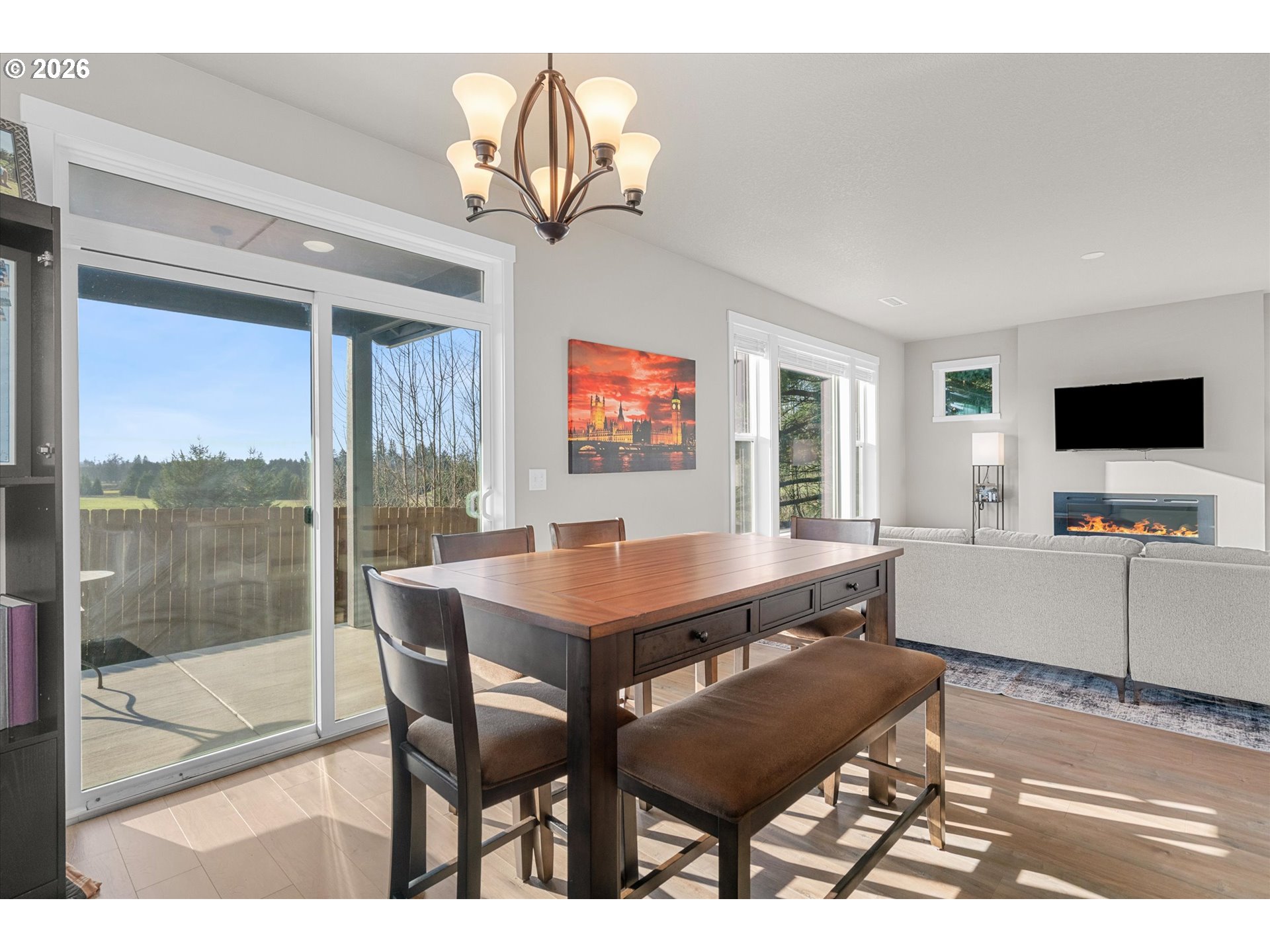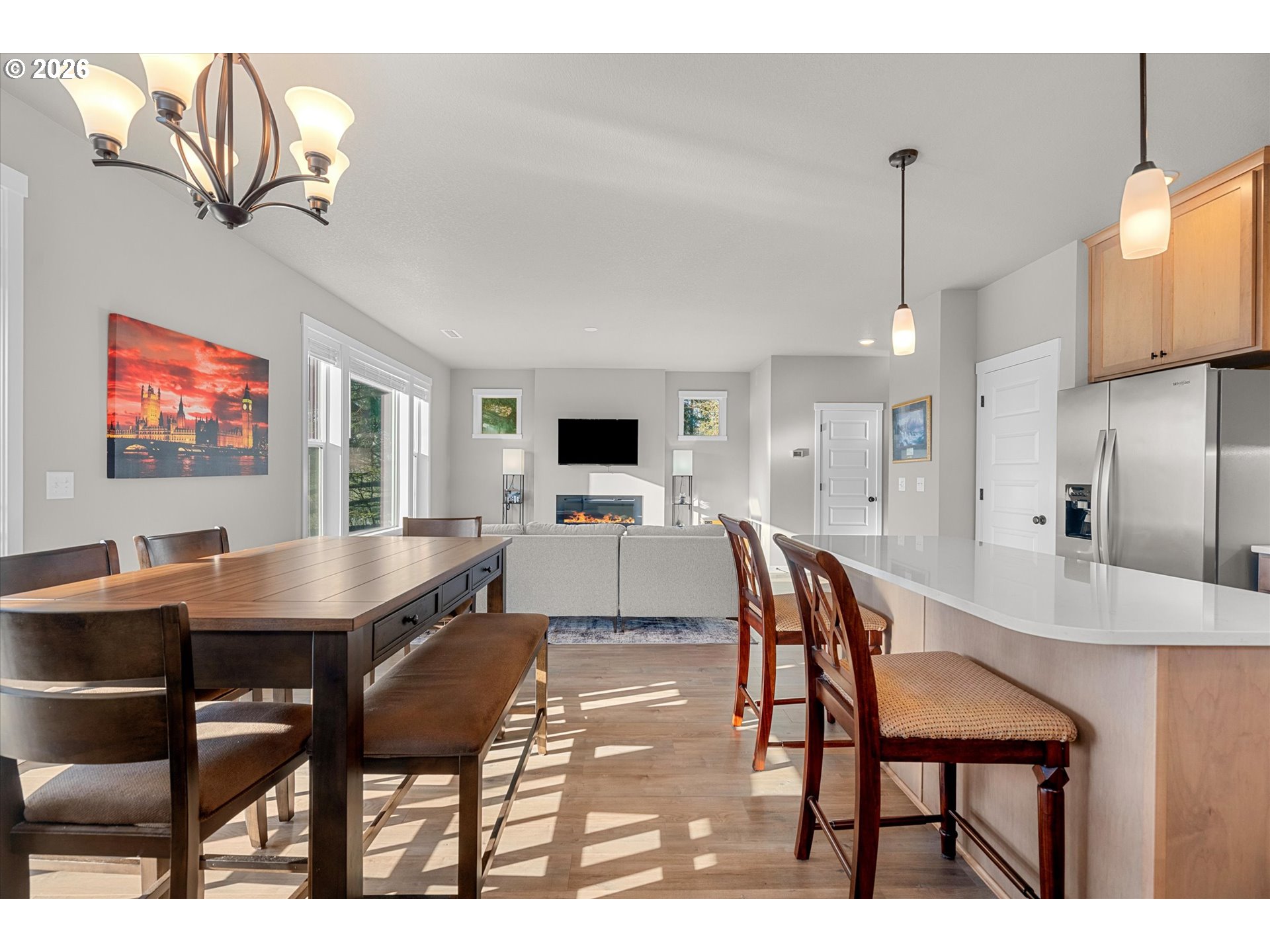 Low-maintenance newer construction without the wait! This craftsman-style home offers modern finishes, a comfortable layout, and thoughtful upgrades already in place and ready for move-in. The main level features 9-foot ceilings and durable laminate plank flooring connecting the kitchen, dining, and great room in one open, functional space. The kitchen includes quartz slab countertops, light wood cabinetry, stainless gas appliances, and a subway tile backsplash with under-cabinet and pendant lighting. A sleek linear fireplace anchors the great room, while large windows bring in natural light and offer a peaceful spot to watch the birds. Upstairs, a central landing connects the bedrooms and living spaces. Double doors open to the primary suite featuring territorial views, dual sinks, and a large walk-in closet. Two additional bedrooms share a full bathroom, and a nearby laundry room includes extra storage cabinets and a utility sink. Outdoor living continues with a covered patio overlooking the fully landscaped and fenced yard. The yard also includes a 10-foot storage shed designed to match the home, providing convenient additional storage. A front storm door adds comfort and efficiency. Located minutes from Lewisville Park, a 159-acre regional park known for forested trails, picnic areas, playgrounds, and access to the East Fork Lewis River, one of Clark County’s favorite outdoor destinations. The heart of Battle Ground is also nearby, where Main Street offers locally owned shops, restaurants, coffee spots, and seasonal community events that give the town its welcoming small-town feel. Enjoy the ease of newer construction paired with convenient access to parks, trails, and the small-town charm of downtown Battle Ground.