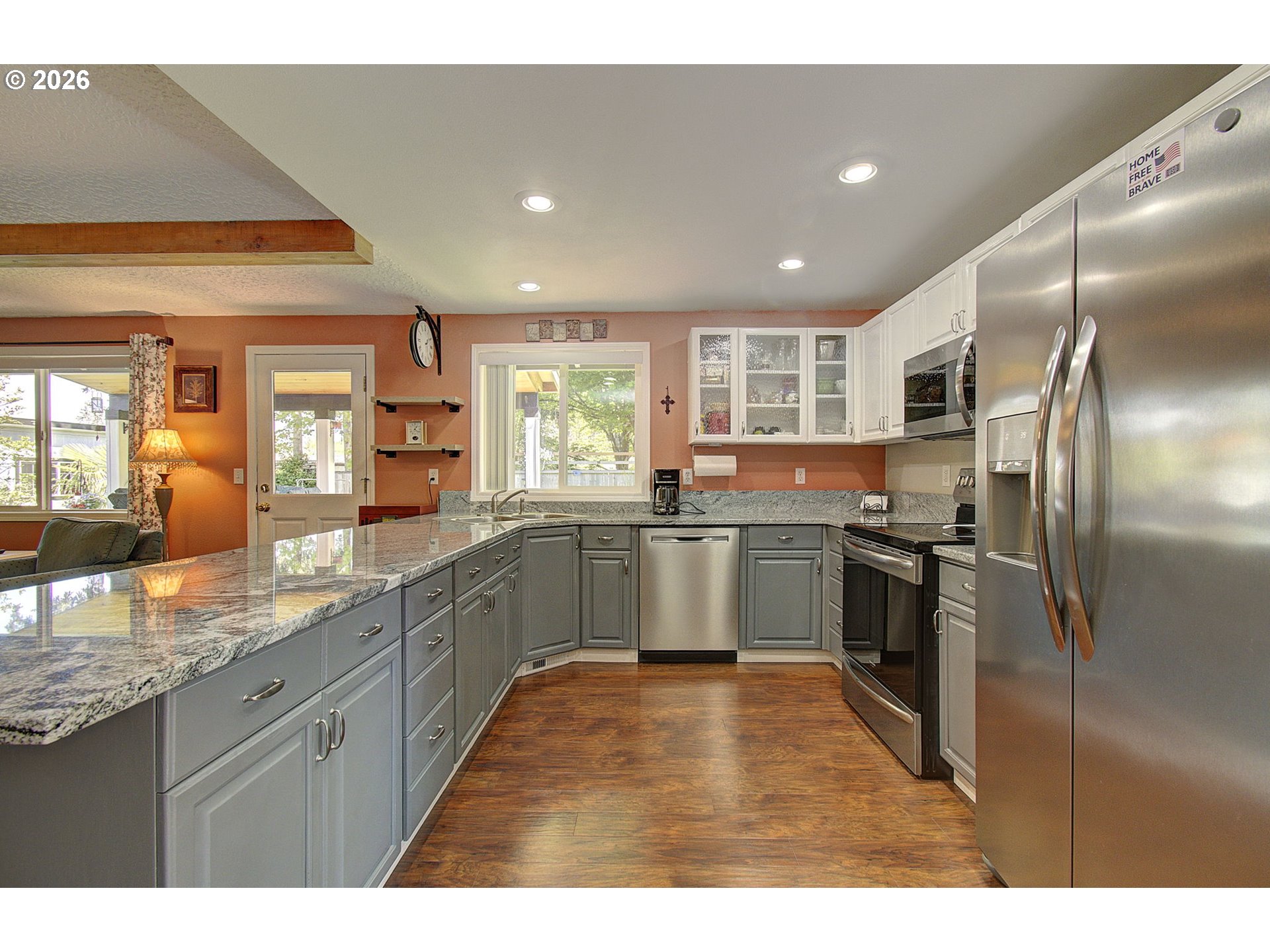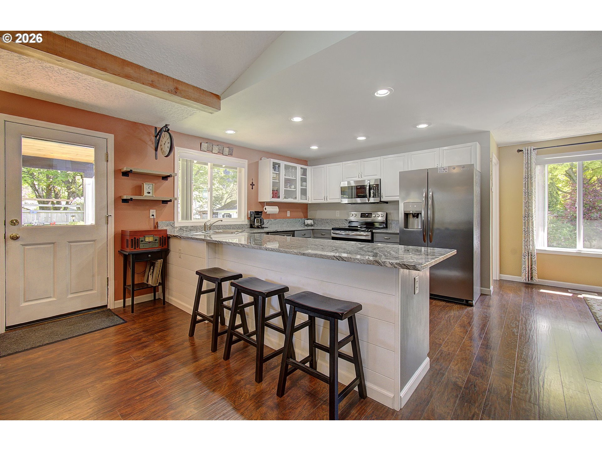 This gorgeous one-level home tucked into a quiet cul-de-sac in a desirable Vancouver no HOA neighborhood has been completely dialed in and thoughtfully updated from top to bottom. Inside, you’ll find vaulted ceilings and an abundance of natural light that make the home feel open, bright, and welcoming. The spacious layout is perfect for everyday living and entertaining, with a gas fireplace adding warmth and character to the main living area. The kitchen is open and beautifully updated with new granite countertops, a pantry, and a unique added space just off the kitchen that functions as a prep kitchen, extra storage, or secondary pantry, complete with its own half bath. Nearly everything has been updated within the last five years, including major items like the roof and furnace, giving peace of mind for years to come. Step outside and the property truly shines. Situated on a third of an acre, the fully fenced yard feels like a private park, filled with mature landscaping, lush greenery, and plenty of open grassy space to enjoy. A large covered deck creates the perfect setting for year-round outdoor entertaining. There are three spacious, newer storage sheds, along with a 40-foot covered RV parking area with a concrete pad—ideal for all your toys and extra storage needs. This home offers the rare combination of comfort, function, and beautifully updated spaces both inside and out.