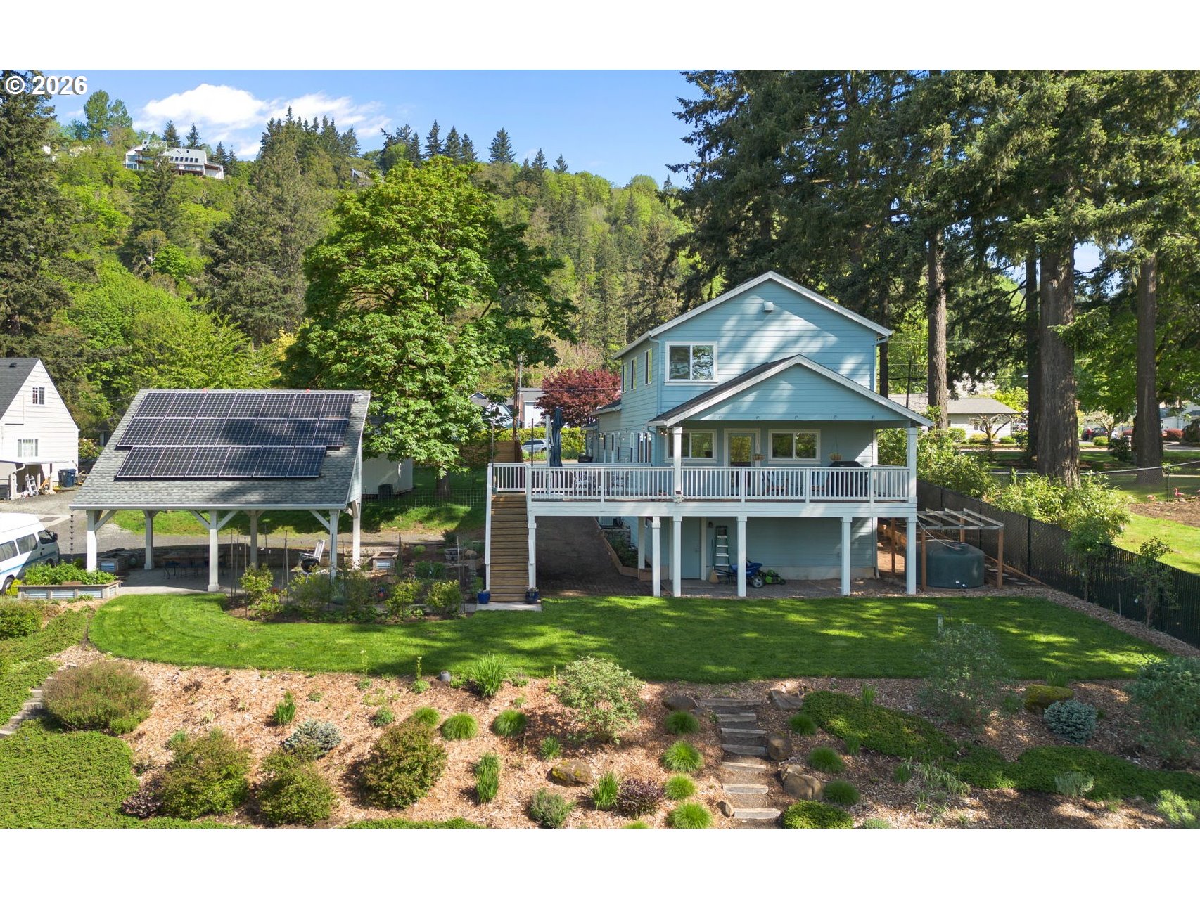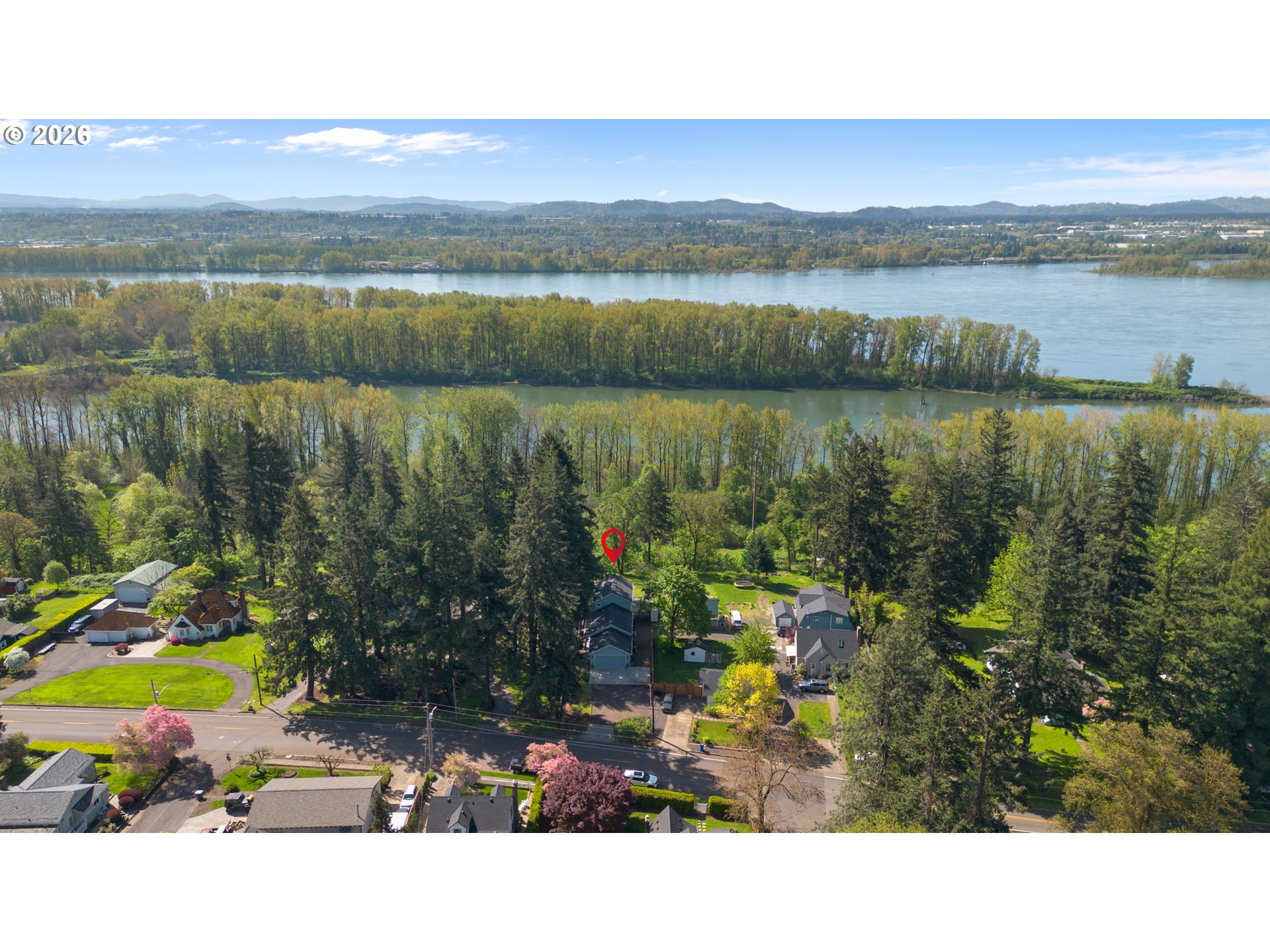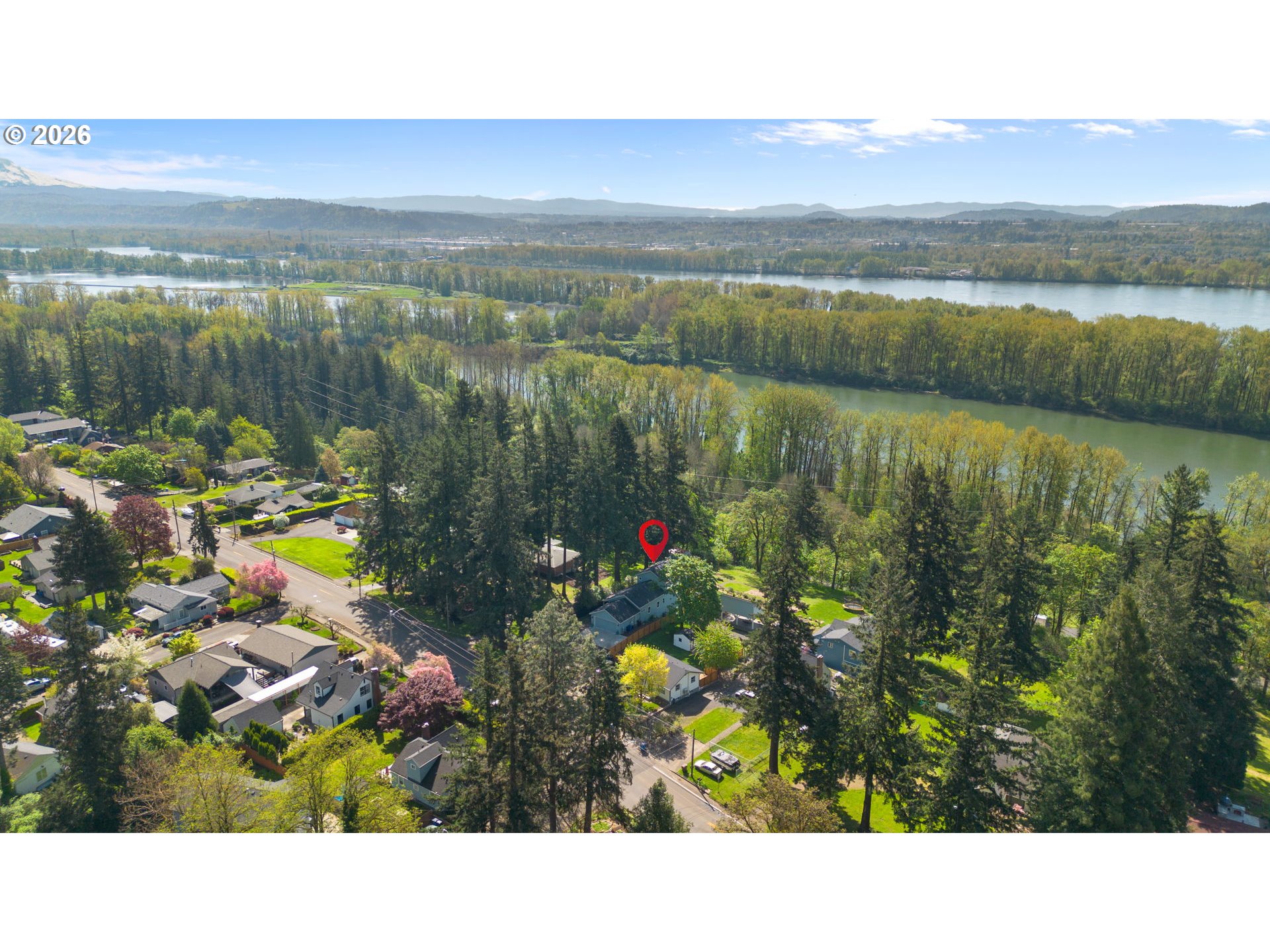 Charming 3-bedroom home in highly sought-after Camas, situated on a spacious 0.42-acre lot with beautiful Columbia River views! Step inside to an inviting open-concept living room filled with natural light and anchored by a cozy gas fireplace. The layout flows seamlessly into the dining area and well-appointed kitchen, featuring stainless steel appliances, a large island with seating, and ample cabinetry for storage.The primary suite is conveniently located on the main level, offering wall-to-wall carpet, a generous closet, and a private en suite bathroom complete with a tiled walk-in shower and dual sink vanity. Upstairs, you’ll find two additional generously sized bedrooms, along with a full hall bath. One bedroom includes access to a finished flex space—perfect for a home office, gym, or extra storage.Enjoy outdoor living on the expansive back deck overlooking the Columbia River, surrounded by thoughtfully designed landscaping on nearly half an acre. The home also features fully paid-off solar panels, providing energy efficiency and long-term cost savings for the next owner.