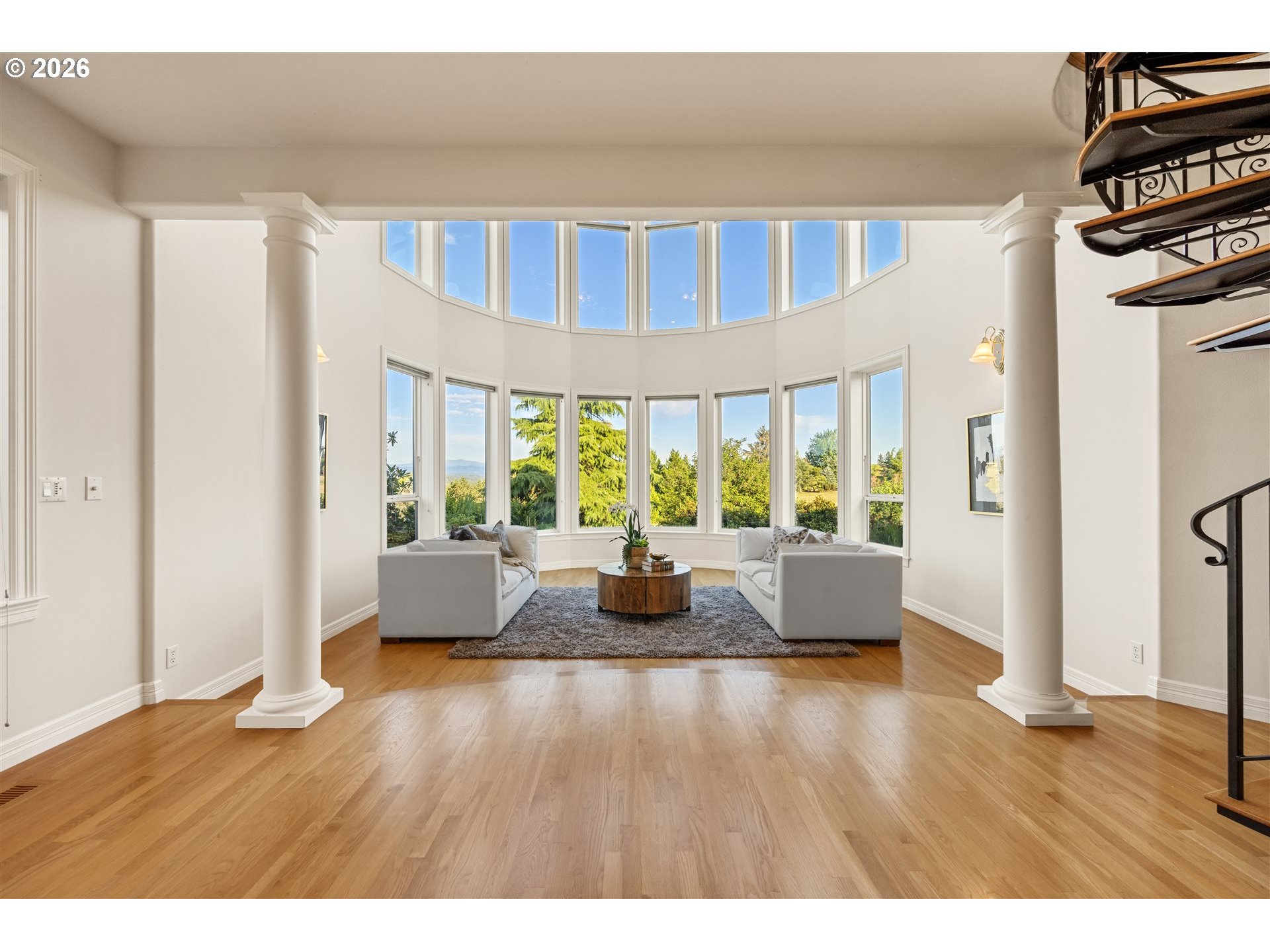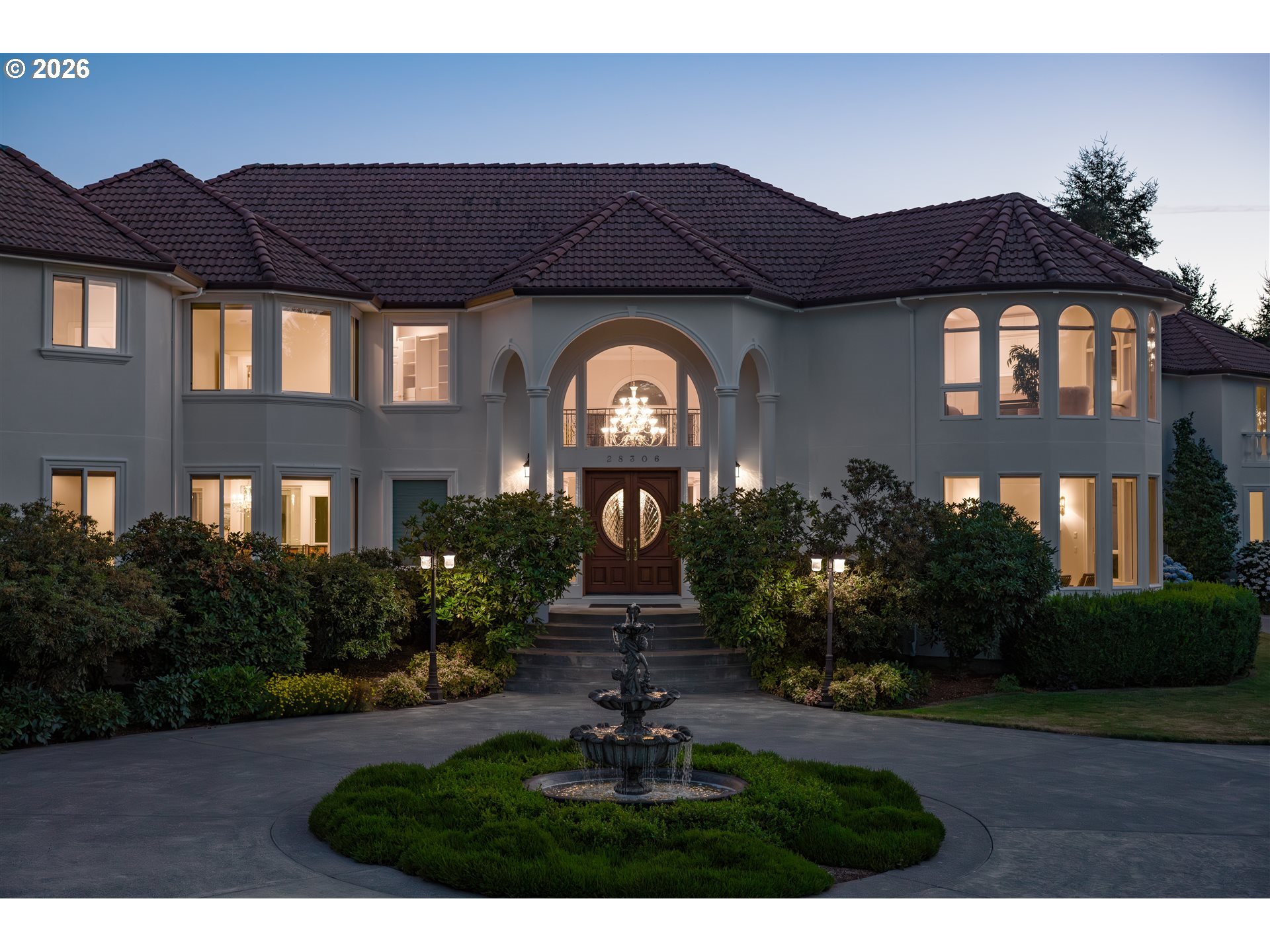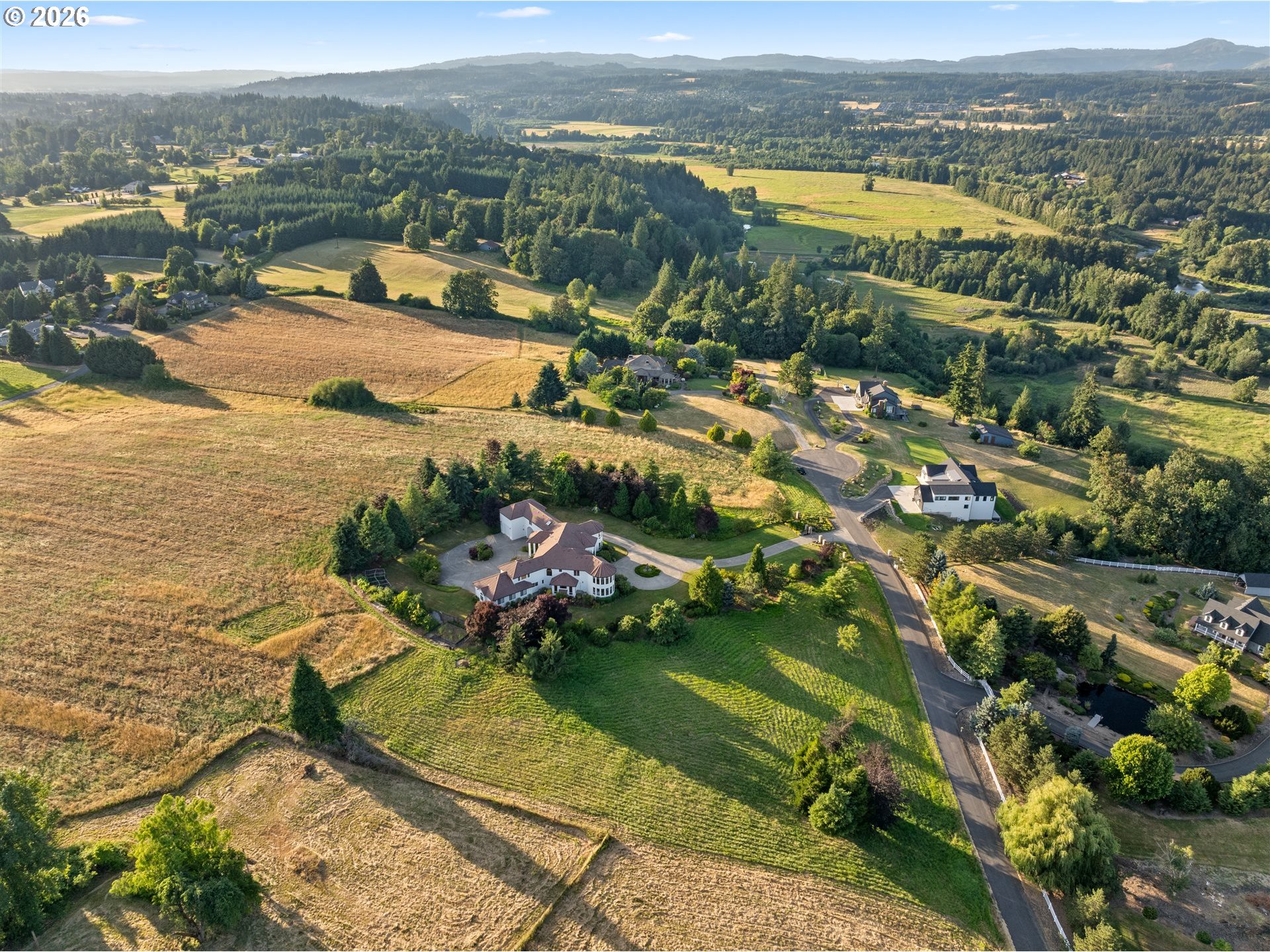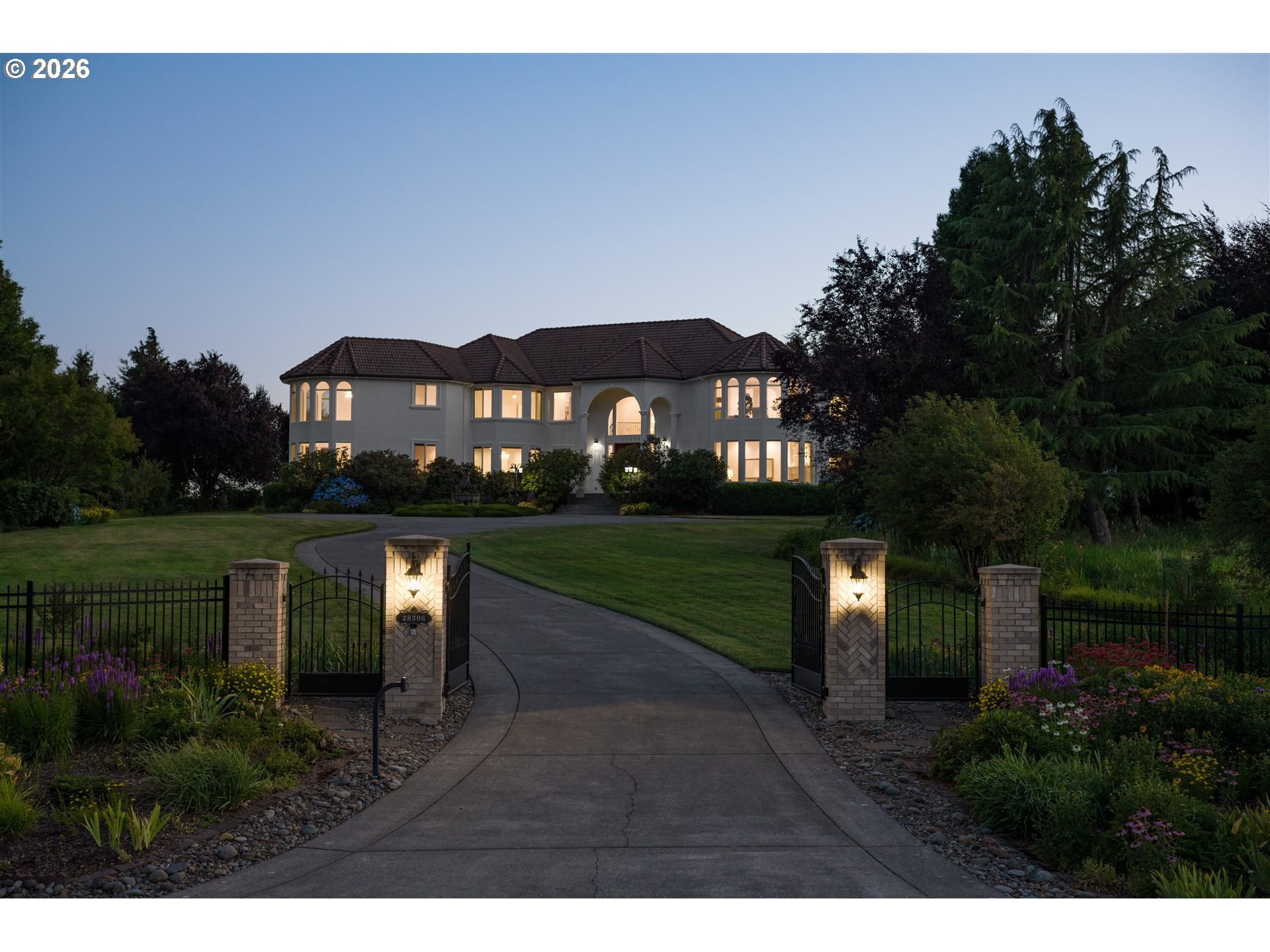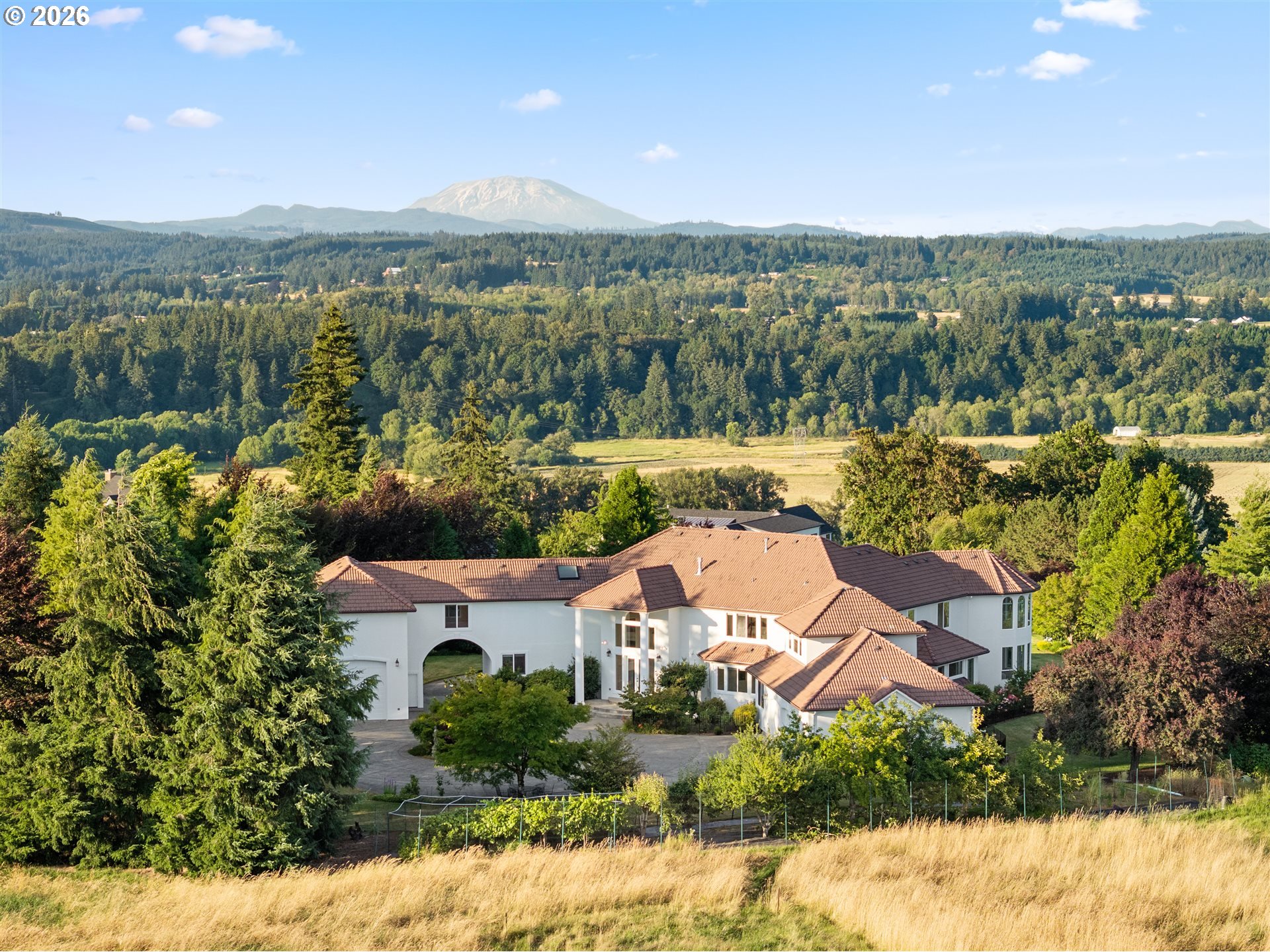 Timeless elegance meets Spanish-inspired charm in this stunning Ridgefield estate perched above the Lewis River. Set on 15 acres of level grounds, the home showcases classic stucco, clay tile roofing, graceful arches, and expansive picture windows framed to capture sweeping views of Mt. Hood, Mt. St. Helens, and the river valley from nearly every room.Enter through a dramatic marble foyer and staircase into formal living and dining rooms and a private office, all detailed with intricate moldings and custom mantles. The living room centers on a grand fireplace with a postcard view of Mt. St. Helens. The U-shaped kitchen offers abundant counter and cabinet space, blending functionality with timeless design.Generous bedrooms provide peaceful retreats; the primary suite is a true sanctuary with a fireplace, walk-in closet, luxurious en-suite bath and jetted tub, and unforgettable vistas of the Lewis River Valley and Mt. St. Helens. Guests will delight in choosing which panoramic view—Helens or Hood—wins their vote.Outdoors, 15 acres invite endless possibilities for gardening, recreation, or simply enjoying serene privacy, while still being minutes from I-5 and Ridgefield’s growing retail amenities. An attached shop adds practical space for hobbies and projects. Elegant, comfortable, and exceptional—this property delivers a luxurious, tranquil lifestyle.