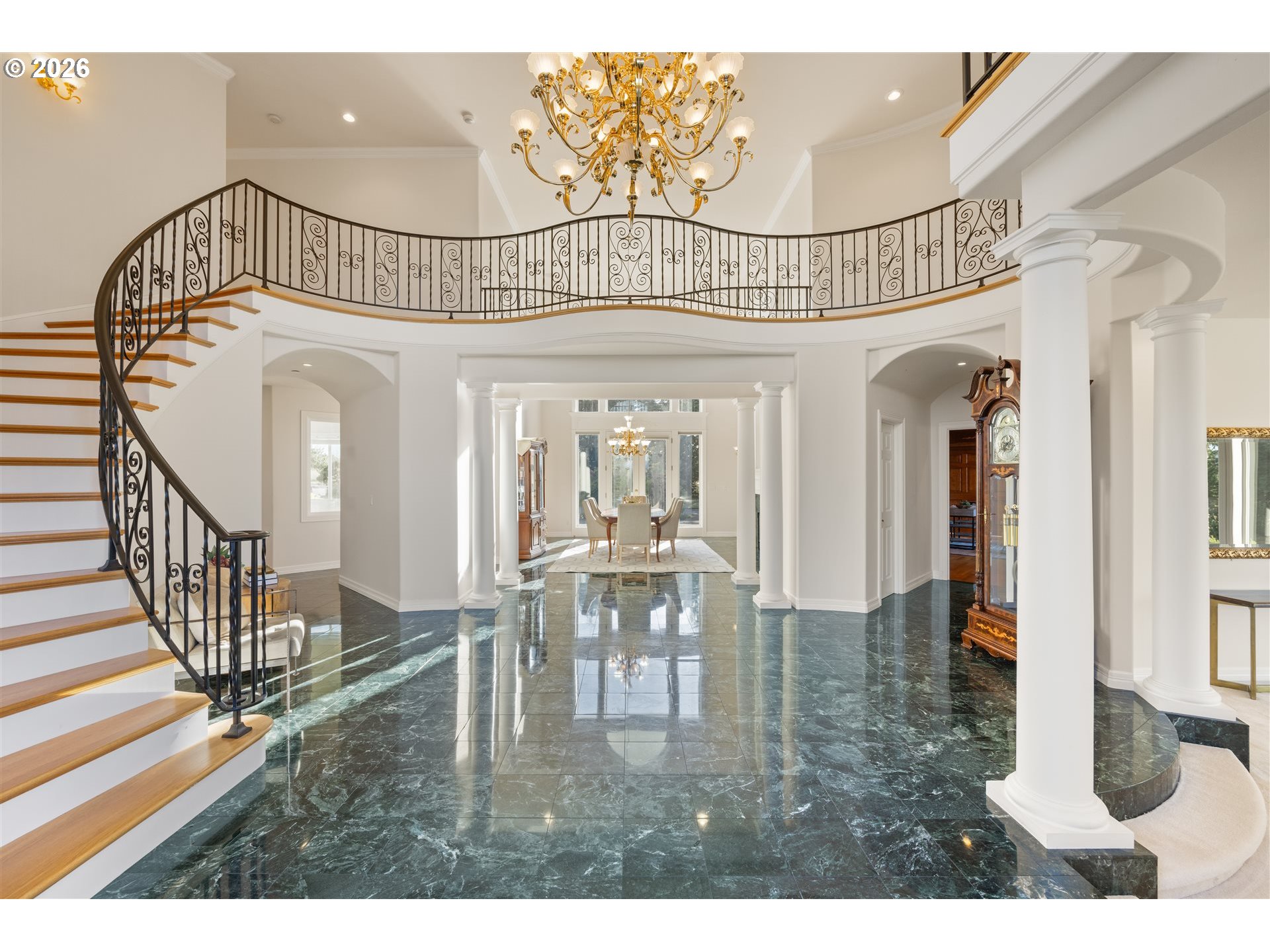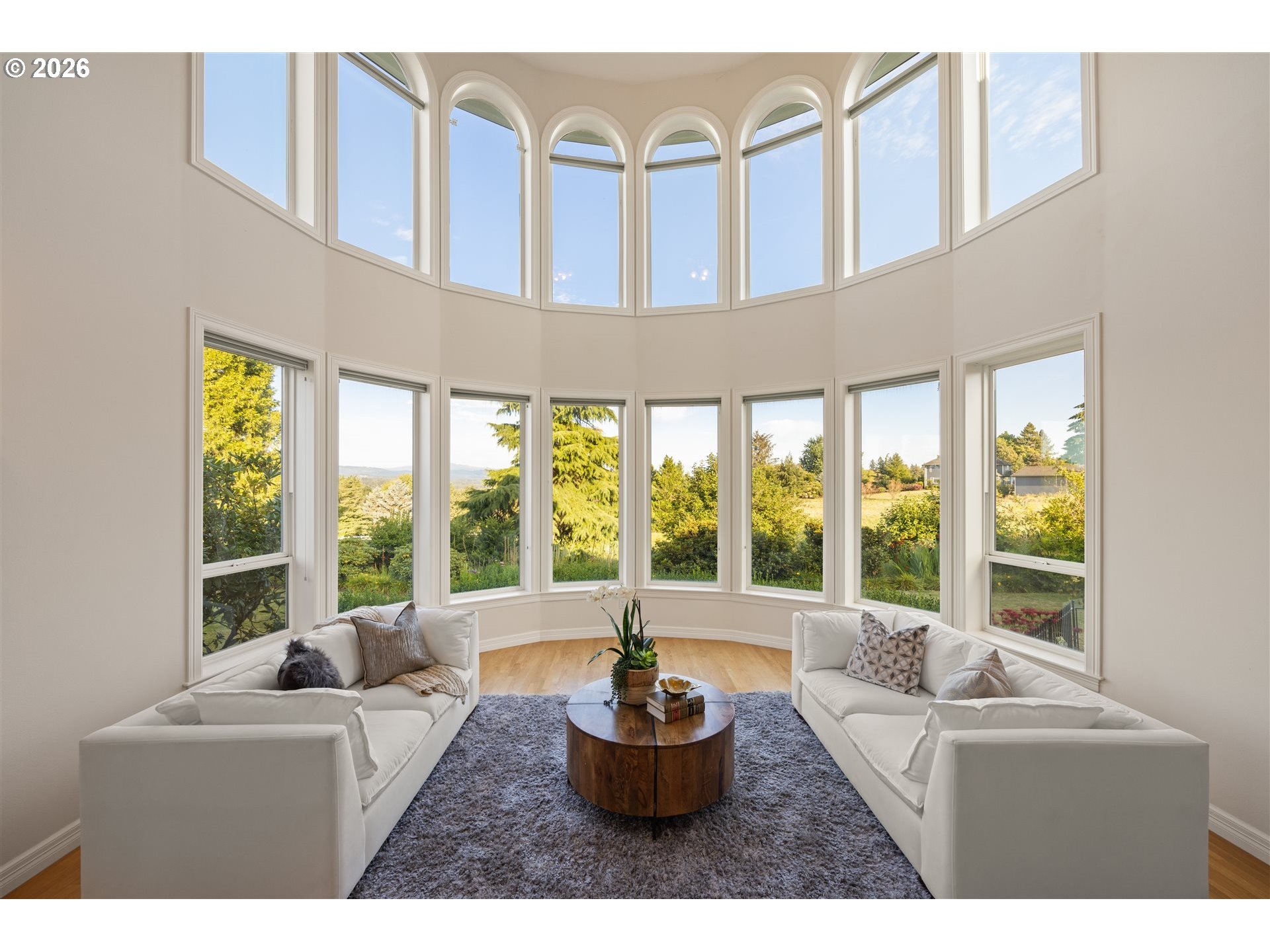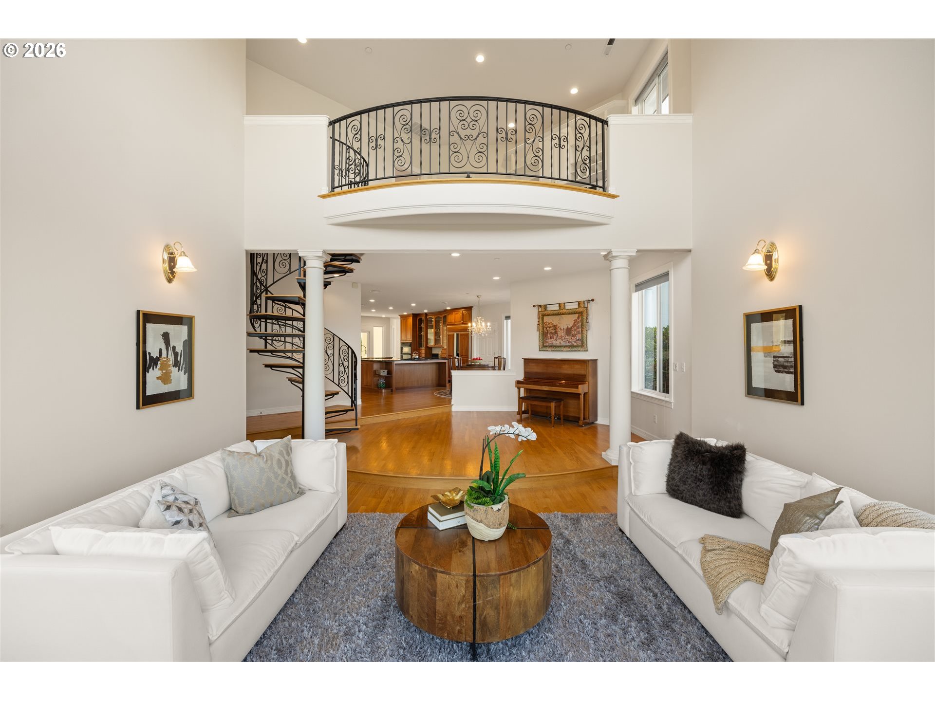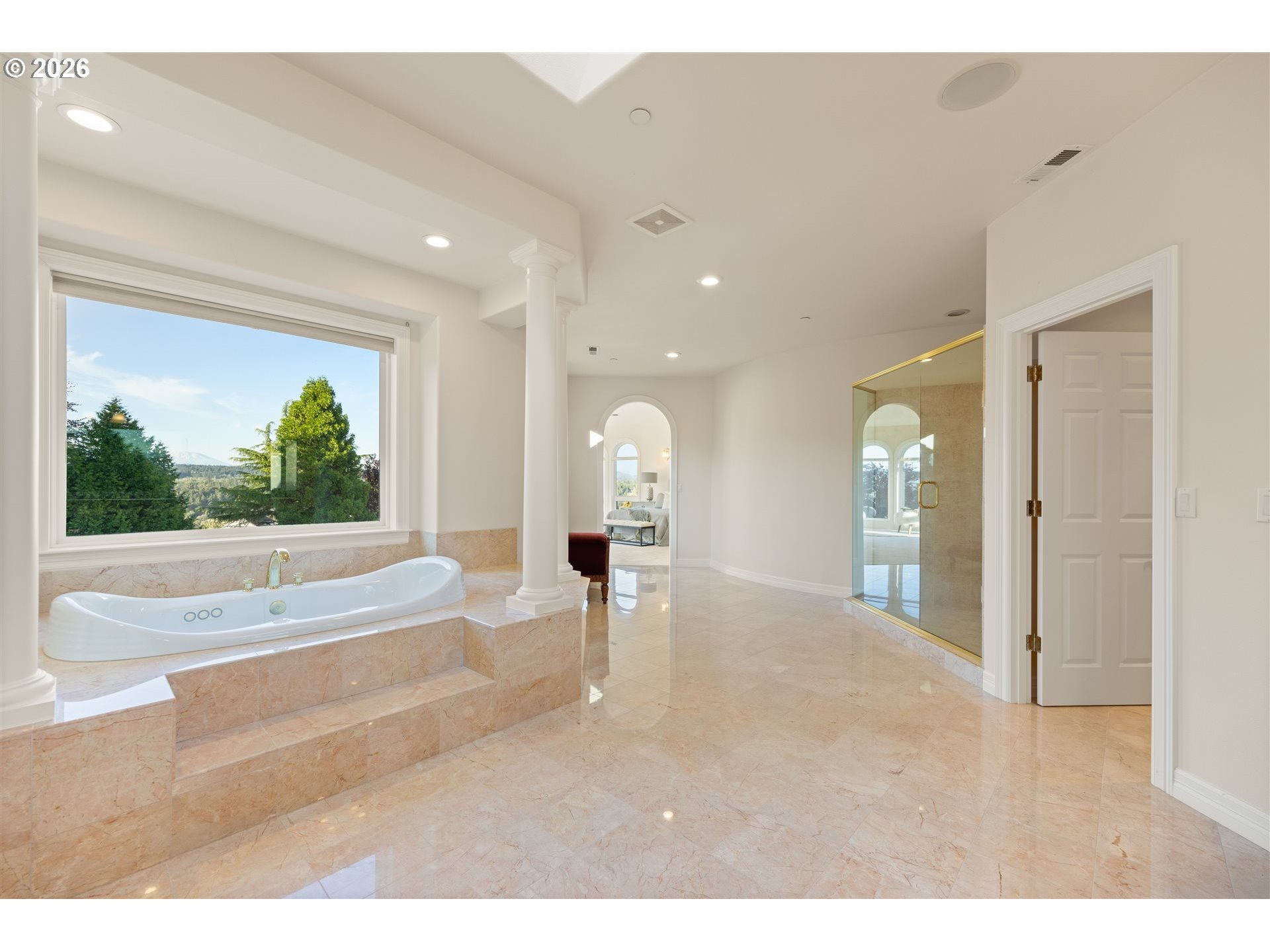 Timeless elegance meets Spanish-inspired charm in this stunning Ridgefield estate perched above the Lewis River. Set on 15 acres of level grounds, the home showcases classic stucco, clay tile roofing, graceful arches, and expansive picture windows framed to capture sweeping views of Mt. Hood, Mt. St. Helens, and the river valley from nearly every room.Enter through a dramatic marble foyer and staircase into formal living and dining rooms and a private office, all detailed with intricate moldings and custom mantles. The living room centers on a grand fireplace with a postcard view of Mt. St. Helens. The U-shaped kitchen offers abundant counter and cabinet space, blending functionality with timeless design.Generous bedrooms provide peaceful retreats; the primary suite is a true sanctuary with a fireplace, walk-in closet, luxurious en-suite bath and jetted tub, and unforgettable vistas of the Lewis River Valley and Mt. St. Helens. Guests will delight in choosing which panoramic view—Helens or Hood—wins their vote.Outdoors, 15 acres invite endless possibilities for gardening, recreation, or simply enjoying serene privacy, while still being minutes from I-5 and Ridgefield’s growing retail amenities. An attached shop adds practical space for hobbies and projects. Elegant, comfortable, and exceptional—this property delivers a luxurious, tranquil lifestyle.