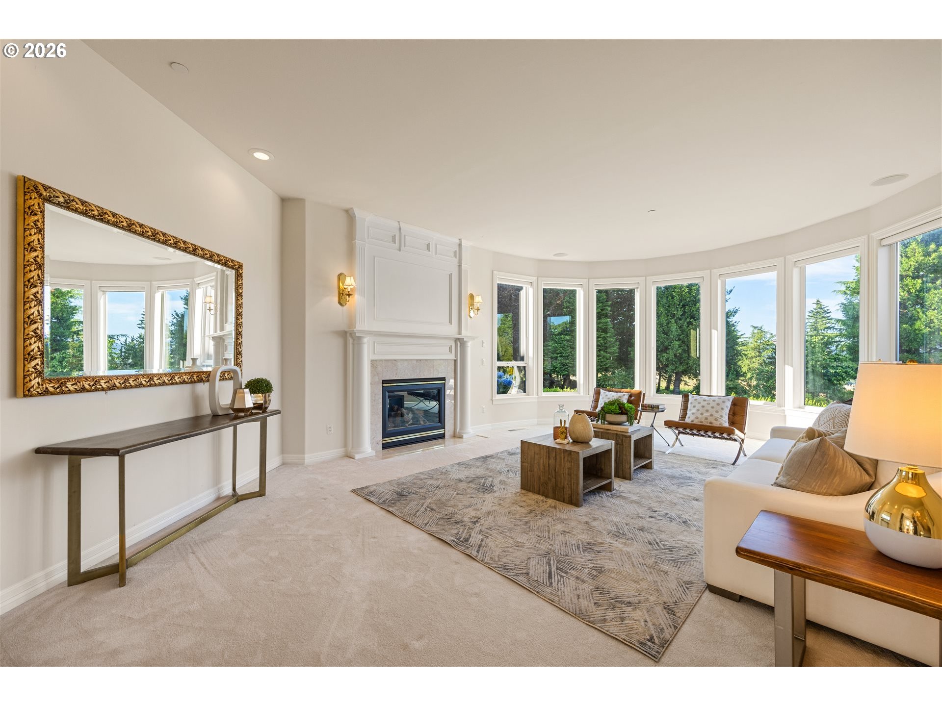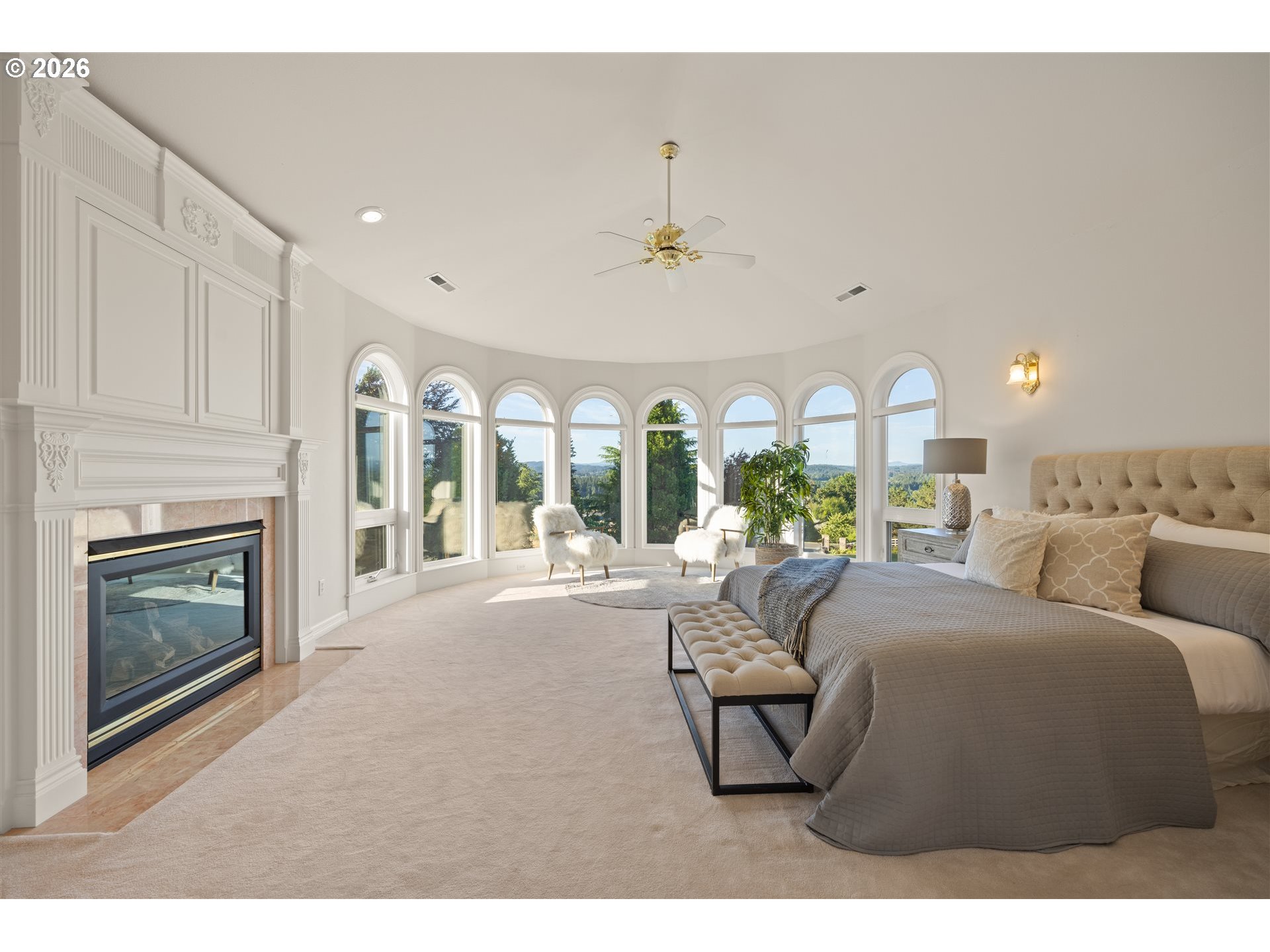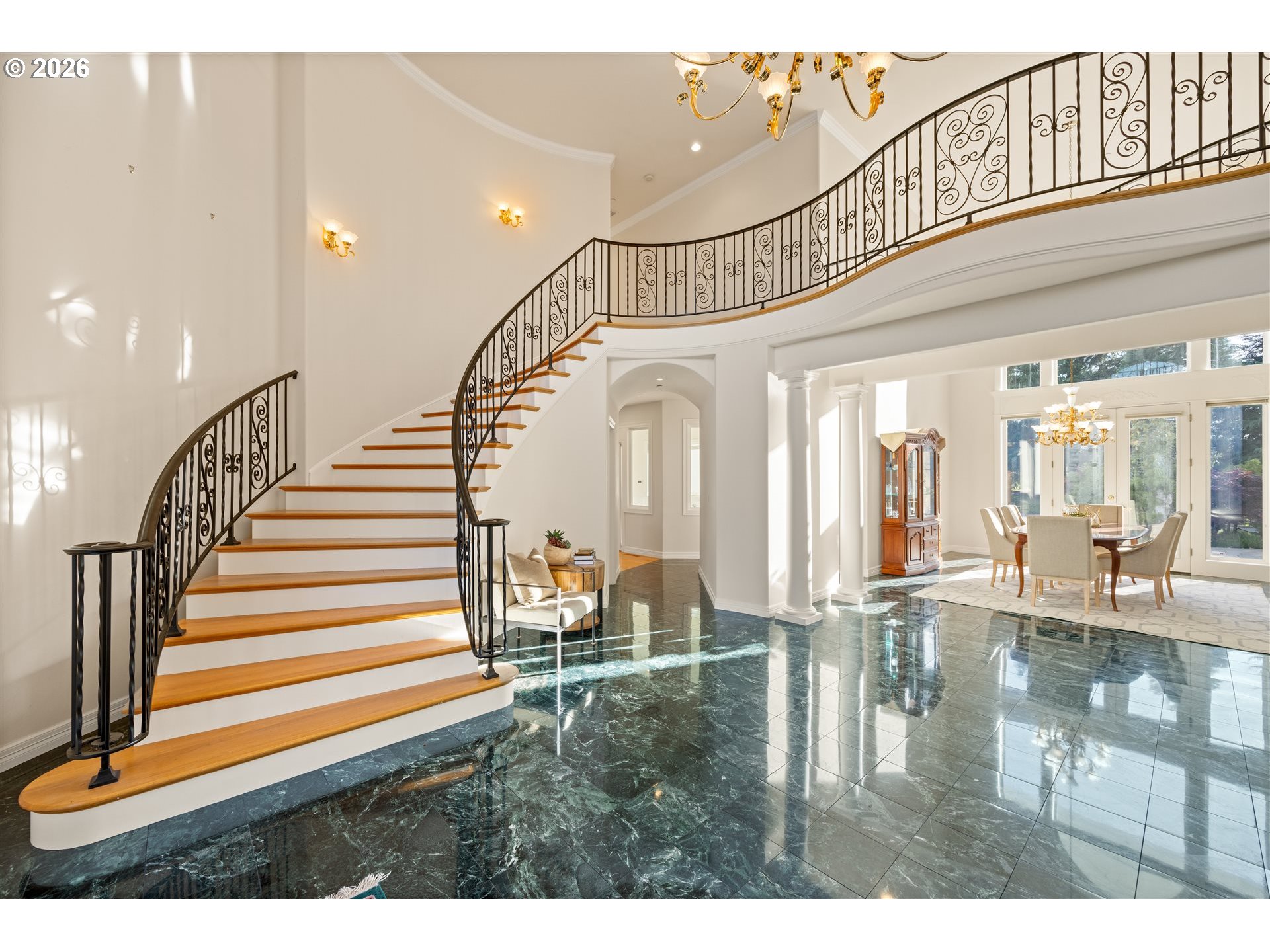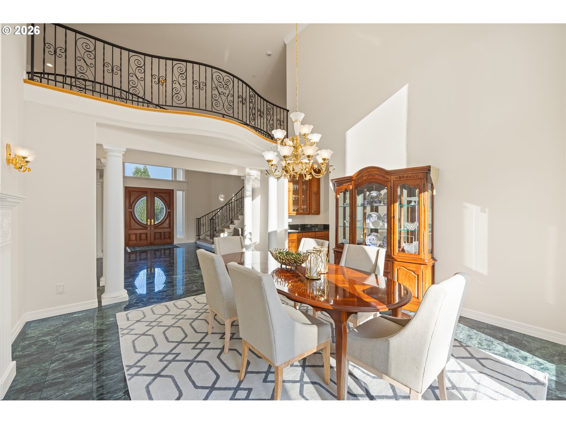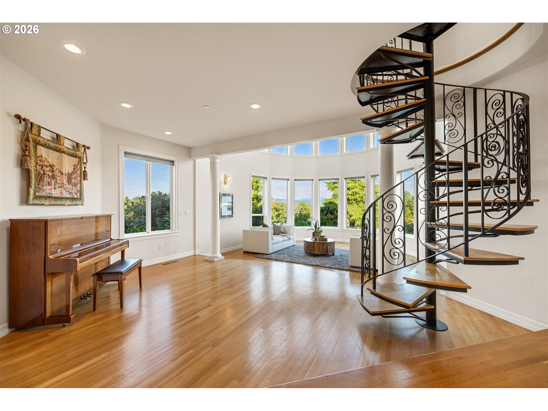 Timeless elegance meets Spanish-inspired charm in this stunning Ridgefield estate perched above the Lewis River. Set on 15 acres of level grounds, the home showcases classic stucco, clay tile roofing, graceful arches, and expansive picture windows framed to capture sweeping views of Mt. Hood, Mt. St. Helens, and the river valley from nearly every room.Enter through a dramatic marble foyer and staircase into formal living and dining rooms and a private office, all detailed with intricate moldings and custom mantles. The living room centers on a grand fireplace with a postcard view of Mt. St. Helens. The U-shaped kitchen offers abundant counter and cabinet space, blending functionality with timeless design.Generous bedrooms provide peaceful retreats; the primary suite is a true sanctuary with a fireplace, walk-in closet, luxurious en-suite bath and jetted tub, and unforgettable vistas of the Lewis River Valley and Mt. St. Helens. Guests will delight in choosing which panoramic view—Helens or Hood—wins their vote.Outdoors, 15 acres invite endless possibilities for gardening, recreation, or simply enjoying serene privacy, while still being minutes from I-5 and Ridgefield’s growing retail amenities. An attached shop adds practical space for hobbies and projects. Elegant, comfortable, and exceptional—this property delivers a luxurious, tranquil lifestyle.