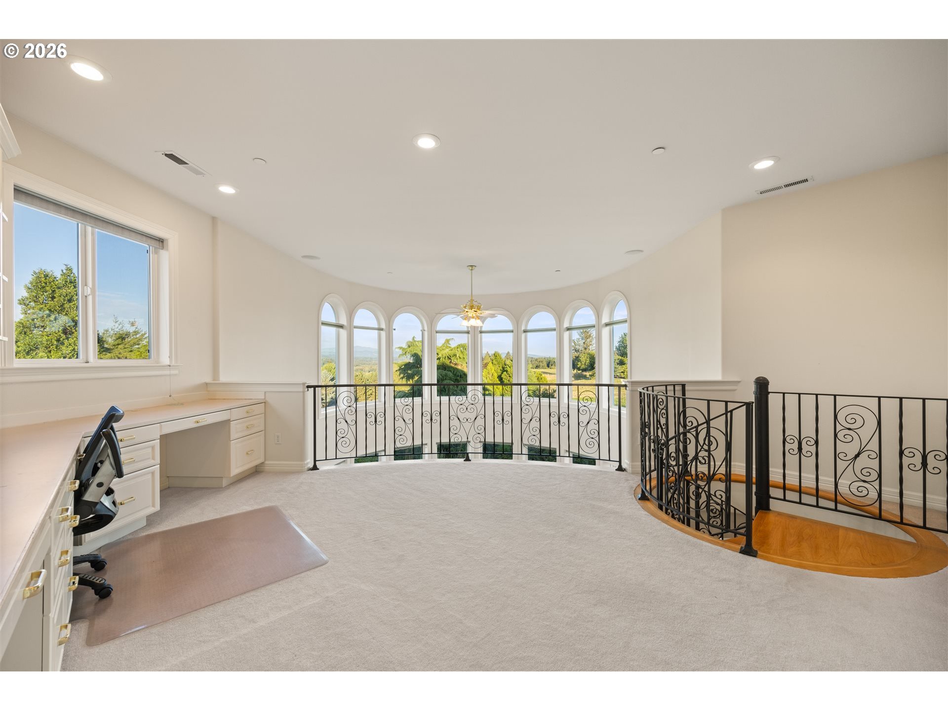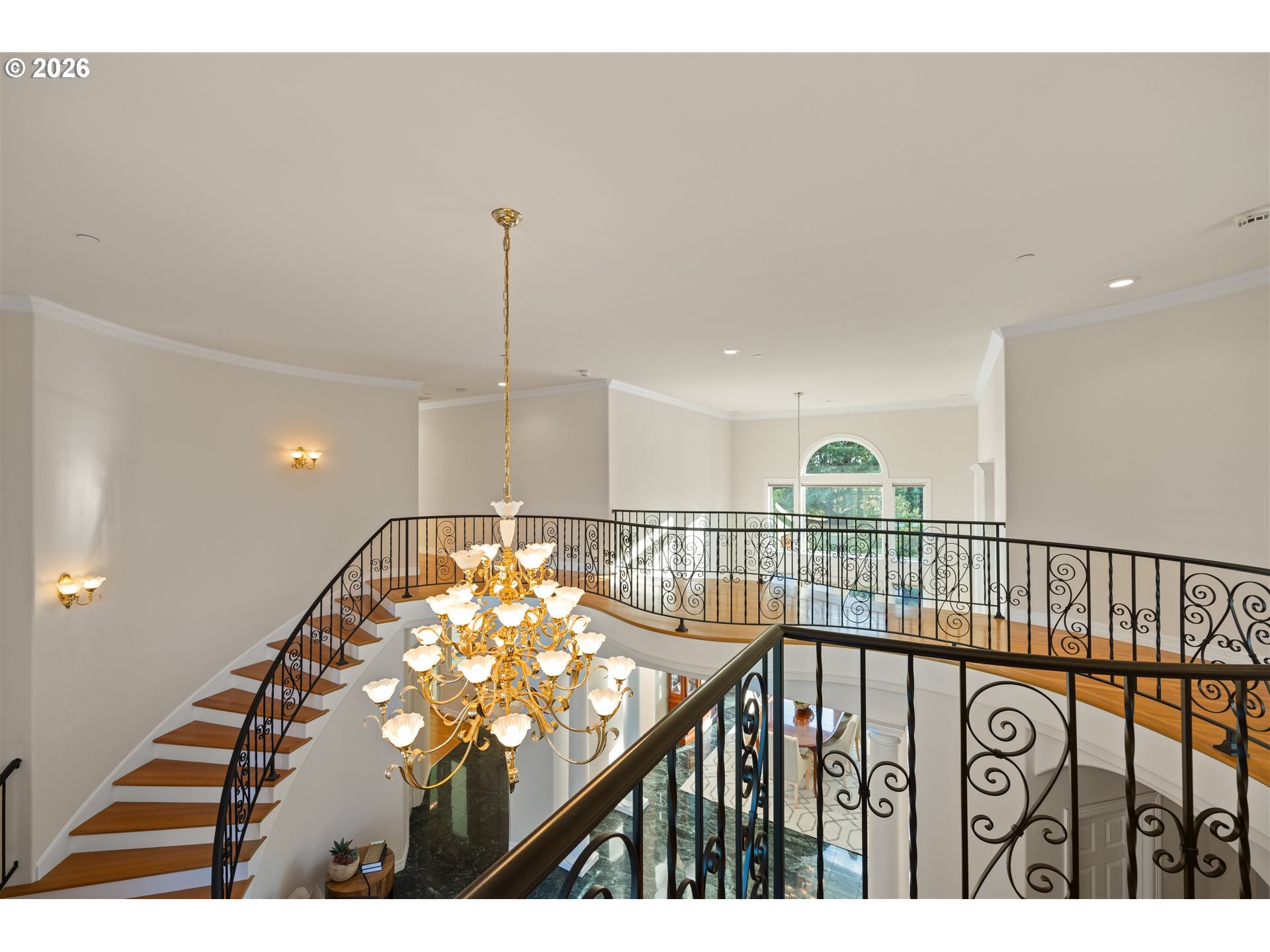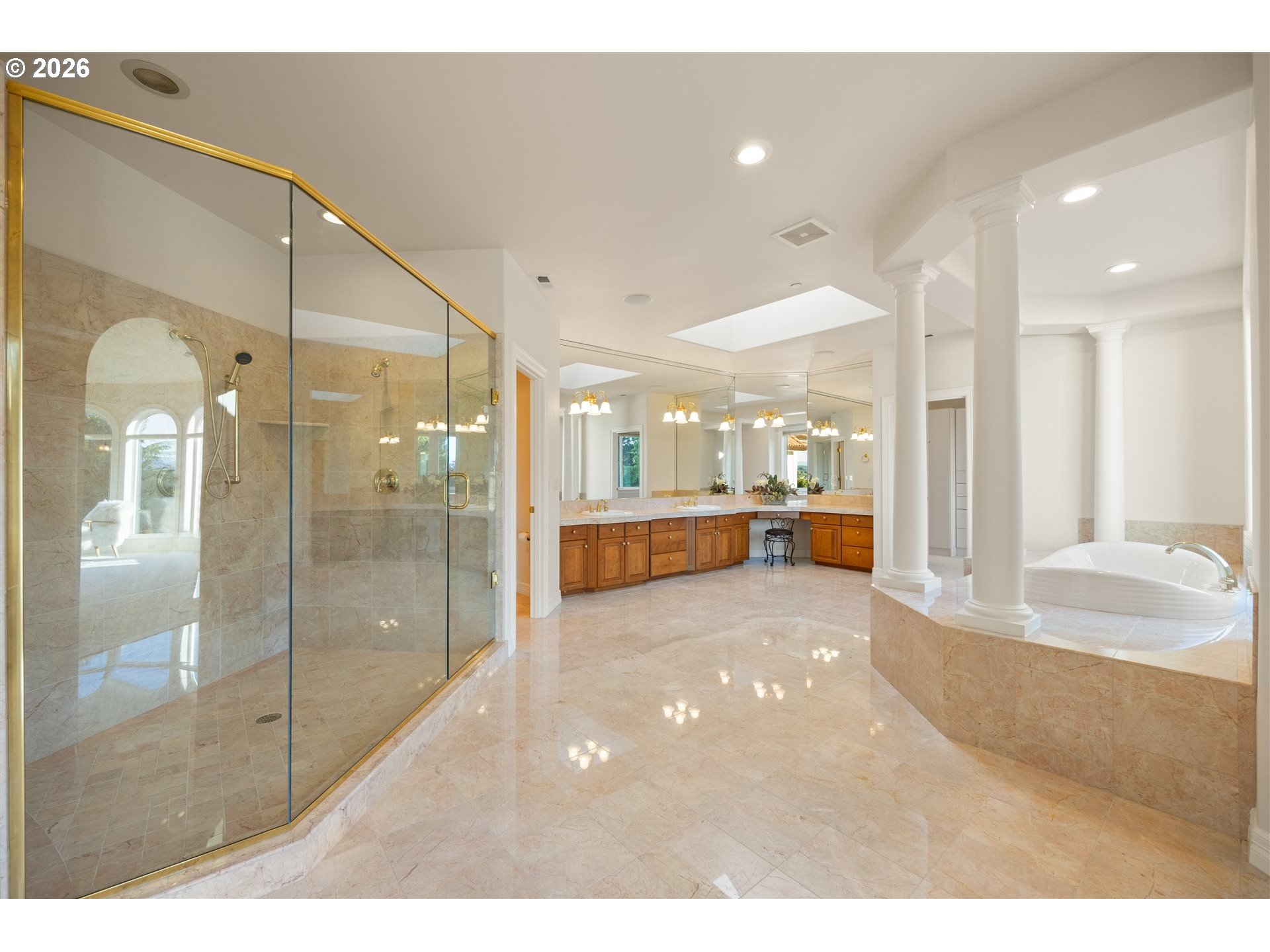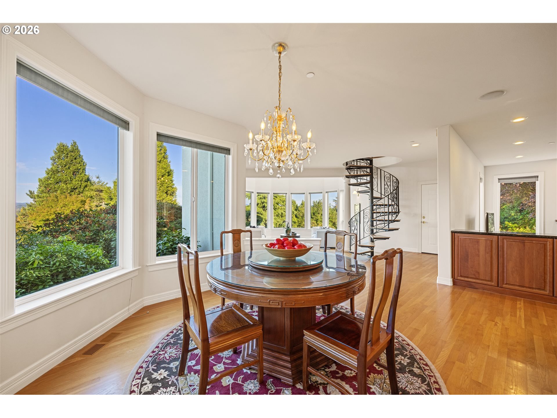 Timeless elegance meets Spanish-inspired charm in this stunning Ridgefield estate perched above the Lewis River. Set on 15 acres of level grounds, the home showcases classic stucco, clay tile roofing, graceful arches, and expansive picture windows framed to capture sweeping views of Mt. Hood, Mt. St. Helens, and the river valley from nearly every room.Enter through a dramatic marble foyer and staircase into formal living and dining rooms and a private office, all detailed with intricate moldings and custom mantles. The living room centers on a grand fireplace with a postcard view of Mt. St. Helens. The U-shaped kitchen offers abundant counter and cabinet space, blending functionality with timeless design.Generous bedrooms provide peaceful retreats; the primary suite is a true sanctuary with a fireplace, walk-in closet, luxurious en-suite bath and jetted tub, and unforgettable vistas of the Lewis River Valley and Mt. St. Helens. Guests will delight in choosing which panoramic view—Helens or Hood—wins their vote.Outdoors, 15 acres invite endless possibilities for gardening, recreation, or simply enjoying serene privacy, while still being minutes from I-5 and Ridgefield’s growing retail amenities. An attached shop adds practical space for hobbies and projects. Elegant, comfortable, and exceptional—this property delivers a luxurious, tranquil lifestyle.