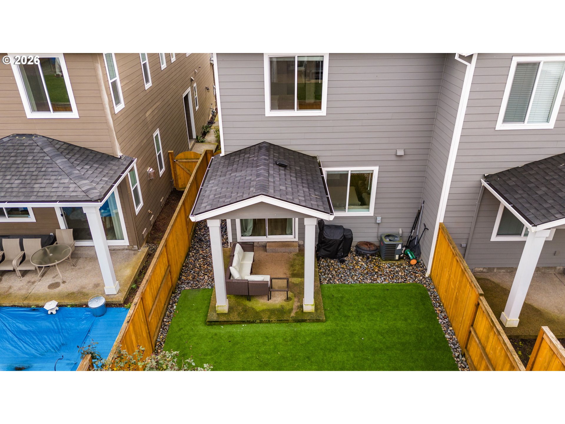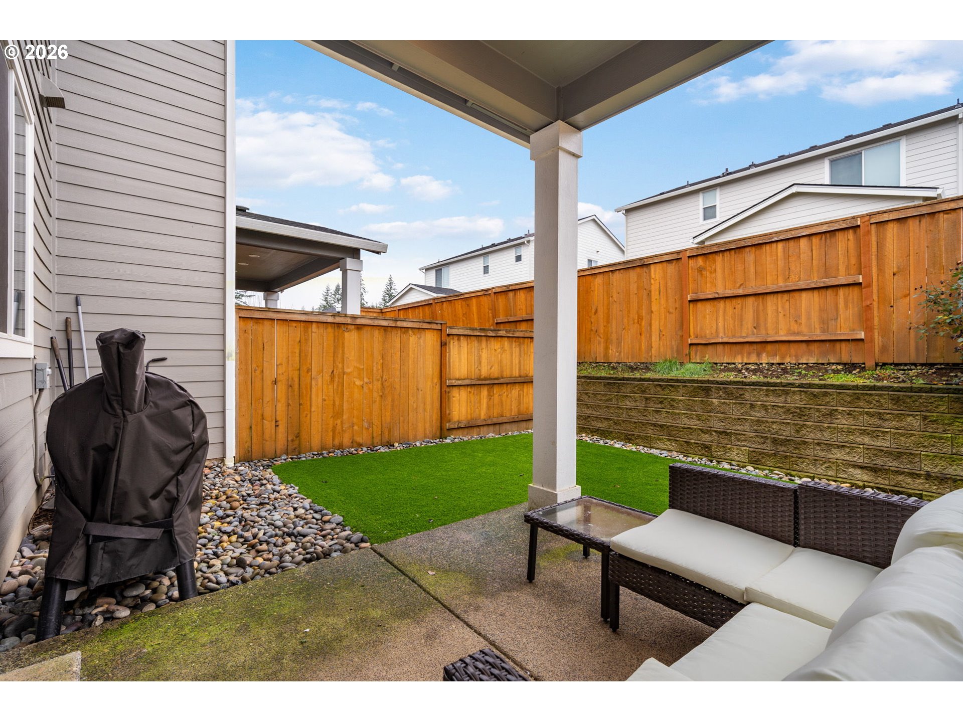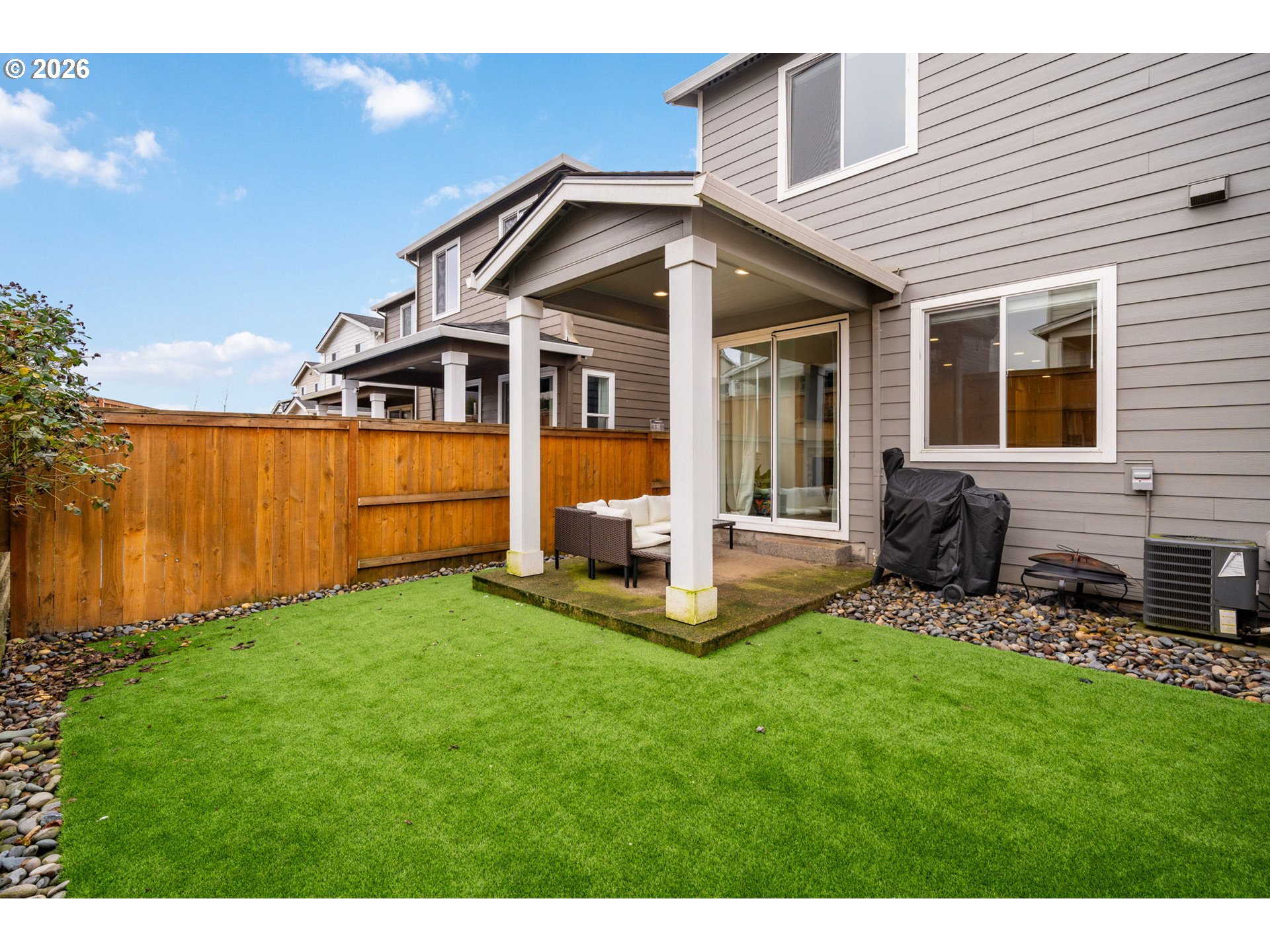 This beautiful, newer townhome truly stands out from the competition, offering many upgrades for its price point. Features include 9-foot ceilings, tall doors, and a light, bright interior with laminate flooring throughout the main. The kitchen and bathrooms showcase quartz countertops and crisp white painted cabinetry. The inviting great room includes a cozy fireplace and flows seamlessly into the dining area, making it ideal for everyday living and entertaining. A convenient powder bath is located on the main level. Upstairs, you’ll find a spacious layout highlighted by a lovely primary suite with a generous walk-in closet. The laundry room is conveniently located on the upper level. A hallway bathroom offers a double-sink vanity and a tub/shower combination. Outside, enjoy a covered patio and a low-maintenance backyard featuring fresh, green AstroTurf that looks great year-round. Ideally located with excellent access to freeways, shopping, trails, and downtown Ridgefield, this home offers both comfort and convenience.