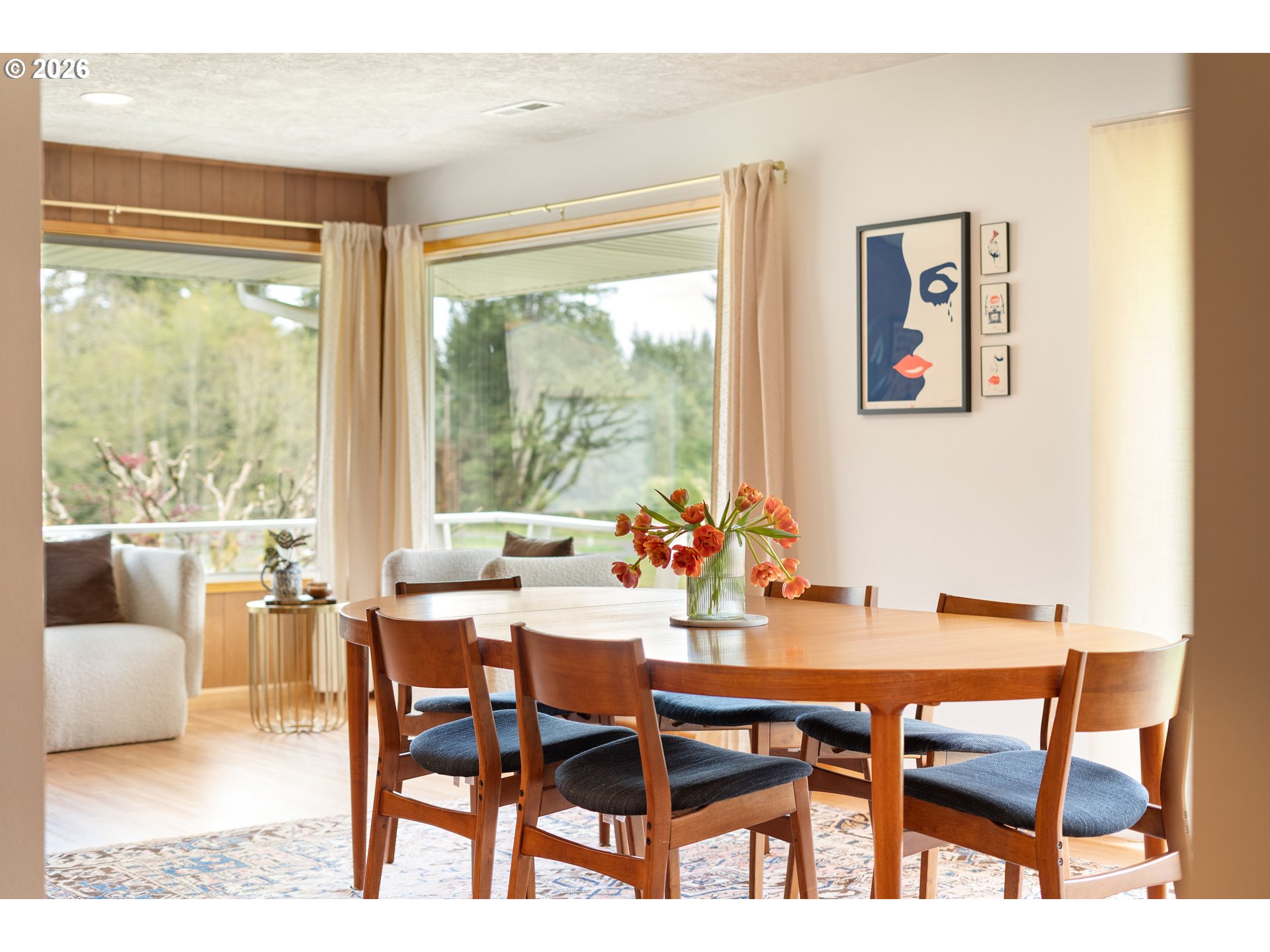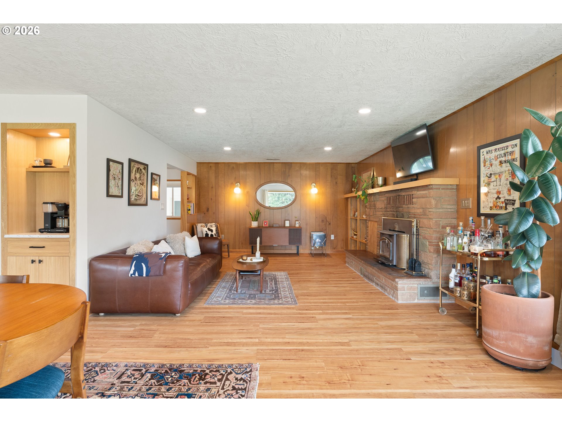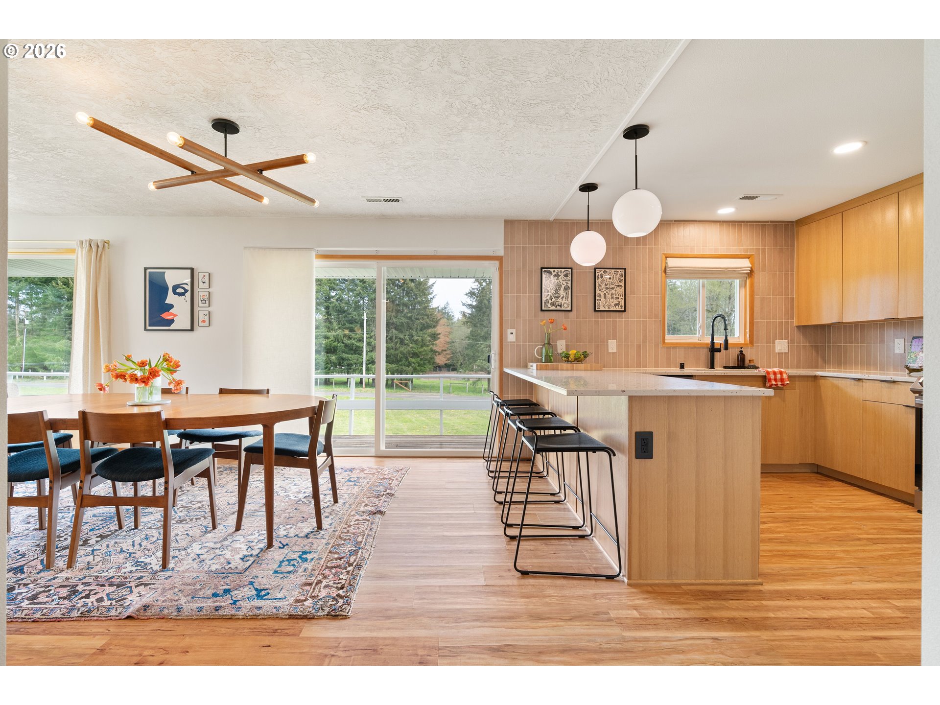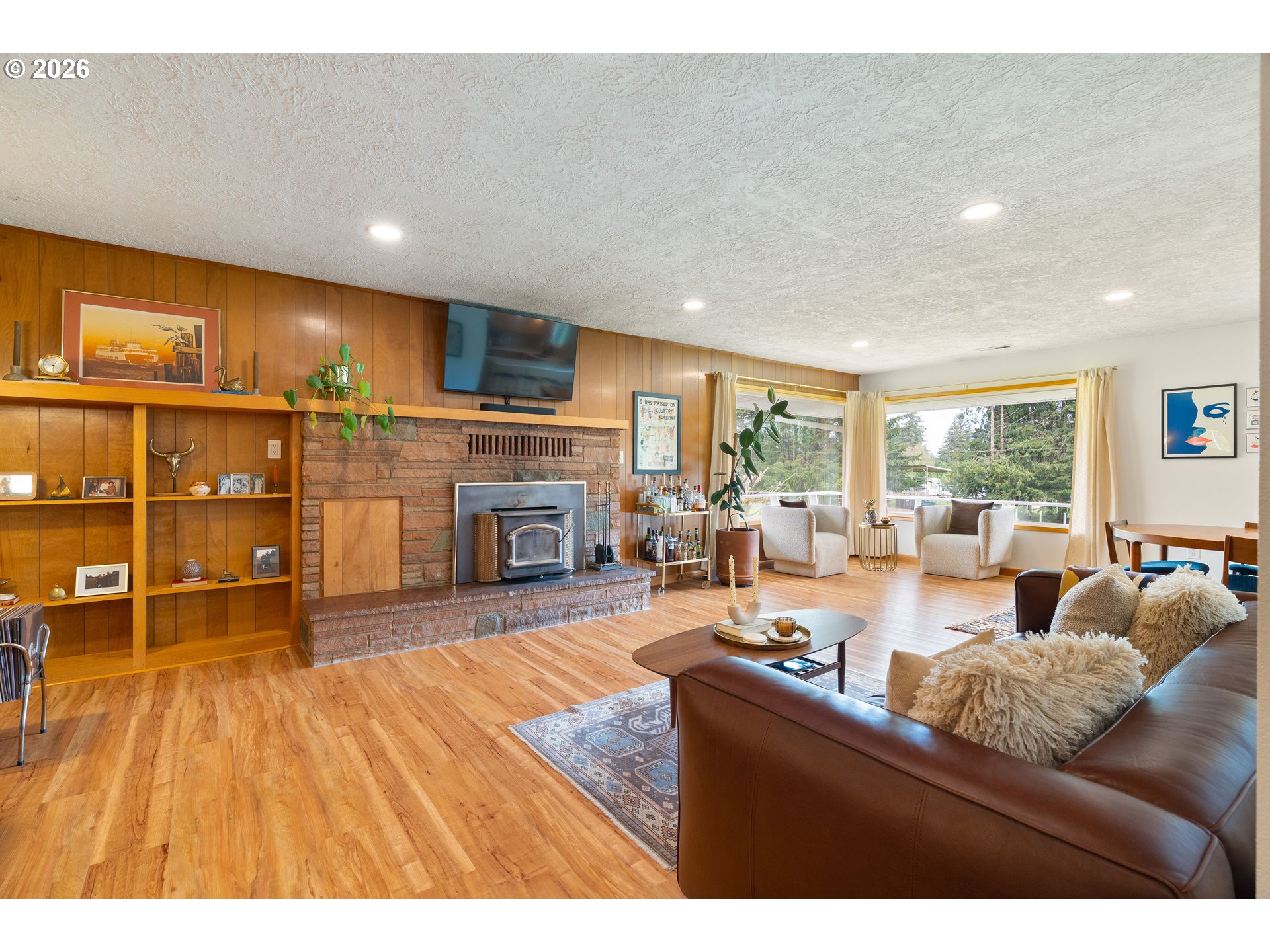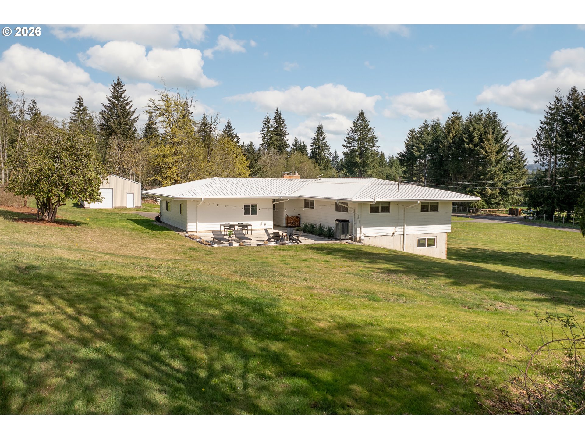 Built in 1962 and nestled on 2.5+ acres in La Center, this authentic mid-century modern home has been lovingly updated from top to bottom while preserving every bit of its original charm. A remodeled kitchen with custom cabinetry, terrazzo-style counters & a coffee bar/nook. A dramatic brick fireplace for cozy evenings. A string-lit concrete patio for backyard gatherings. A primary suite with serene wooded views. Fully remodeled bathrooms on the main level, newer furnace & heat pump, updated electrical panel & so much more. Add chickens, a large shop, deck & plenty of space for your boat/RV — and you have everything you need to live slowly, intentionally & beautifully. This is the life you've been dreaming of. Newer furnace & heat pump (2024), updated electrical panels (2026), new water heater & water filter (2025), replaced well tank (2024) & fresh exterior paint — this home is truly move-in ready.