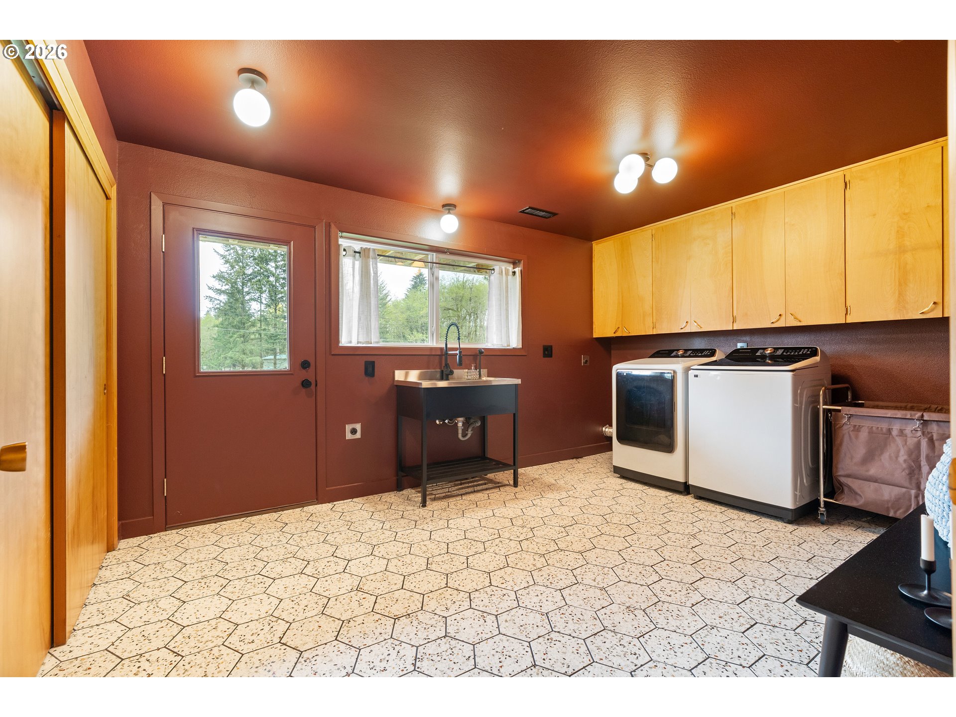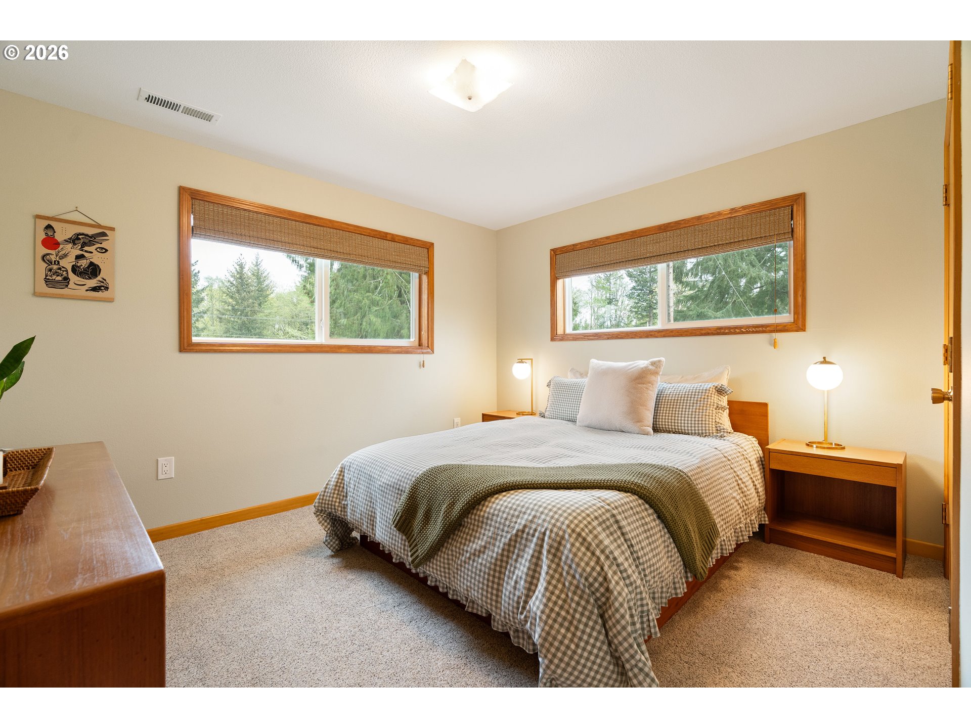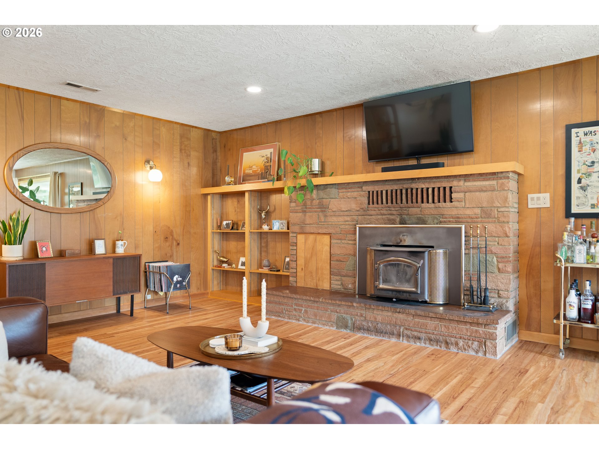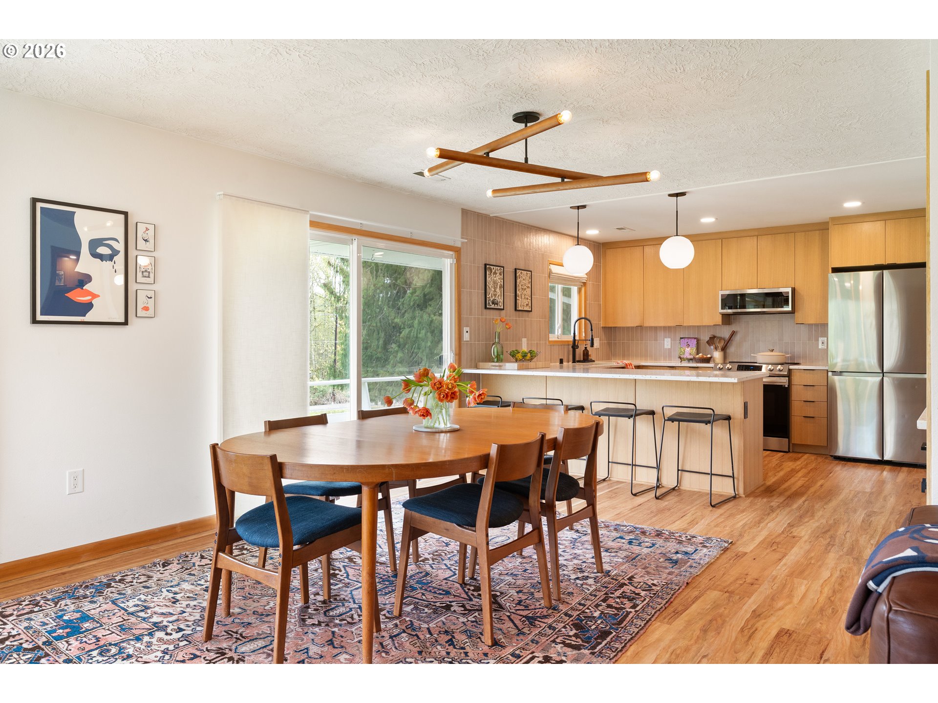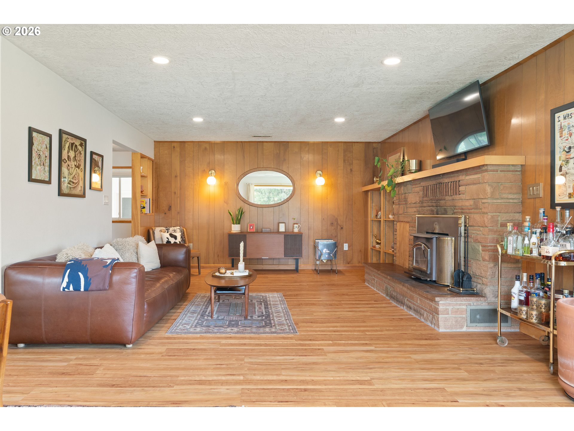 Built in 1962 and nestled on 2.5+ acres in La Center, this authentic mid-century modern home has been lovingly updated from top to bottom while preserving every bit of its original charm. A remodeled kitchen with custom cabinetry, terrazzo-style counters & a coffee bar/nook. A dramatic brick fireplace for cozy evenings. A string-lit concrete patio for backyard gatherings. A primary suite with serene wooded views. Fully remodeled bathrooms on the main level, newer furnace & heat pump, updated electrical panel & so much more. Add chickens, a large shop, deck & plenty of space for your boat/RV — and you have everything you need to live slowly, intentionally & beautifully. This is the life you've been dreaming of. Newer furnace & heat pump (2024), updated electrical panels (2026), new water heater & water filter (2025), replaced well tank (2024) & fresh exterior paint — this home is truly move-in ready.