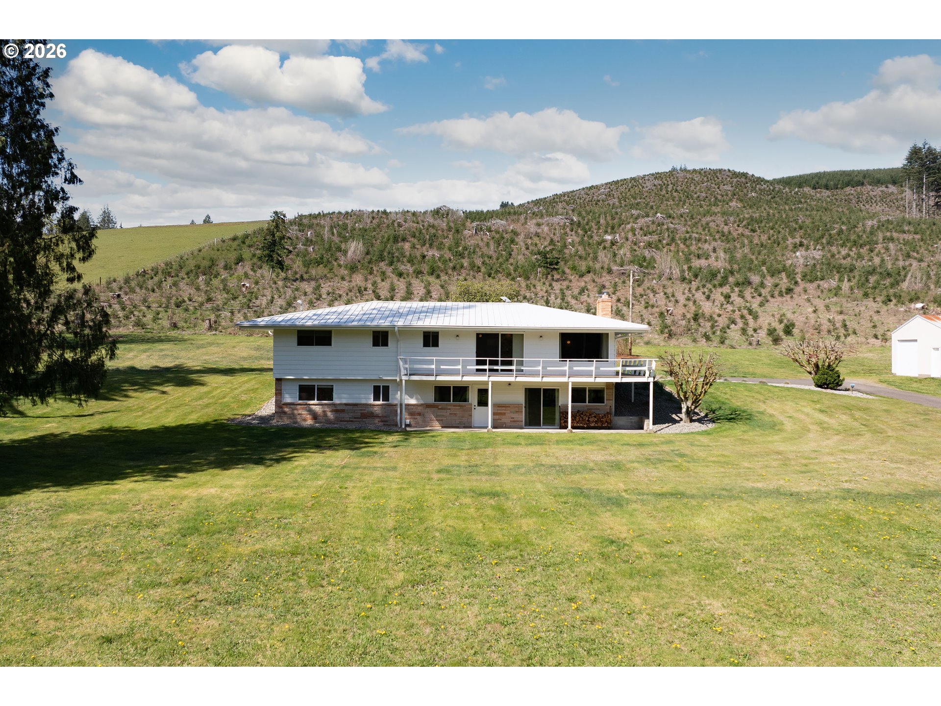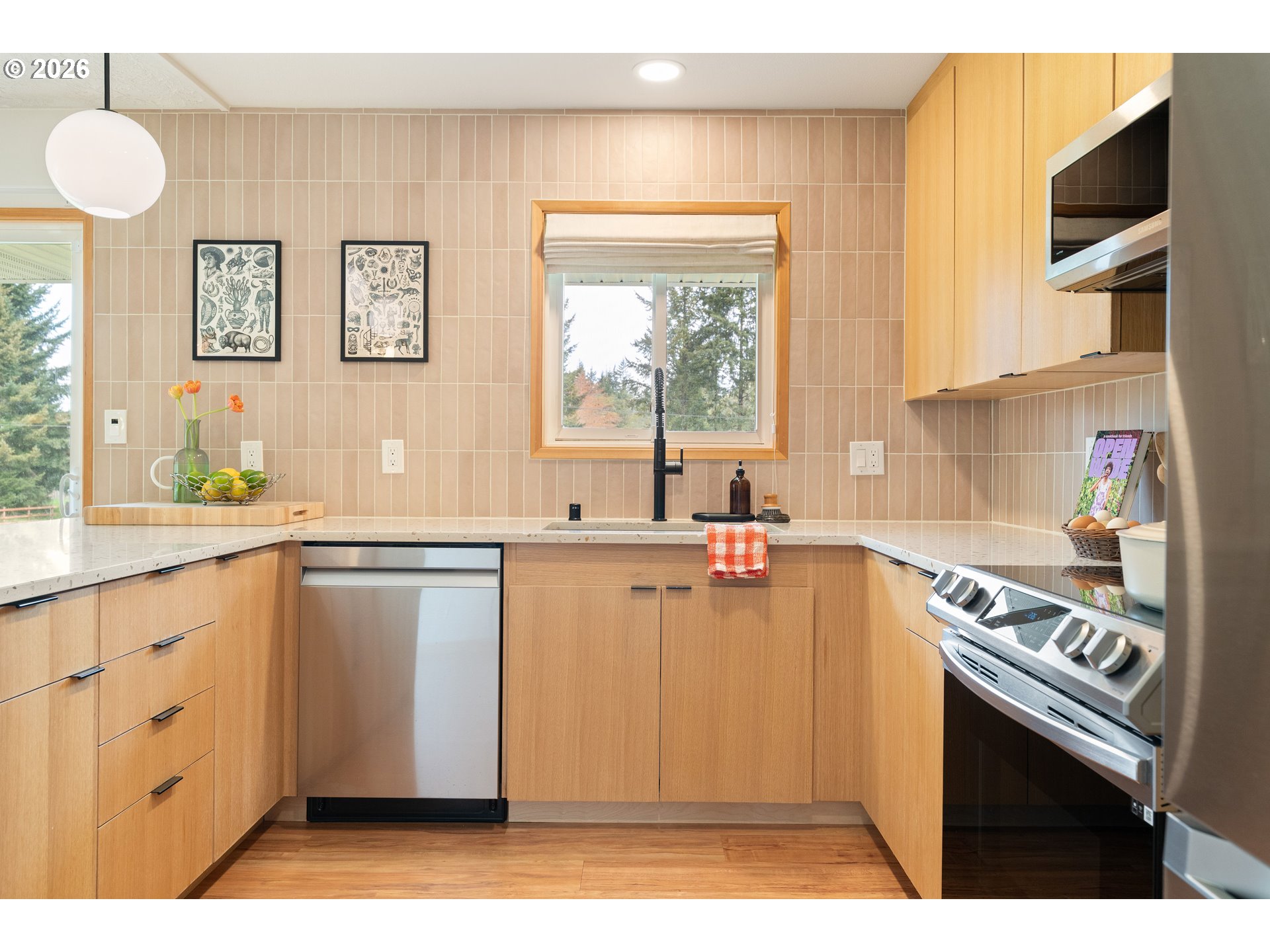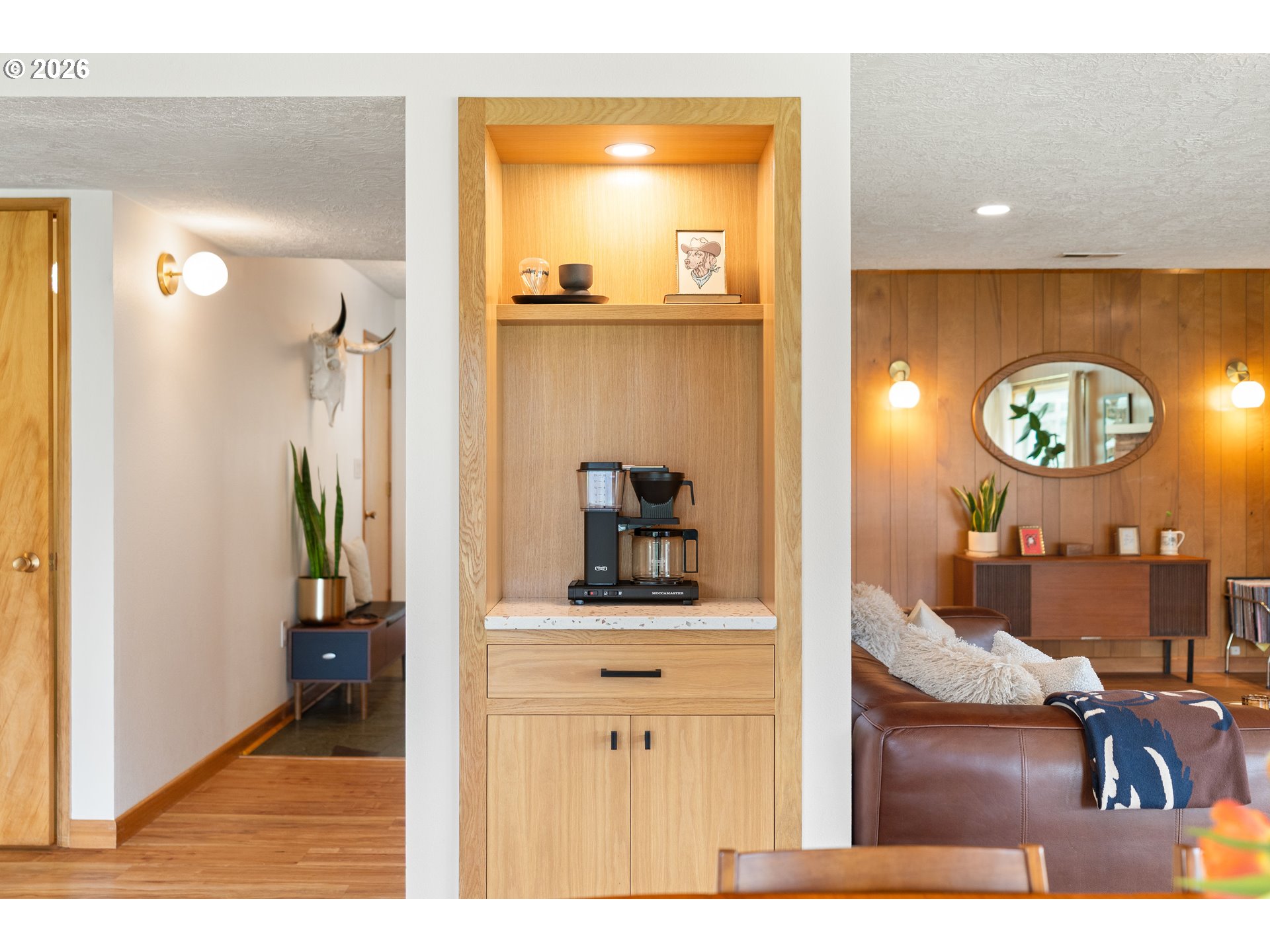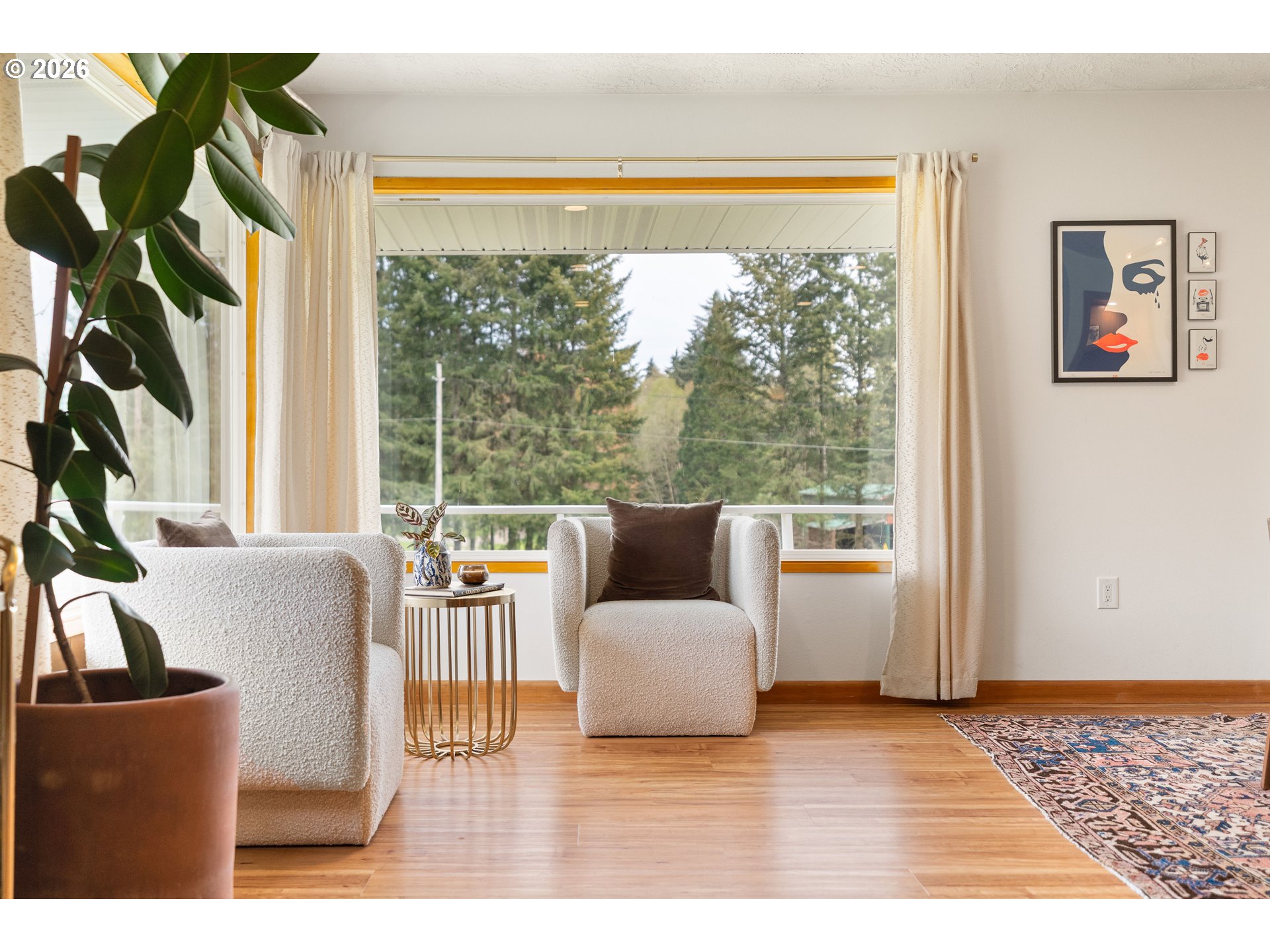 Built in 1962 and nestled on 2.5+ acres in La Center, this authentic mid-century modern home has been lovingly updated from top to bottom while preserving every bit of its original charm. A remodeled kitchen with custom cabinetry, terrazzo-style counters & a coffee bar/nook. A dramatic brick fireplace for cozy evenings. A string-lit concrete patio for backyard gatherings. A primary suite with serene wooded views. Fully remodeled bathrooms on the main level, newer furnace & heat pump, updated electrical panel & so much more. Add chickens, a large shop, deck & plenty of space for your boat/RV — and you have everything you need to live slowly, intentionally & beautifully. This is the life you've been dreaming of. Newer furnace & heat pump (2024), updated electrical panels (2026), new water heater & water filter (2025), replaced well tank (2024) & fresh exterior paint — this home is truly move-in ready.