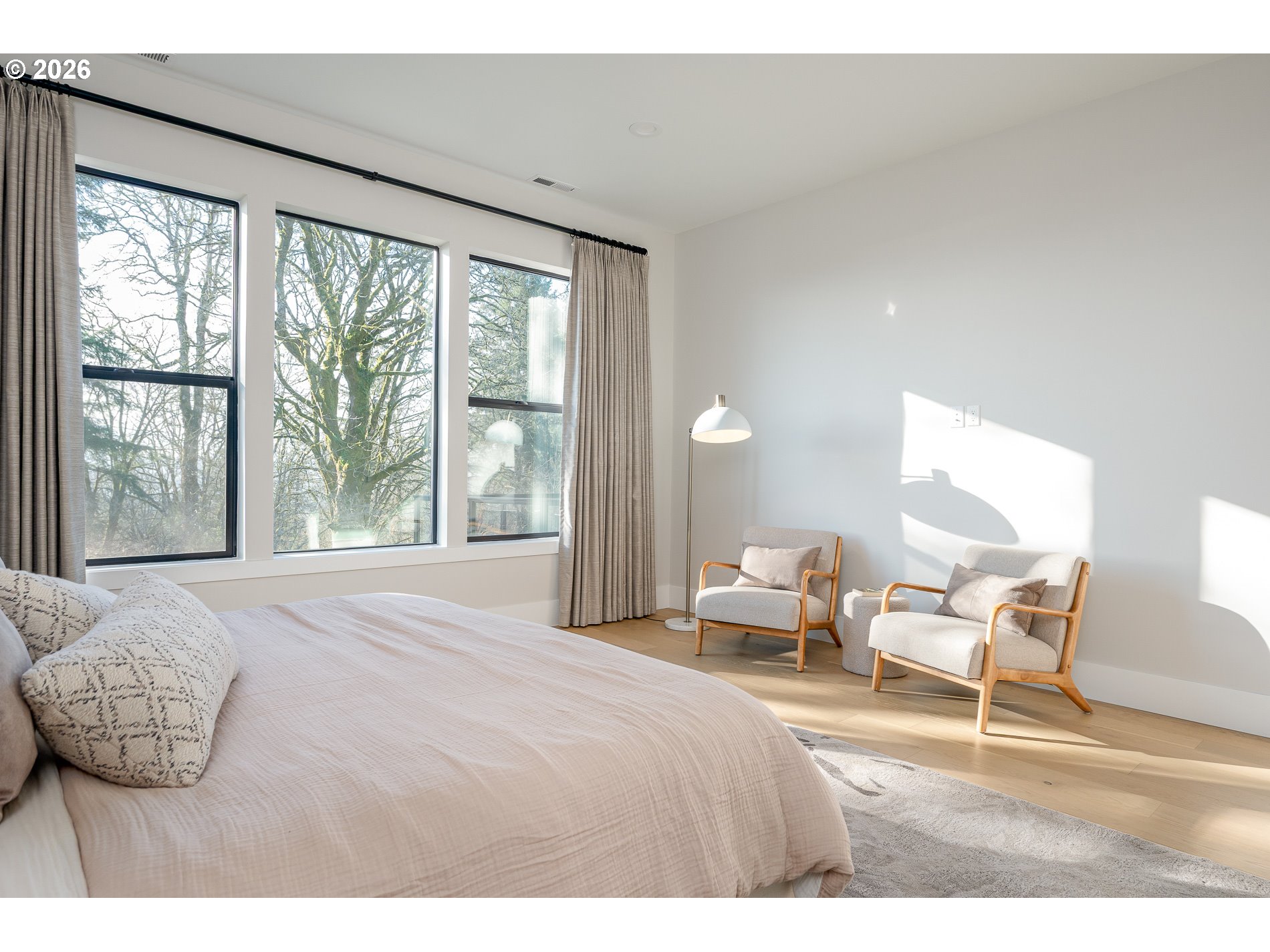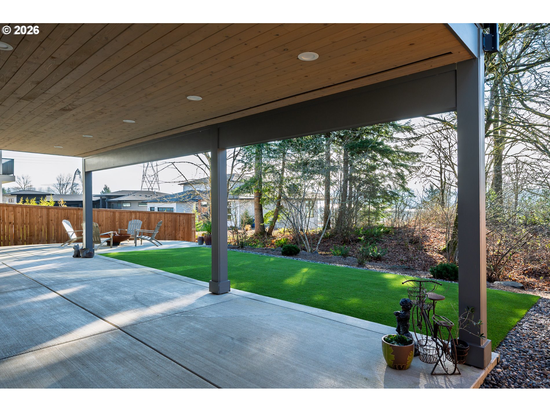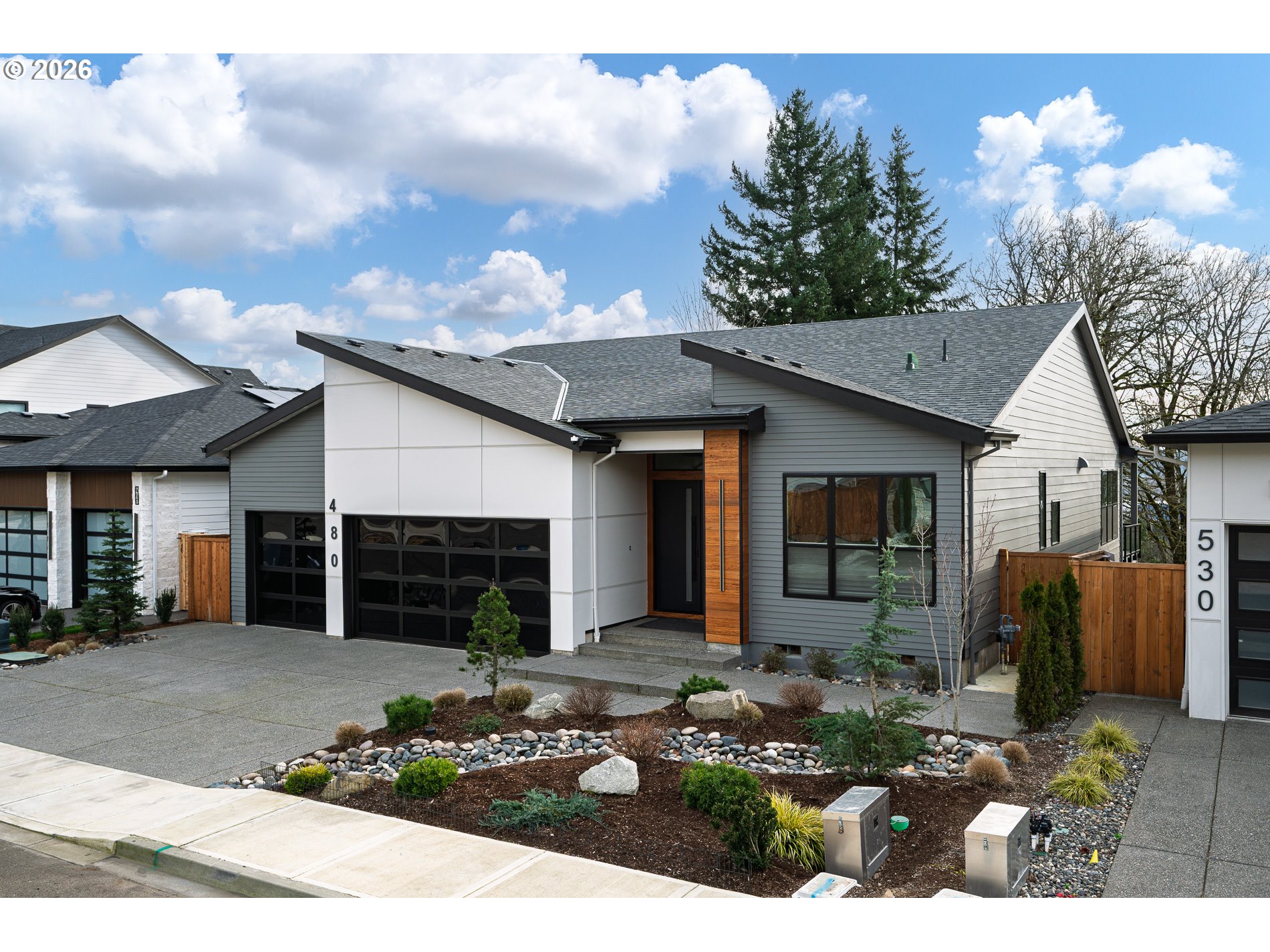 Premium finishes and private greenspace views define this contemporary dayranch in sought-after Spyglass Hill. Extensive care and thought have been put into every facet of this 2023 custom home, which features an open-concept floorplan with high-ceilings, large picture windows, an expansive kitchen with real oak cabinetry and a walk-in pantry with open shelving, dual-level outdoor living, and a large primary suite on the main leel with a custom designed bathroom and large walk-in closet with built-in organizer. Top of the line finishes throughout include real white oak hardwood floors, heated tile in every bathroom, dual zone HVAC with a thermostat on each level and an auxilary whole house air purifier, upgraded led lighting/fixtures, high-end appliances including a 6 burner Wolf gas range and a two door side by side Frigidaire refrigerator, waterfall quartz countertops, designer drapery, central vac, a recessed extra wide "Napoleon" gas fireplace, and extra built-ins/storage closets on each level. The lower level offers a full guest suite and large bonus room with extra storage along with two additional large bedrooms that share an another full bath. Main level living opens to covered outdoor entertainment area with custom concrete decking overlooking HOA owned greenspace with mature trees and Mt. Hood views. Lower level covered patio connects to paver fire pit with turf backyard and a rock retaining wall with drip irrigation. Wide concrete steps connecting up to main level from backyard offers ease of use and accessibility. Extra high garage with built-in storage and EV charger. Home sits on one of the most premium lots in the entire community and feeds prestigious Camas Schools while being just minutes from SR-14, PDX, and all that Downtown Camas has to offer.