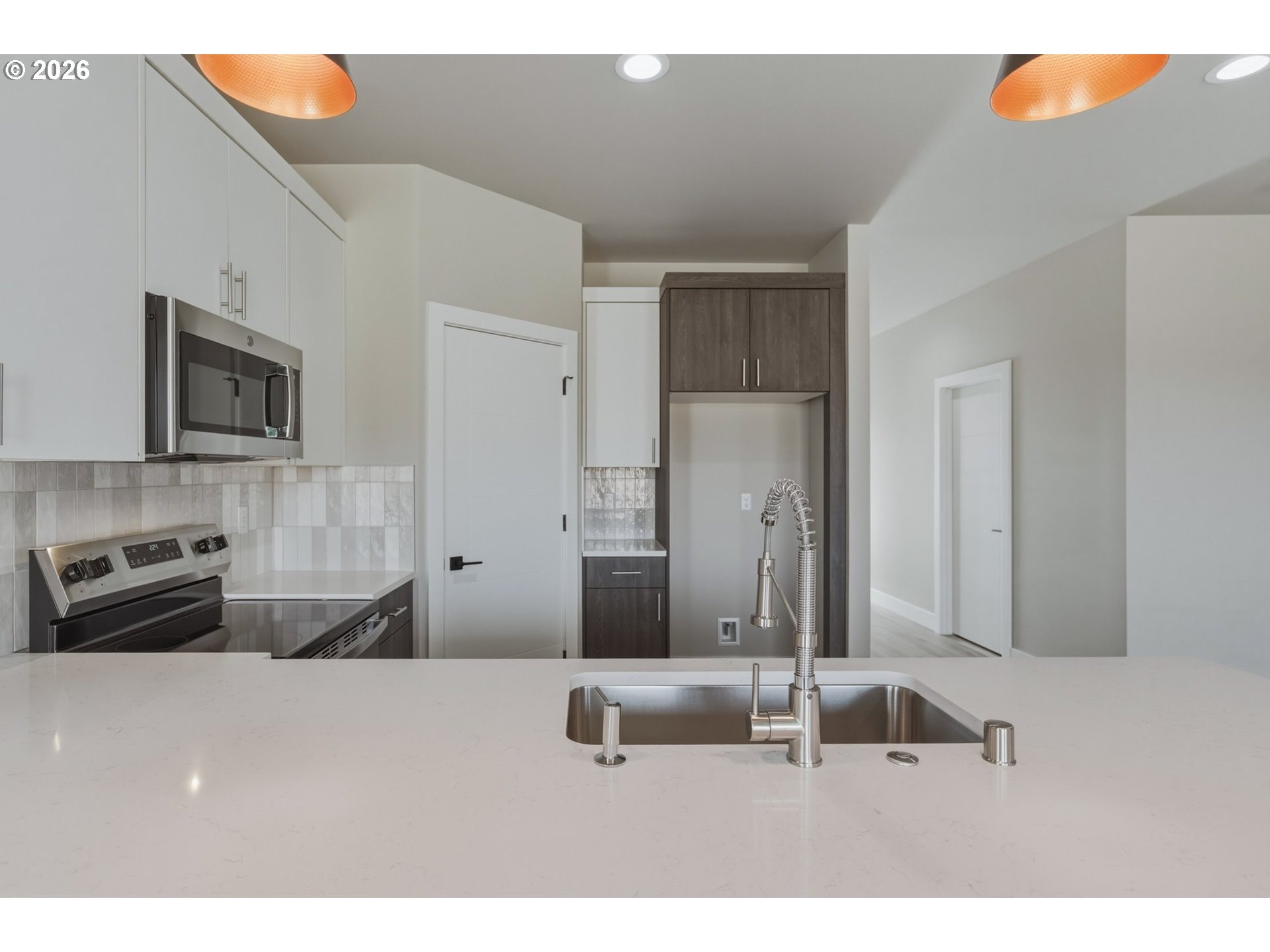 BuiltinRange, Dishwasher, Island, Microwave, Pantry, Quartz, StainlessSteelAppliance, Tile