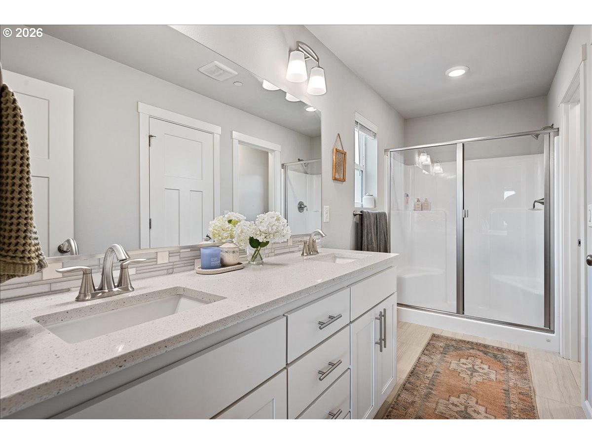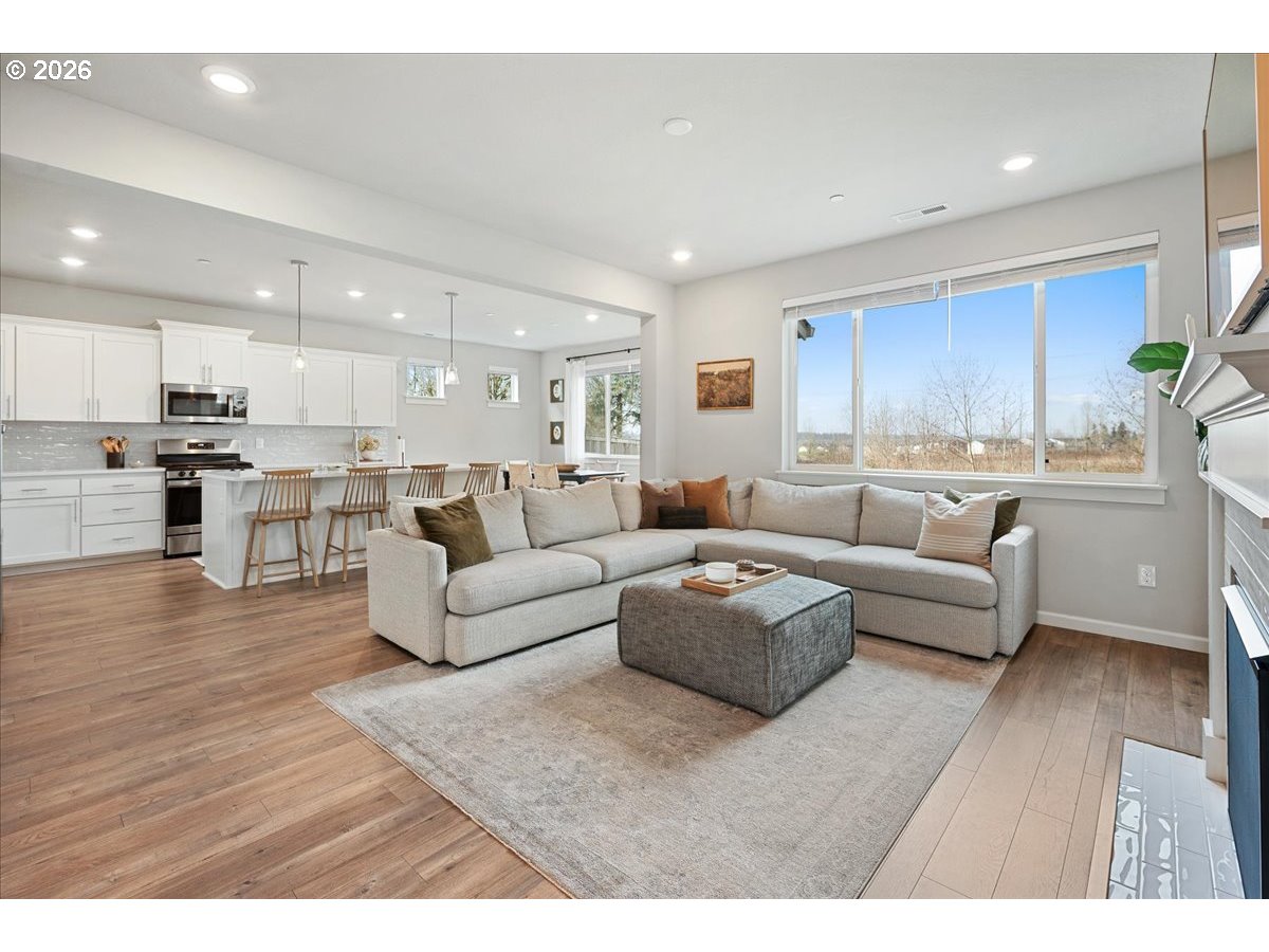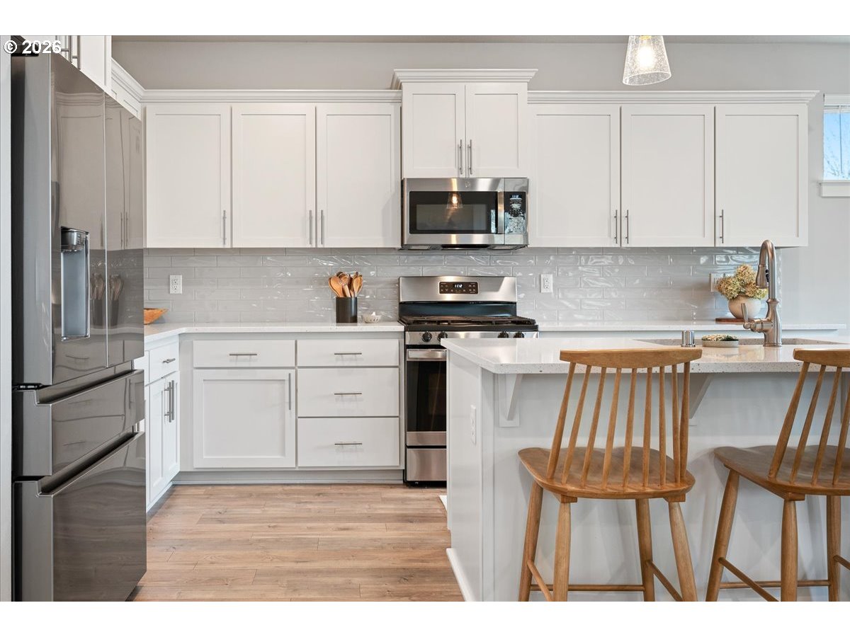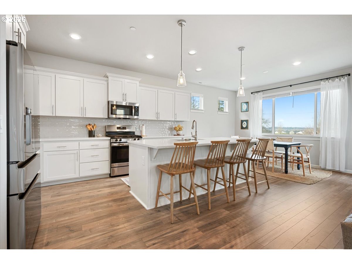 Here it is, that perfect combination you’ve been searching for! Eye catching street appeal with craftsman designs including exterior shutters, decorative pillars, grid style windows, shaker doors, gable brackets and distinct siding details. And it’s located on a premium lot in a cul-de-sac that backs up to a wetland buffer/ green space so there is a nice peaceful view to enjoy all the time! Amazing open and light great room with large dining area, ideal for comfort and gatherings. Like to cook? This kitchen is a dream, ample countertop space with a huge island perfect for food prep, serving and a perfect breakfast eating bar. There’s also a wonderful pantry and gas range too! All bedrooms are generous in size and there’s a great nook in the entry designed as a small work space/ office or can be used as a coat and shoe landing area. Primary suite also views the green space and has a large bathroom and walk in closet. Other upgrades include: stylish and practical laminate flooring through out main floor, beautiful quartz countertops in kitchen and primary bathroom, dual sinks in both upstairs baths, attractive tile floors in baths and laundry room, hi-efficiency gas furnace and central AC, tankless hot water heater and a gas fireplace. Enjoy the privacy and easy maintenance in the fenced backyard with the patio, in-ground sprinklers, a variety of perennials and a couple of raised garden beds. HOA includes walking trails, recreational park, basketball court, outdoor pool/ hot tub and BBQ area. This home is just inside the Evergreen School District but many residents get a Camas School boundary exception, it’s located near the bus stop for both districts. Refrigerator and Ring doorbell are included!