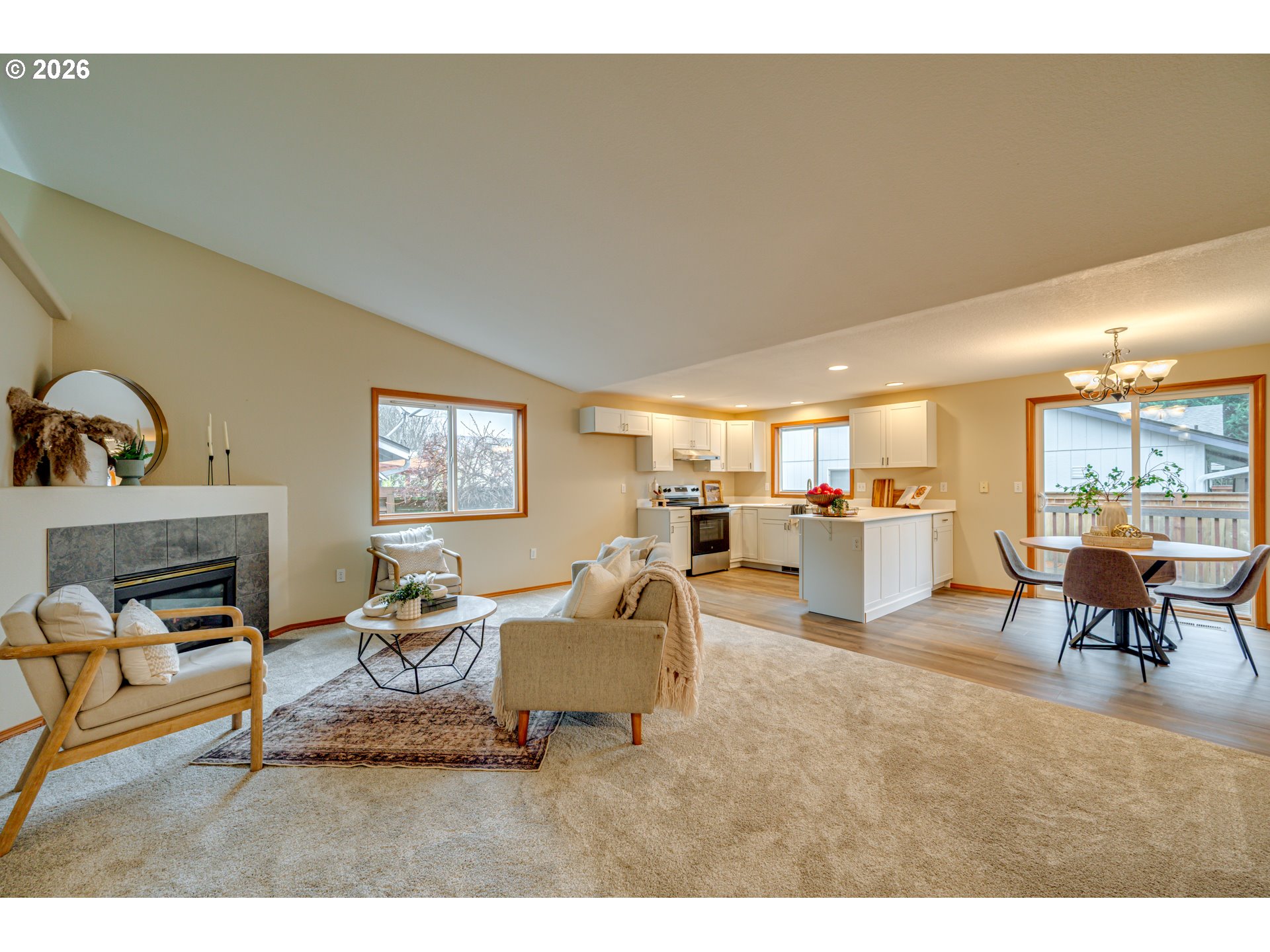 Light and bright ranch-style home located in a quiet cul-de-sac. Enjoy the spacious living room featuring a charming bay window, or relax by the cozy fireplace in the family room. This home offers numerous updates, including brand-new kitchen cabinets, countertops, dishwasher, and stove/range, along with new carpet throughout. New Waterproof laminate flooring enhances the entry and kitchen, and the interior has been freshly painted. The spacious primary suite features a walk-in closet, generous bathroom counter space, and a walk-in shower. Step outside to a large deck perfect for entertaining overlooking a low-maintenance backyard. Additional highlights include a finished garage with a large workbench. Conveniently located near shopping, dining, and freeway access. This home is a true gem!