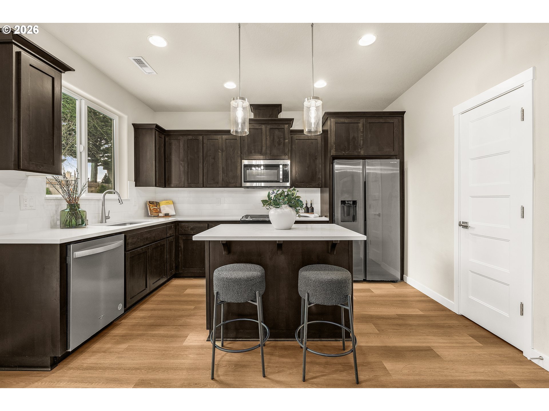 This gorgeous home features 4 bedrooms, 2.5 bathrooms and is close to a golf course, shopping, schools, and freeways. Entertaining family and friends is a delight with an open kitchen, dining, and living room that flows beautifully into your own backyard oasis. Imagine the memories you will make hosting summer barbecues and roasting marshmallows around the fire pit. You will love the 9 foot ceilings, knotty alder cabinets with raised panel doors, stainless gas range, quartz countertops, luxury vinyl plank flooring, brushed nickel hardware, and primary bedroom with walk in closet and en suite bath. This lovely home has been professionally cleaned and is move in ready. All this home needs is you!