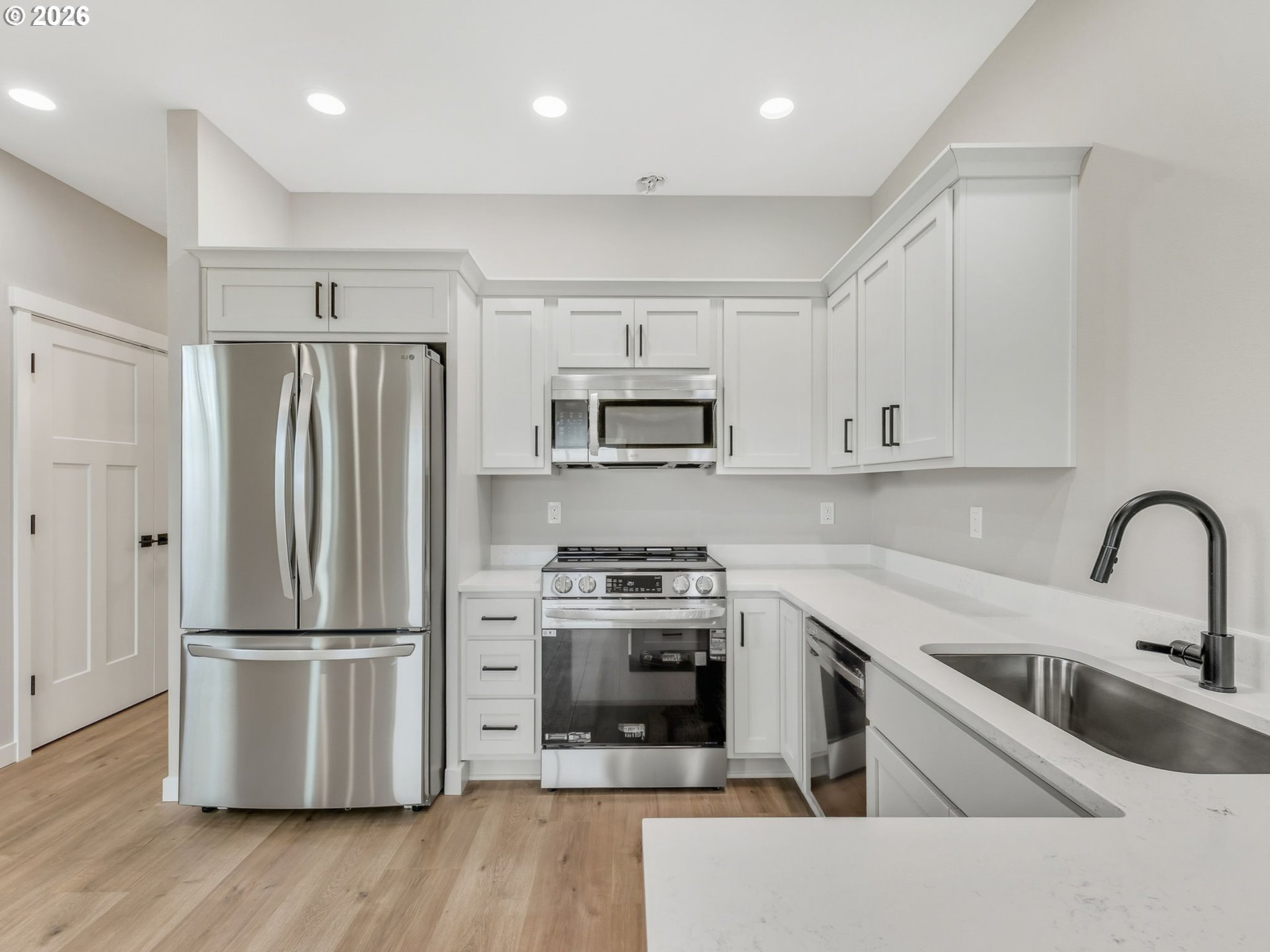 Just completed and move-in ready in Warrenton - walkable to downtown shops and dining! This brand-new 1,650 sq ft townhome offers 3 bedrooms and 2.5 baths with a bright great room floor plan and modern finishes throughout. The kitchen features white shaker cabinetry, quartz countertops, matte black hardware, a pantry, and LG stainless steel appliances. Easy-care wood-look flooring and recessed lighting keep the main level fresh and functional, with a sliding glass door that opens to a private fenced yard and concrete patio - perfect for grilling, pets, or easy outdoor living. Upstairs includes a primary suite with its own bath, plus two additional bedrooms and a full bathroom. Attached single-car garage for parking and storage.