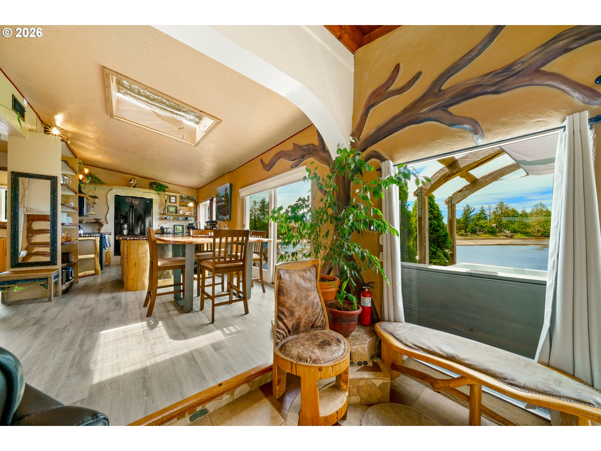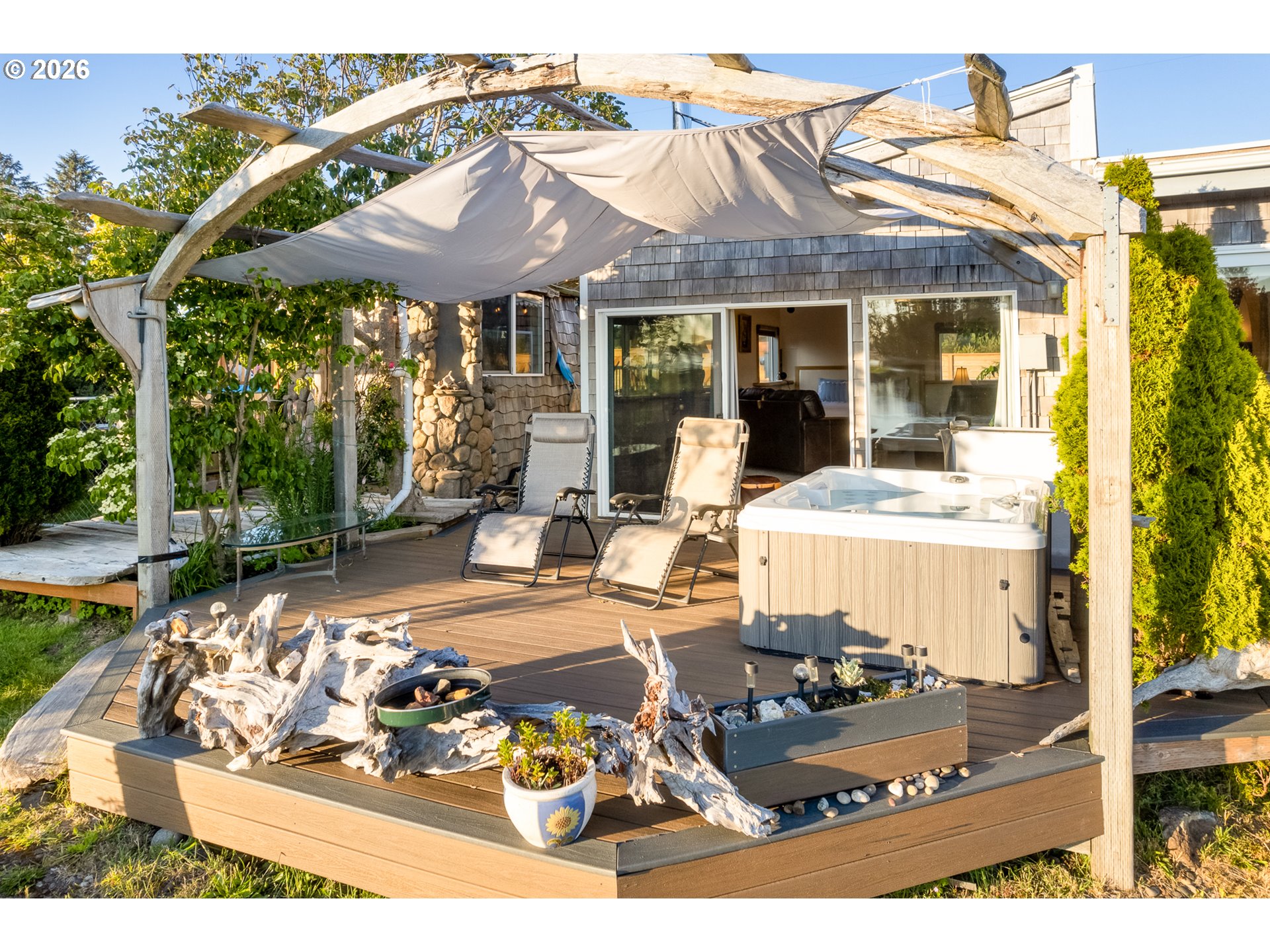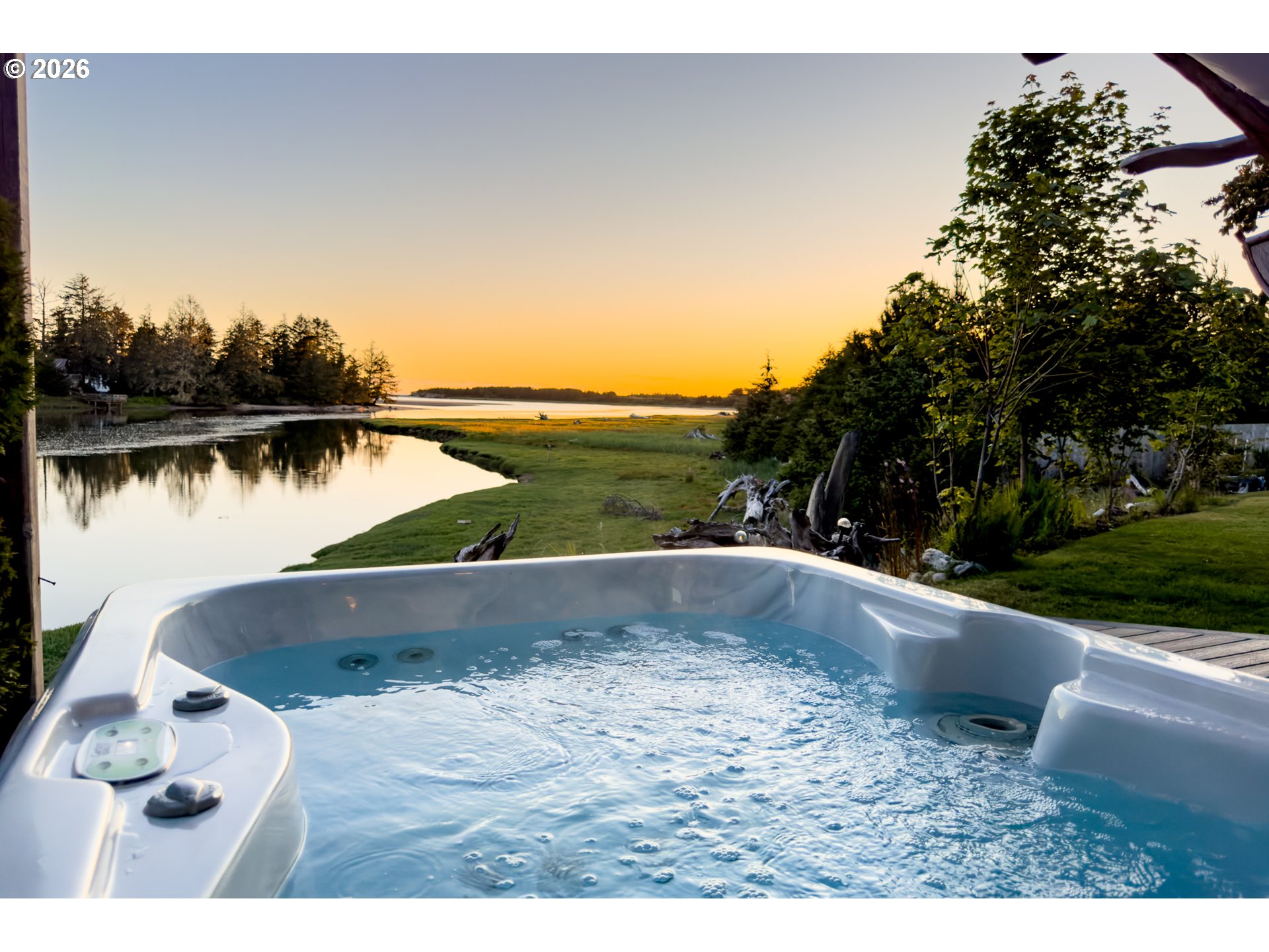 Elevated waterfront property with 195 ft of Neawanna estuary frontage and panoramic river to ocean views. This one of one parcel sits 30 ft above the water on land once occupied by a Clatsop village and referenced in the Lewis & Clark journals as a trading point and western turnaround. C3 commercial zoning qualifies for commercial finance and supports flexible live work or income producing uses, with 195 ft of Highway 101 with dedicated ingress/egress. Includes a bohemian home, detached studio + shop, room for additional units, and an operational STR license. Both the hot tub and pool overlook the estuary, surrounded by wildlife, tidal channels, and open water just minutes from Seaside and Gearhart.