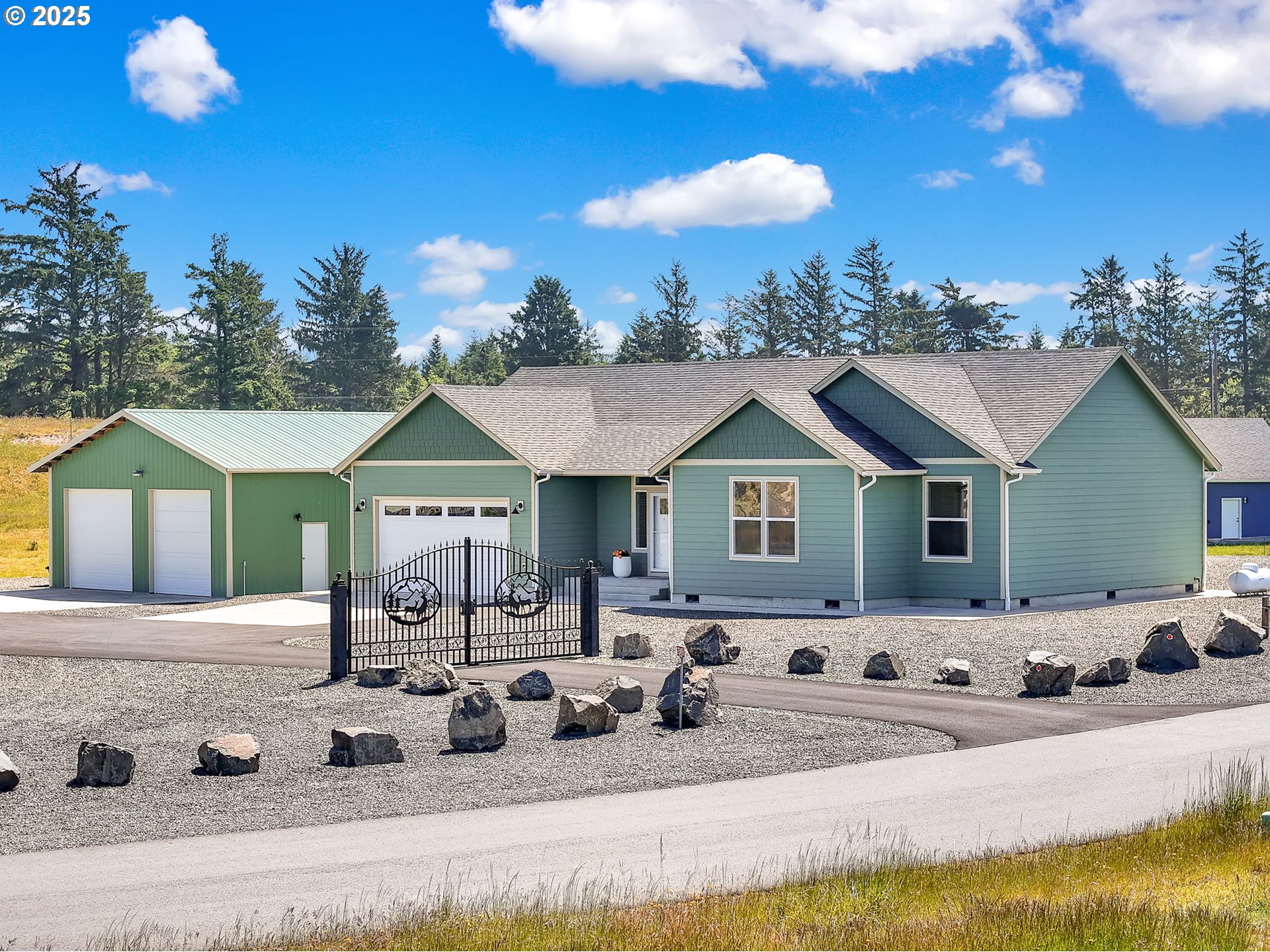 Enjoy easy living in this like-new 3 BR, 2 BA home sitting on 1.18 acres of no-maintenance land in central Clatsop County. With great proximity to beach, golf, shopping and more. This home boasts efficient use of space, lots of all-day sun and plenty of elbow-room. Inside you'll find beautiful flooring, quartz countertops, a warm fireplace with custom-made mantle and a spacious master bedroom all on 1 level for great accessibility. Outside, you'll find a 30' x 36' shop for boat/RV storage, huge workbench, tall garage doors plus one on the back for pull-though situations. The ultra-low maintenance landscaping is finished with dramatic boulders and custom iron gates on the driveway. This one is easy-care and move-in ready!