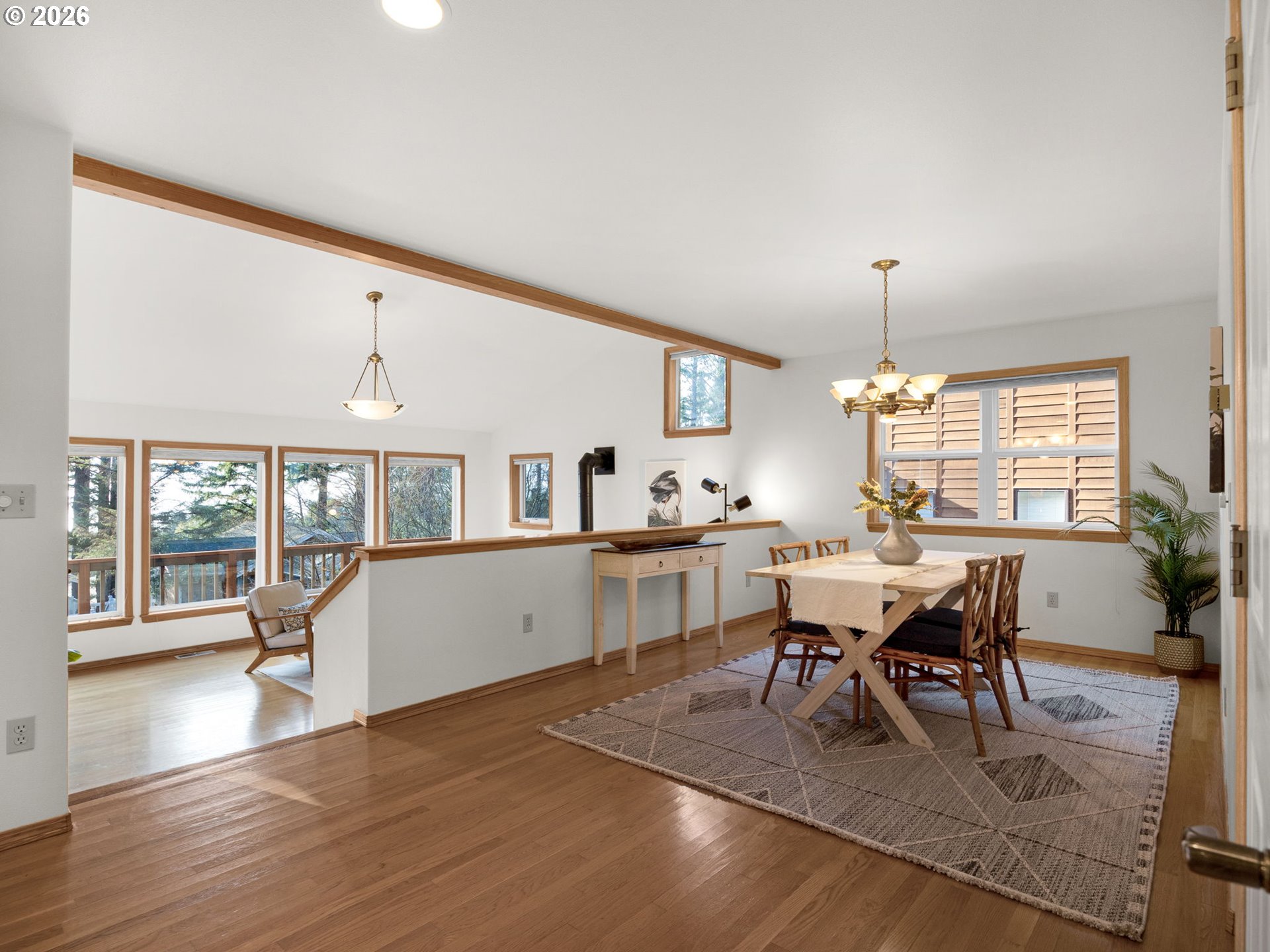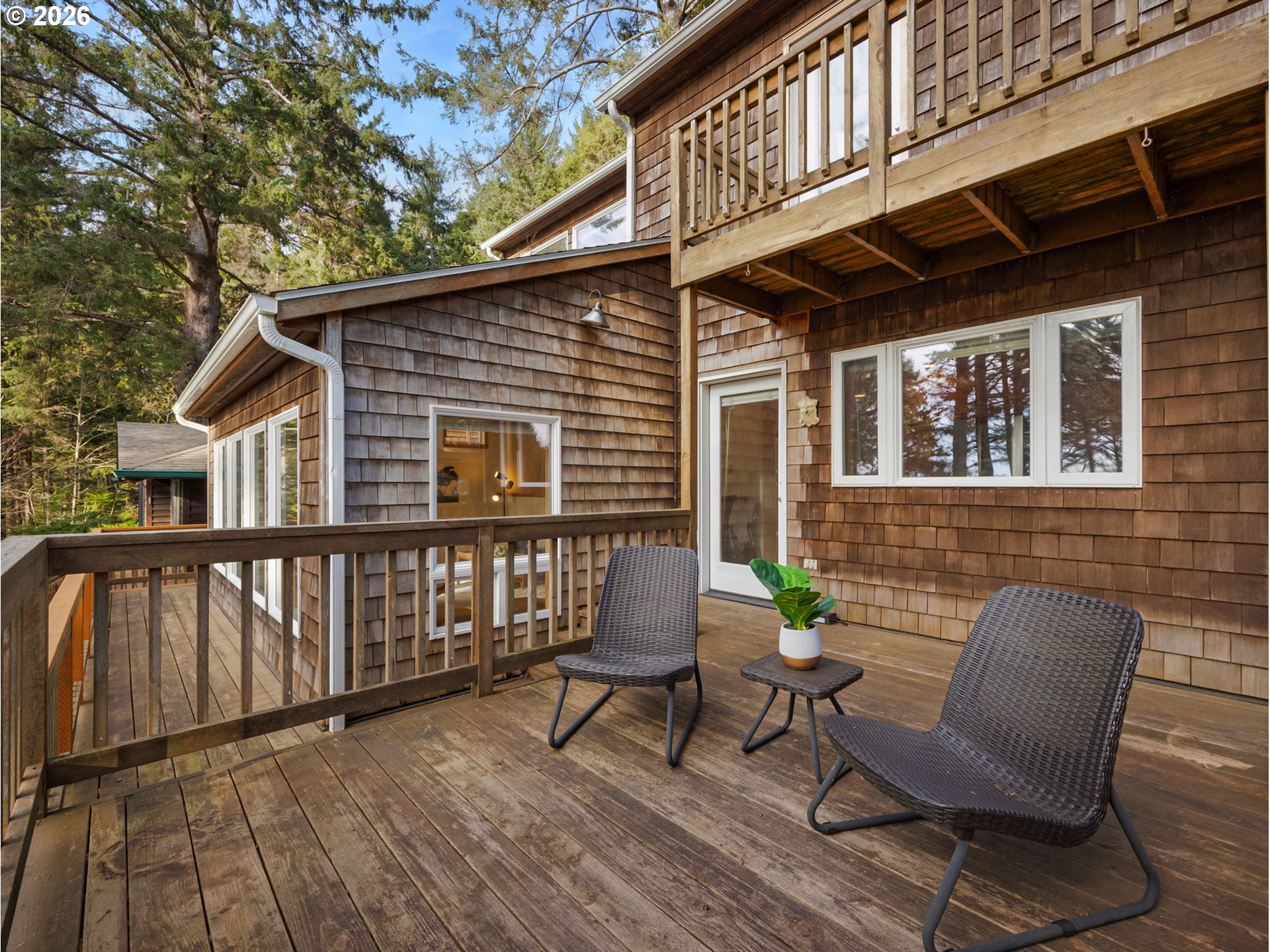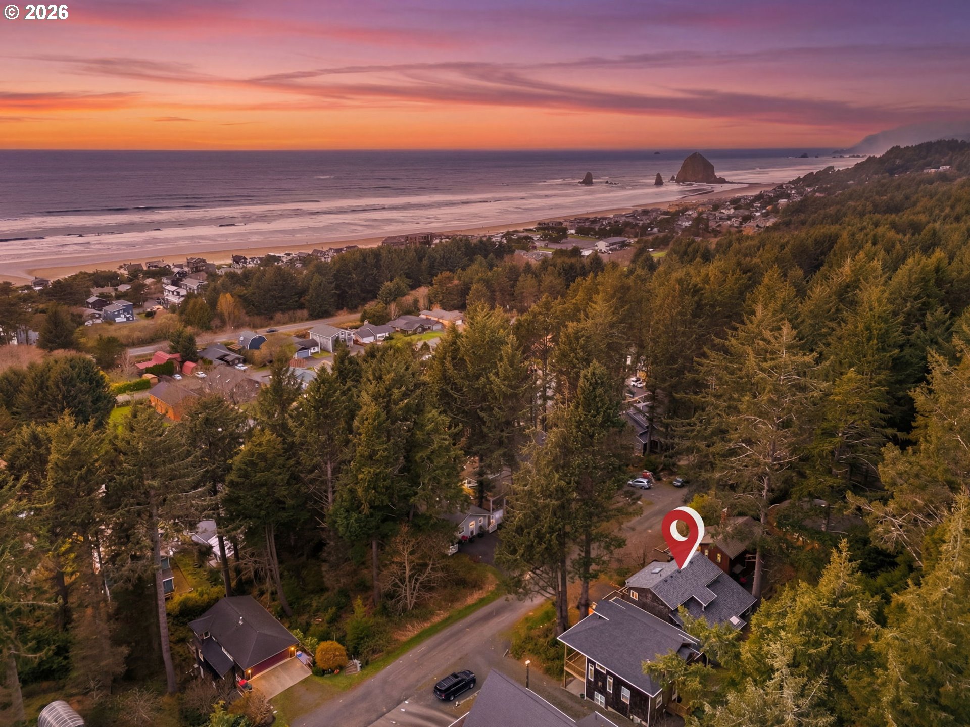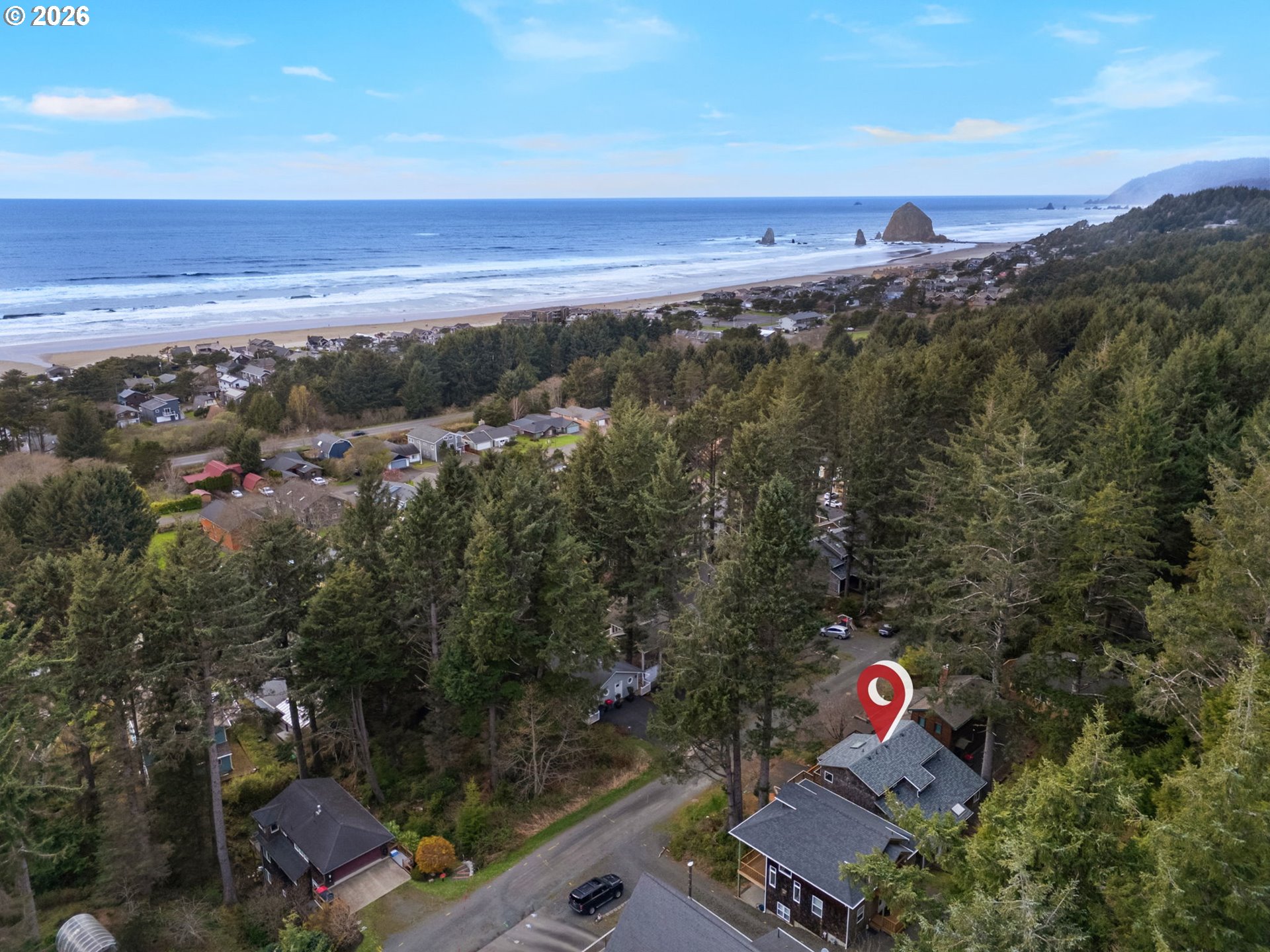 Privately set among the evergreens in coveted Haystack Heights, this refined Cannon Beach retreat captures the essence of elevated coastal living. Perched above town, the home enjoys filtered ocean views from the light-filled living room, where vaulted ceilings, warm wood detailing, and a sleek wood-burning stove create a space that feels both sophisticated and effortlessly relaxed.Expansive windows frame a serene coastal forest backdrop, inviting natural light to pour in while maintaining a sense of seclusion. The open-concept living area flows seamlessly onto a generous deck—perfect for morning coffee, evening wine, or quiet moments surrounded by nature with the sound of the ocean in the distance.Thoughtfully designed with both comfort and function in mind, the home features multiple levels of living, ideal for hosting guests or creating private retreats within the home. The elevated setting offers a rare blend of privacy and proximity—just minutes from the beach, Haystack Rock, and the boutiques and dining of downtown Cannon Beach.A spacious garage, ample parking, and low-maintenance coastal landscaping enhance everyday ease, while the surrounding natural beauty provides a timeless Pacific Northwest backdrop.Whether envisioned as a full-time residence or an elevated coastal getaway, this Haystack Heights home offers a rare opportunity to own a peaceful, view-oriented escape in one of the Oregon Coast’s most iconic communities.