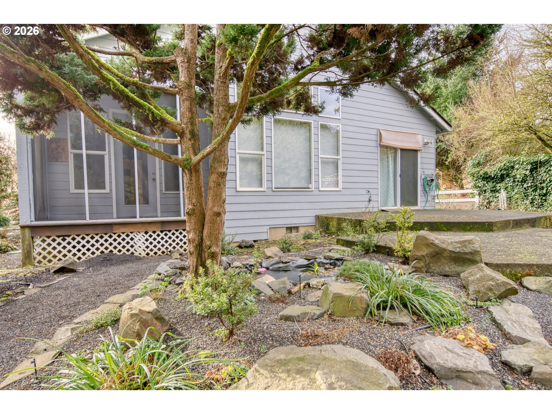 Birder's paradise. Exceptional One Level home on Extra Large Lot. Situated on over 1/4 acre, this home has been loving cared for and updated through the years. Long driveway for plenty of parking. Newer 50 year composition roof. Paved pathway access with ramp to covered front patio entry. Inviting Tall Ceiling Foyer Entry to Open Living/Dining/Kitchen concept. Slider door access to professionally landscaped backyard. Perfect paved back terraced patio for entertaining and enjoying the vast variety of unique plants the encapsulates this formal english garden setting. Multiple leveled areas for enjoying the natural setting with vast xeriscaping. Serene setting with water fountain feature and with birds and wildlife. Large Windows let lots of natural light in throughout the home. Vaulted Ceilings and fireplace in living area. Built in Speakers throughout the house. Central Vacuum system for convenience. Direct access via French doors to enclosed catio/patio from Primary Bedroom. Enjoy the half vaulted ceiling with en-suite bathroom with soaking tub and separate shower. Low countersink for accessibility. Walk in closet. Wide walk way with handrail. Laundry room/mud room entry to attached garage. Newer washer/dryer included. New heat pump and furnace less than year old. Updated exterior paint. Complete pathway around perimeter of home. This is a must see home on non through street. Call for an appointment to preview today.