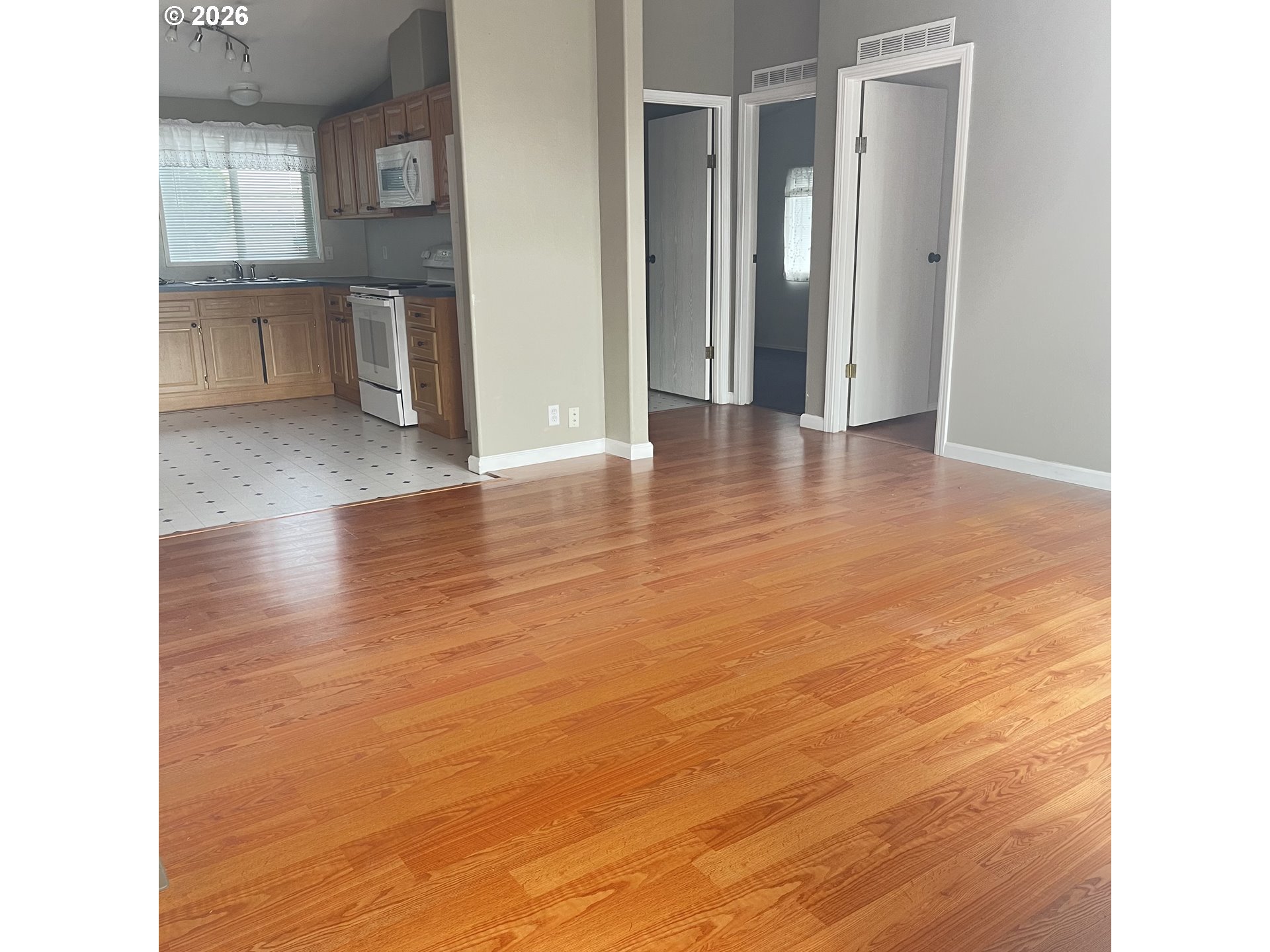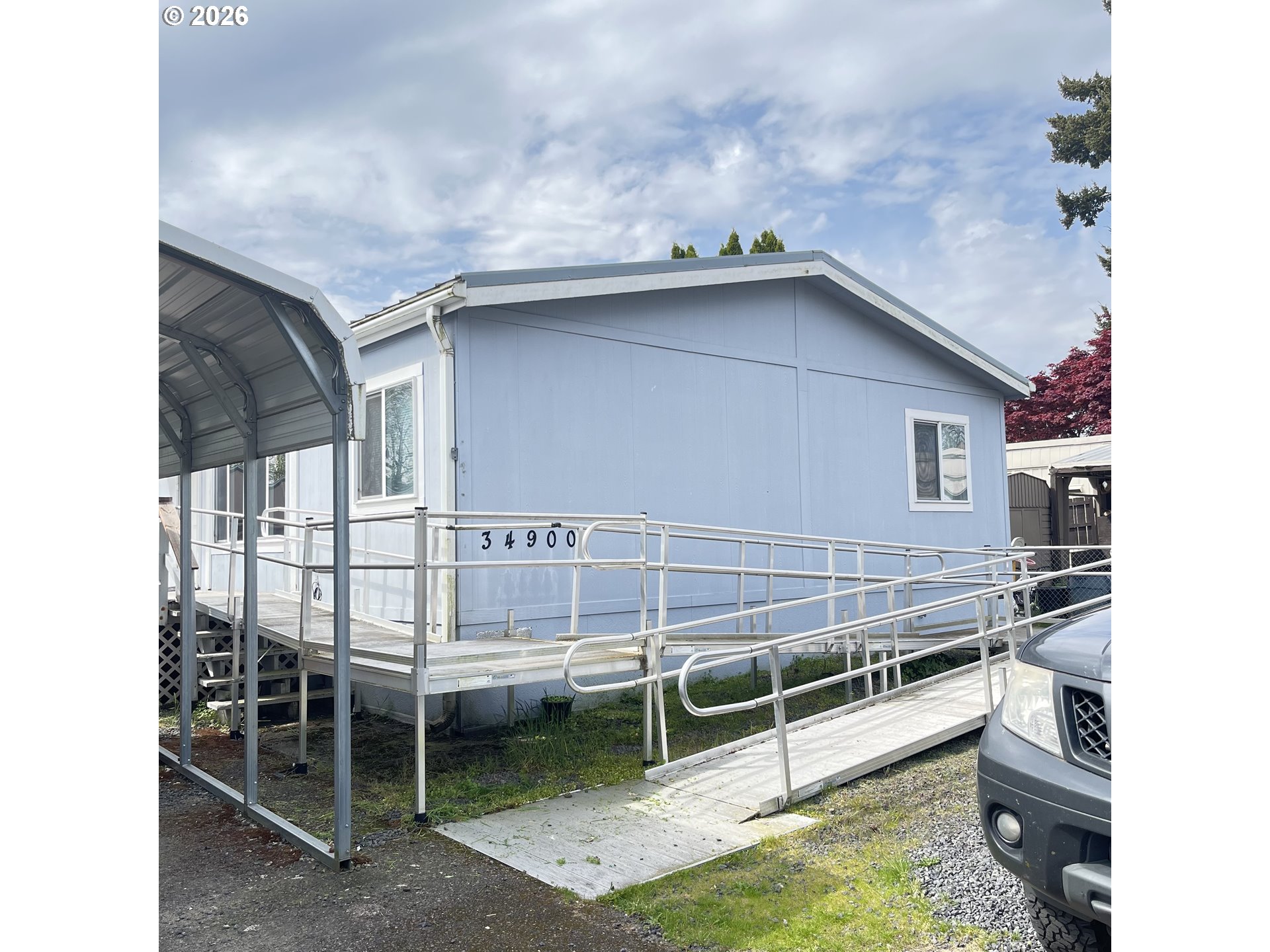 Peaceful setting close in to Scappoose. Vaulted ceiling to let the sun shine in! Newer Heat pump, stove and refrigerator. Washer and dryer stay. Newer carport and sturdy aluminum ramp.Space rent includes water, garbage, locked mailboxWater is shared well lab tested yearly.