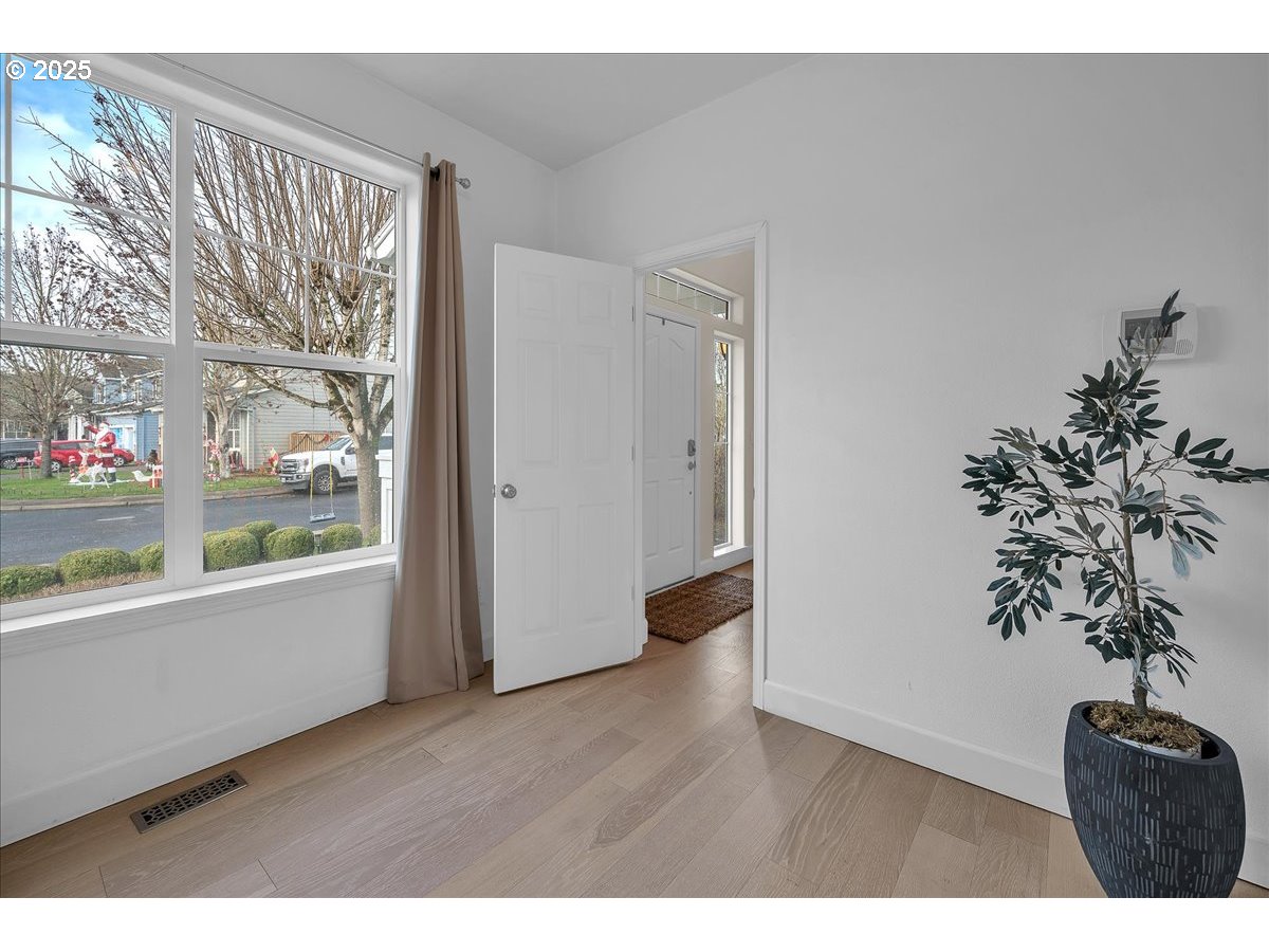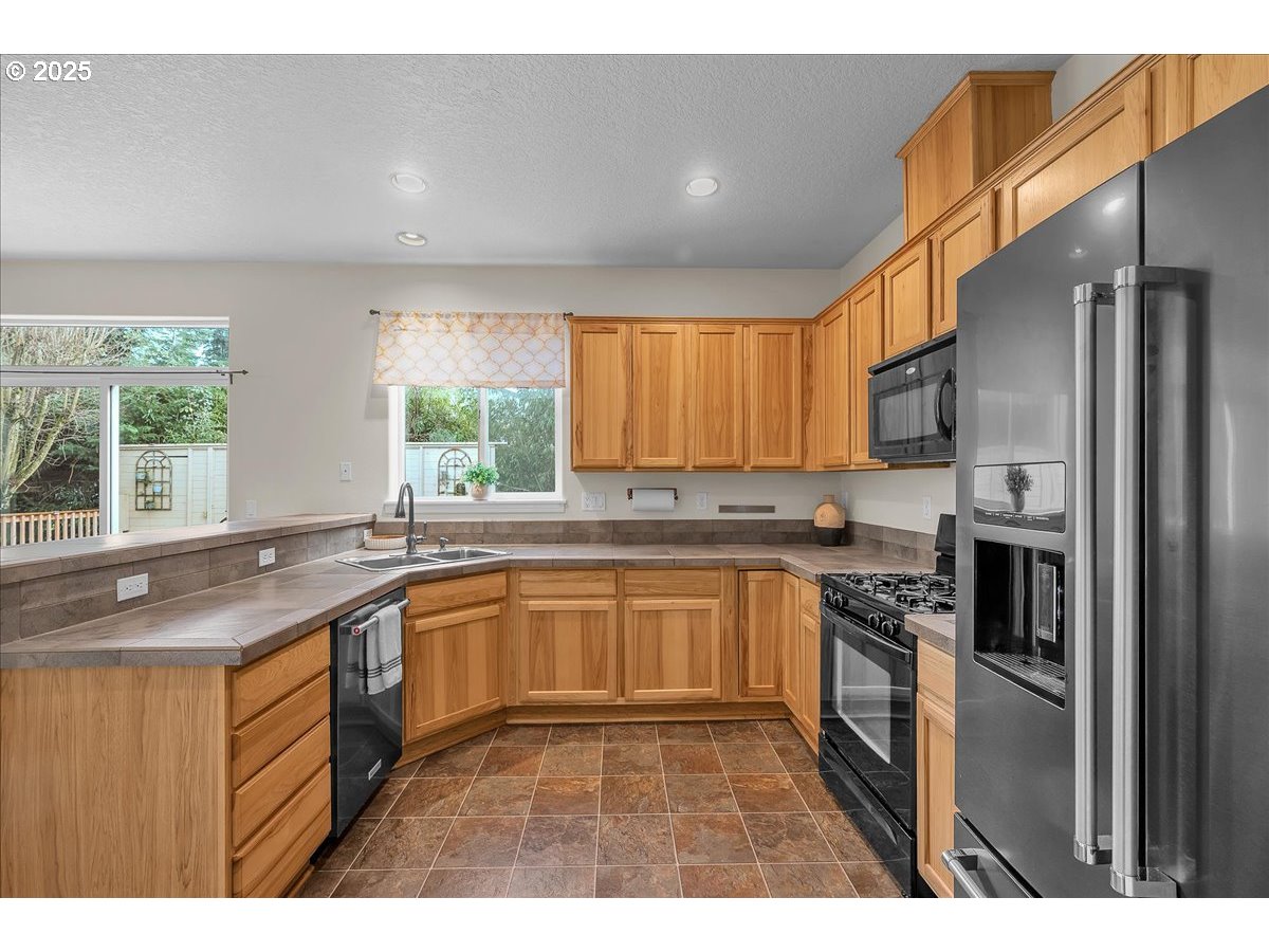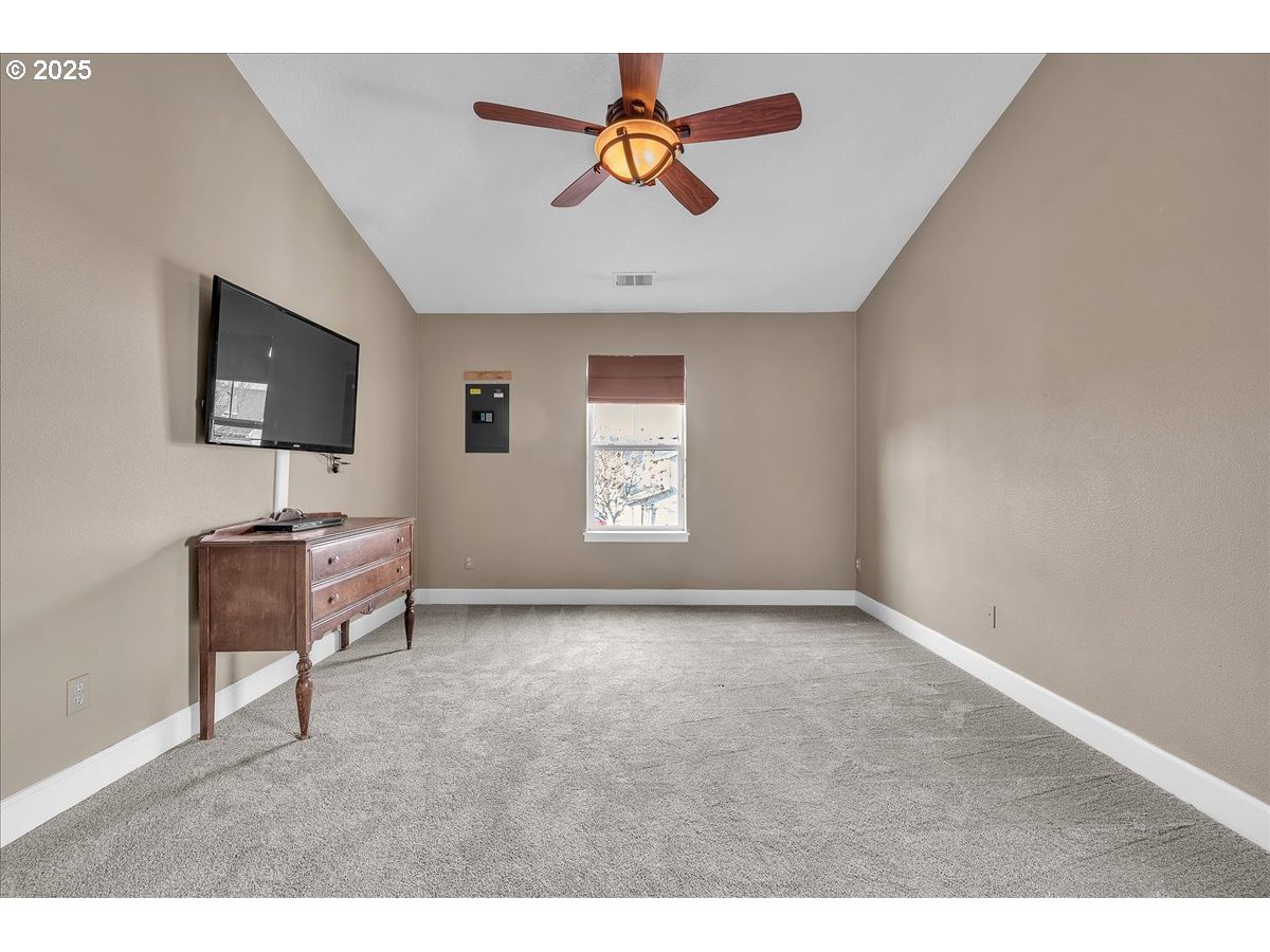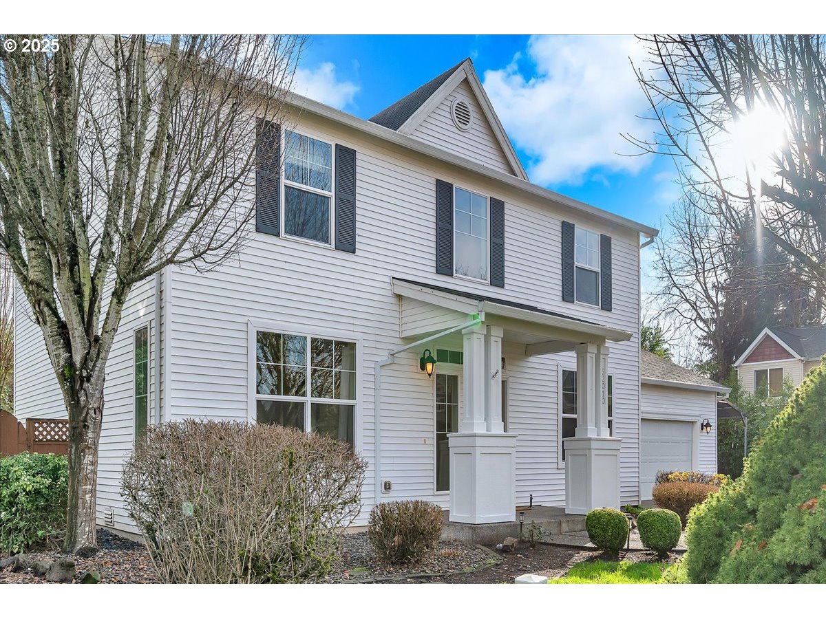 This inviting home offers a comfortable, versatile floor plan with effortless flow between the kitchen, dining area and two separate living spaces, perfect for entertaining or relaxed get-togethers. The spacious kitchen features tile countertops, an eating bar and updated appliances, all included, and opens to the adjoining family room with a cozy fireplace and ceiling fan. The main floor also includes a flexible den, ideal for a home office, study area or creative space, along with a convenient utility room featuring an updated washer and dryer. Upstairs, the bedrooms are thoughtfully grouped together. The primary suite showcases a vaulted ceiling that enhances the sense of openness, a generous walk-in closet, and a well-appointed bath with double sinks and a soaking tub. Newer carpet and laminate flooring, paired with freshly updated interior paint, gives the home a crisp, refreshed feel throughout, and the large windows bring in beautiful light. Outdoors, the fully fenced backyard offers a composite deck, tool shed, mature landscaping and seasonal enjoyment from raspberries, blueberries and rhubarb. The open farmland beyond offers a peaceful backdrop and a sense of privacy that is often not found in the city. An oversized garage provides excellent storage, including attic space, and the long driveway plus the separate carport offer ample parking options. Located near schools and along a popular annual holiday parade route, this home blends comfort, flexibility and a welcoming setting. No HOA here! The easy commute to the Metro area makes Scappoose a high-demand location to call home!