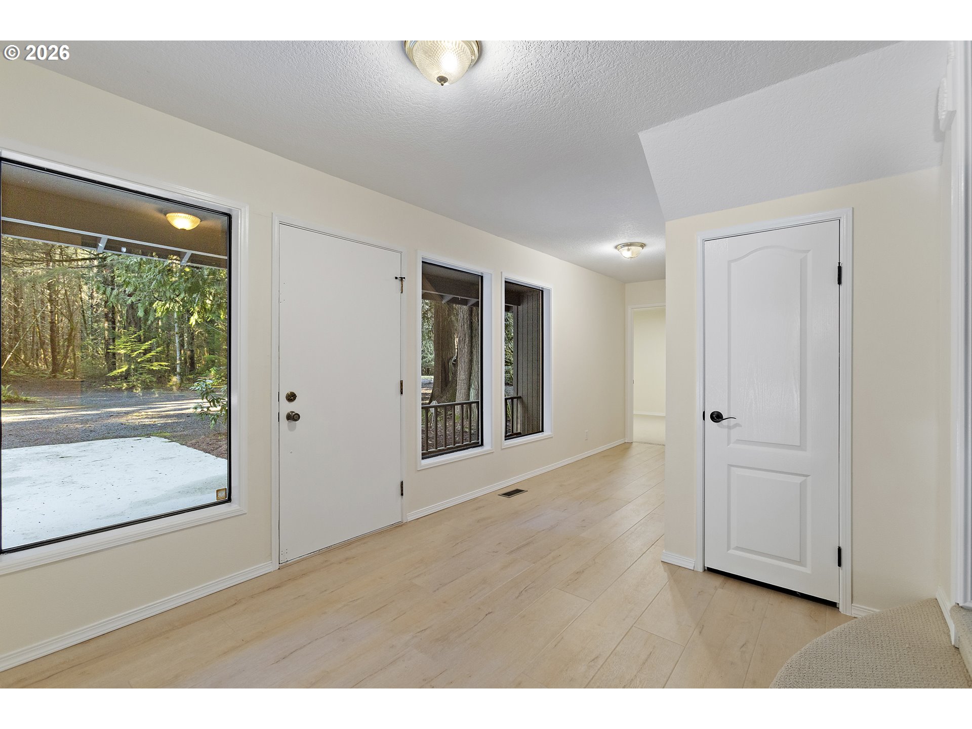 Tucked away on nearly 7 acres of serene, forested privacy, this spacious property offers the perfect blend of comfort, functionality, and natural beauty. Surrounded by mature trees and peaceful views in every direction, the home is filled with windows that frame the landscape and invite abundant natural light throughout. The spacious kitchen features granite countertops, stainless steel appliances, laminate flooring, and generous prep and storage space—ideal for everyday living and entertaining. A nearby laundry room with full sink and full bath adds everyday convenience. Sliding doors from both the living room and kitchen provide easy access to the back deck and expansive yard, creating seamless indoor-outdoor living. The impressive family room showcases soaring ceilings, floor-to-ceiling windows, and a fireplace, making it a stunning gathering space. Two bedrooms are located on the main level, including the primary suite, offering flexible single-level living. Upstairs, a banister overlooks the family room below and leads to three additional spacious bedrooms and a full bath, providing plenty of room for guests, work-from-home needs, or hobbies. Outside, the property truly shines with a large two-car garage, RV parking with covered storage, a barn, and a shed—perfect for equipment, animals, recreational toys, or workshop space. With open areas that provide space for a pasture to host livestock and animals, this property offers incredible potential for hobby farming or country living. Enjoy the peace, privacy, and endless possibilities this exceptional acreage offers, all while remaining within reach of everyday amenities. Easy access to the Banks Vernonia Linear Trail just across the road.