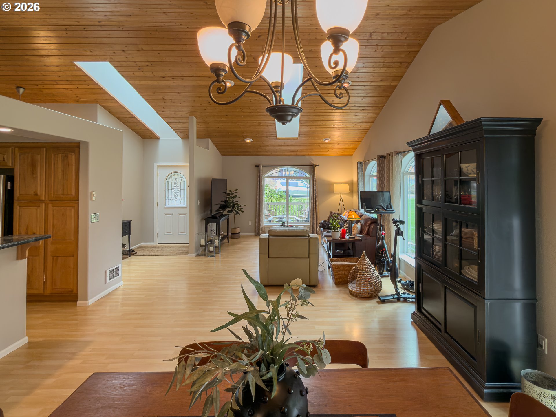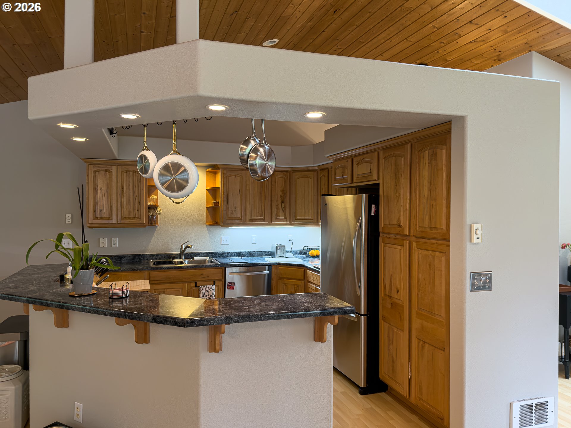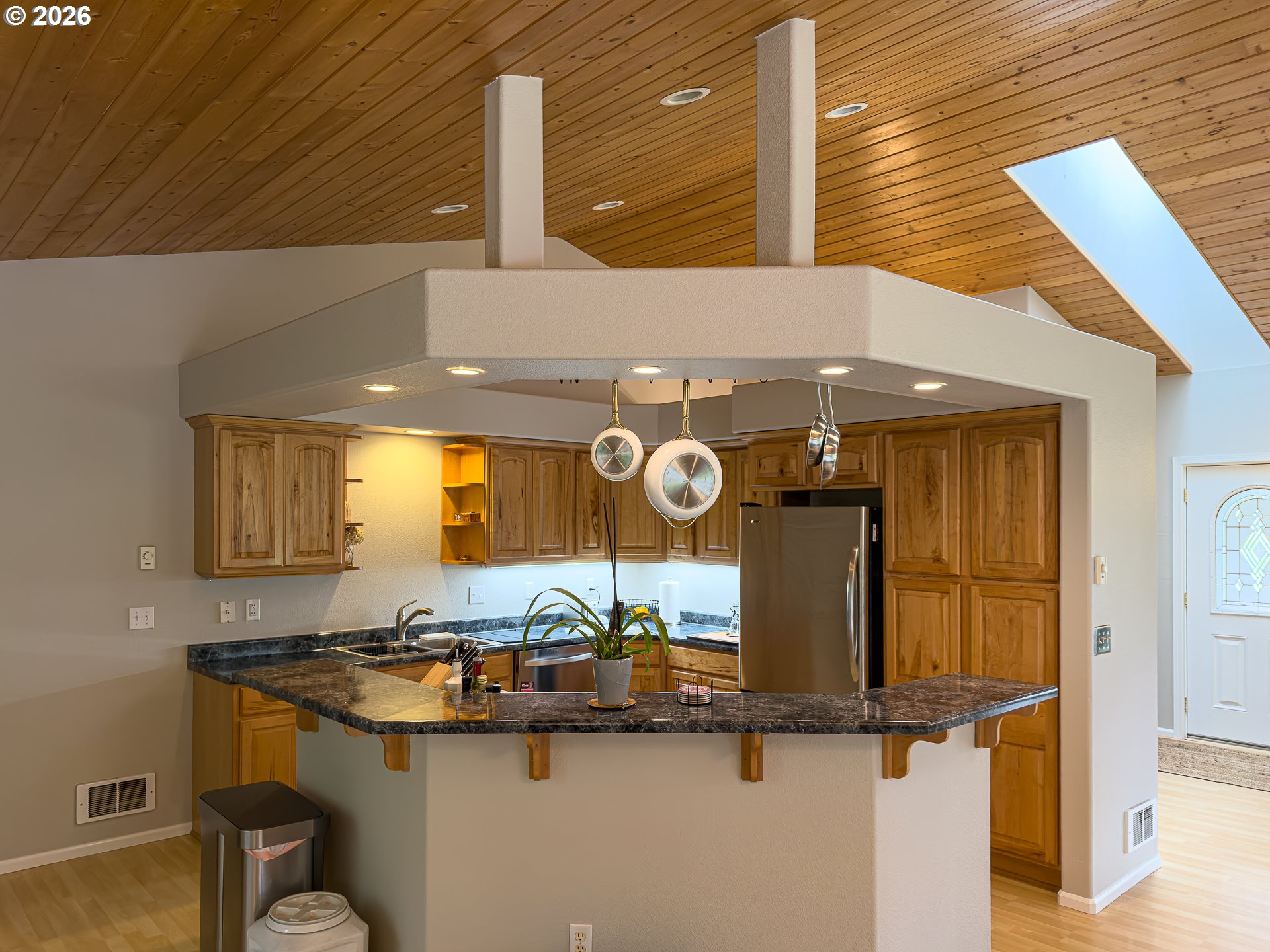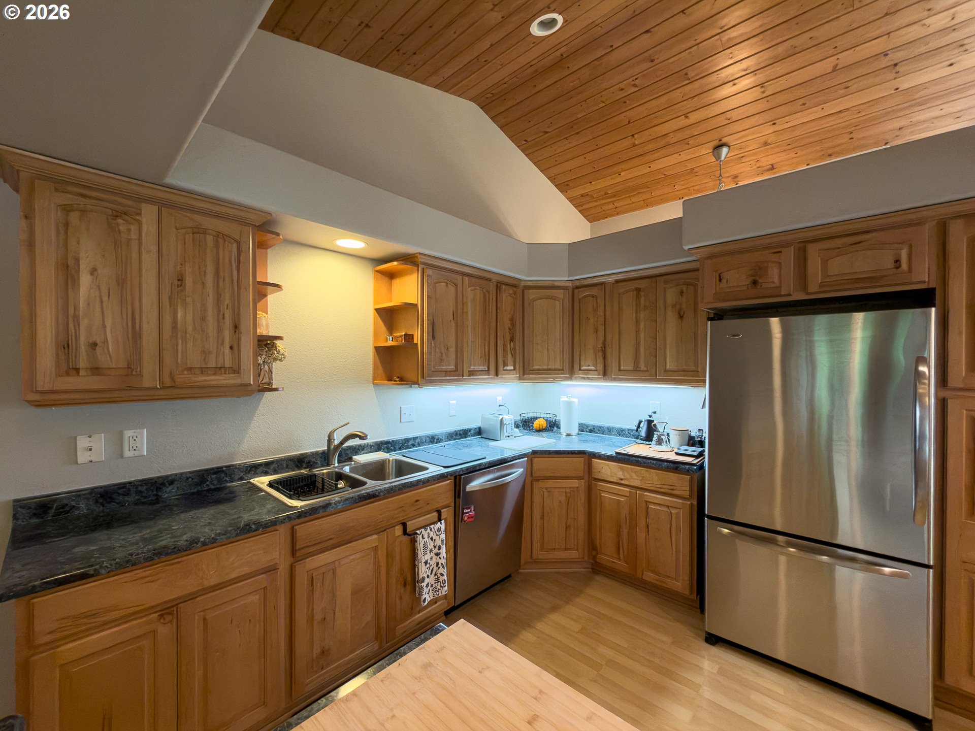 Located at 1185 11th St SE in Bandon, Oregon, this custom single-level home offers comfortable living in a desirable East Bandon neighborhood known for newer custom homes and its sheltered setting out of the coastal wind. Situated on a generous 0.27-acre lot, the property features a sprawling yard with mature landscaping ideal for outdoor enjoyment and gardening. A welcoming covered front porch invites you into this home comprised of three bedrooms and two bathrooms, with an open-concept living and dining area enhanced by abundant natural light exuding from skylights and large picture windows. Warm interior finishes, including knotty pine tongue-and-groove vaulted ceilings and laminate wood flooring, create an inviting atmosphere throughout. The kitchen is thoughtfully designed for both everyday use and entertaining, featuring under-lit oak cabinetry, a central island with cooktop and downdraft. The primary suite offers a walk-in closet and a private ensuite bath. A sliding glass door off the dining area leads to a deck with warm southern exposure and a peaceful, treed backdrop. The backyard blends with nature and includes a practical tool shed for storage and other uses. This well-located property combines functionality, comfort, and a setting that makes the most of Bandon’s coastal lifestyle. Be sure to watch the video tour!