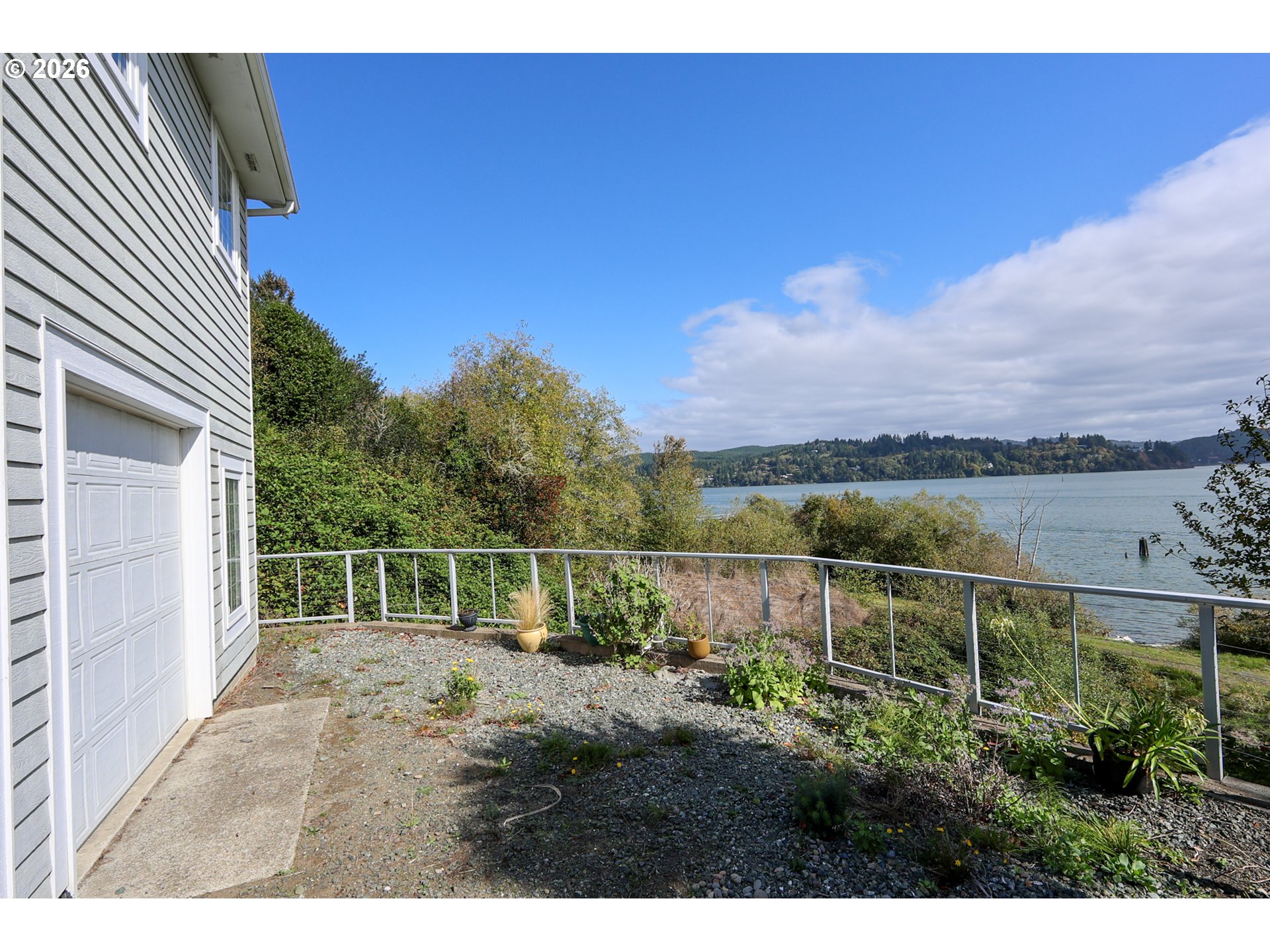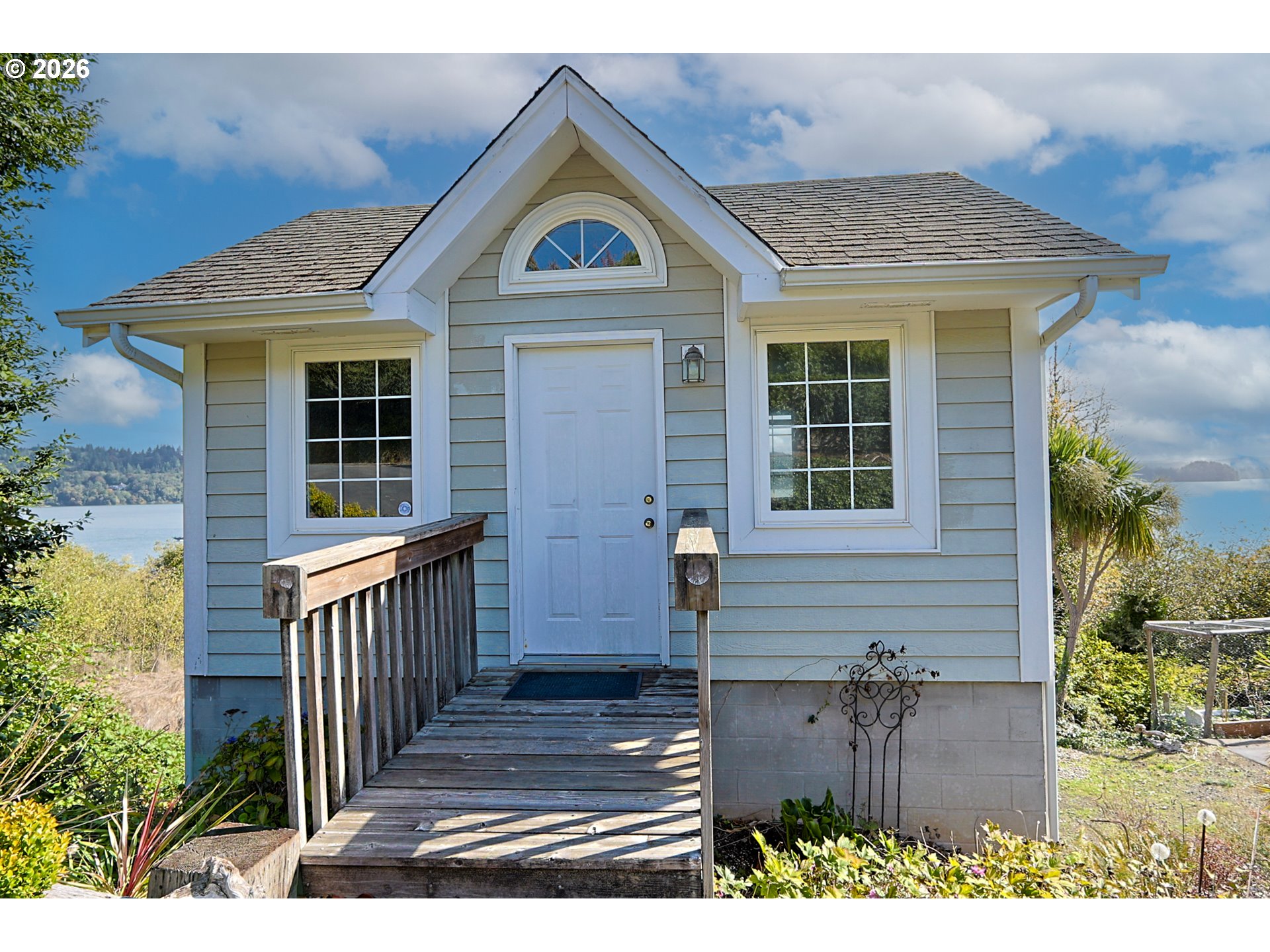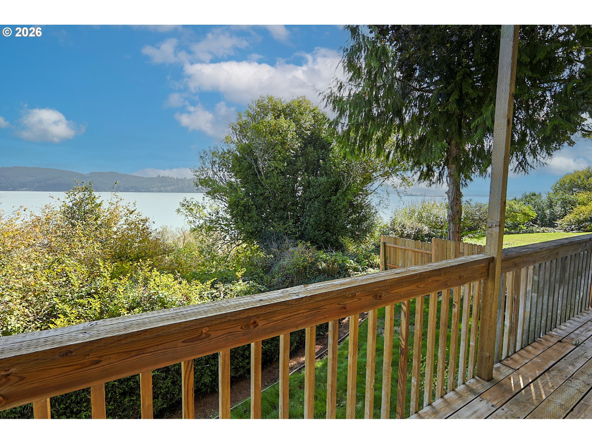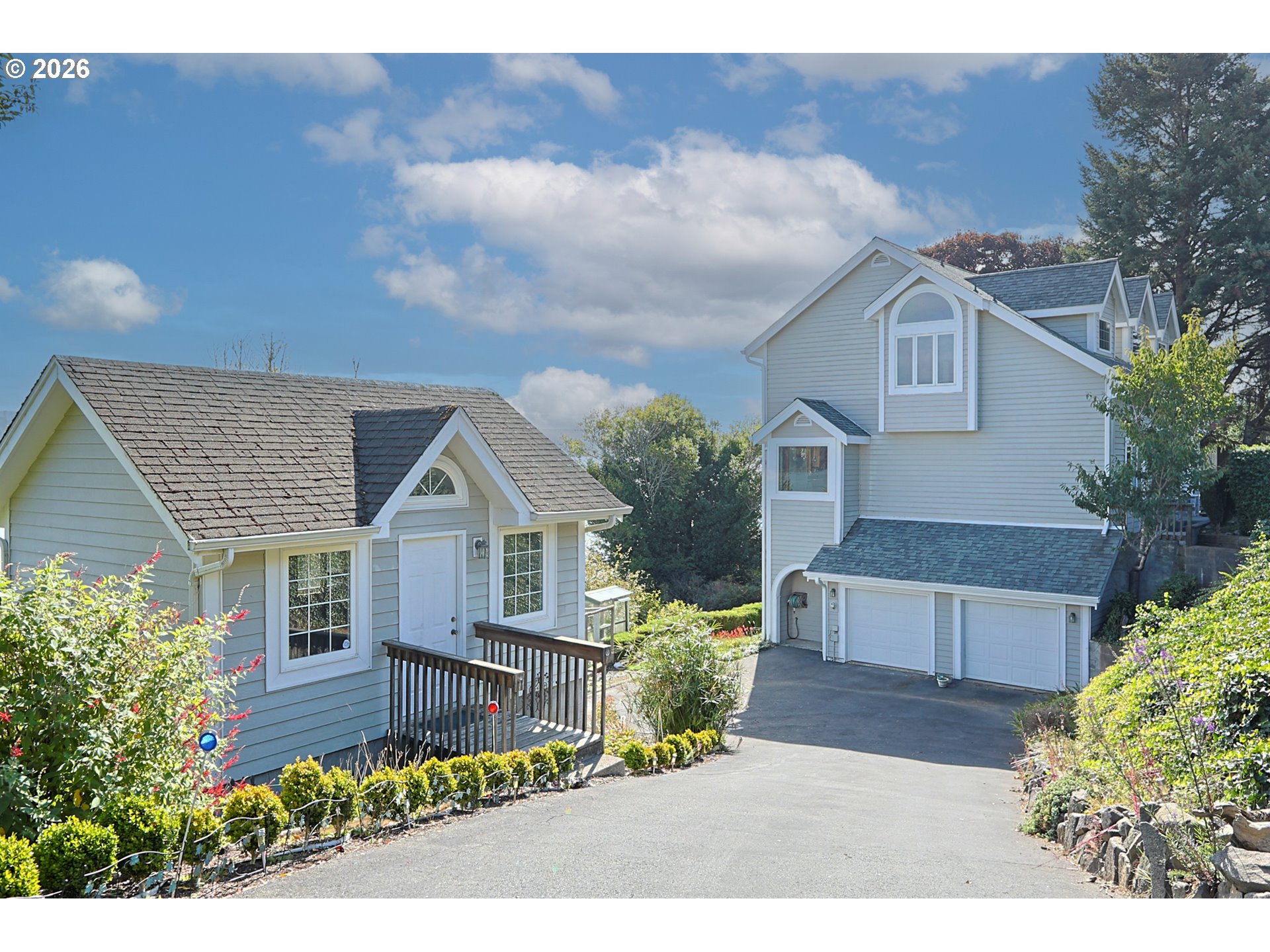 Nestled in the desirable Simpson Heights neighborhood of North Bend, this impressive 3,088-square-foot home offers four bedrooms and two and a half bathrooms, thoughtfully designed to blend comfort, elegance, and coastal charm. Upon entry, soaring vaulted ceilings, expansive Andersen windows, and artistic stained-glass accents create a bright, inviting atmosphere while capturing stunning views of Coos Bay from nearly every room. Multiple decks extend the living space outdoors, providing ideal spots to relax and enjoy the surrounding scenery. The main level features an open kitchen, a convenient laundry nook, a comfortable living area, and a cozy bedroom. Upstairs, a welcoming loft leads to the private primary suite, complete with its own balcony, a spa-inspired en-suite bathroom, a walk-in closet, and a versatile bonus room. The lower level offers excellent flexibility, including a second living area, three additional bedrooms, a full bathroom, a private balcony, and direct access to the attached garage—perfect for guests or extended family. Additional highlights include a Heatilator wood fireplace, a heat pump, and a whole-house vacuum system for effortless upkeep. A detached two-story building adds even more value, with a workshop on the ground floor and an open-concept space above ideal for potential in-law quarters or creative use. The whole interior has been newly painted. Located just a few blocks from Ferry Road Park and Winsor Park, this property delivers an exceptional blend of space, quality, and tranquility in a sought-after coastal setting. Home has great southern exposure that provides sunny days all year long.