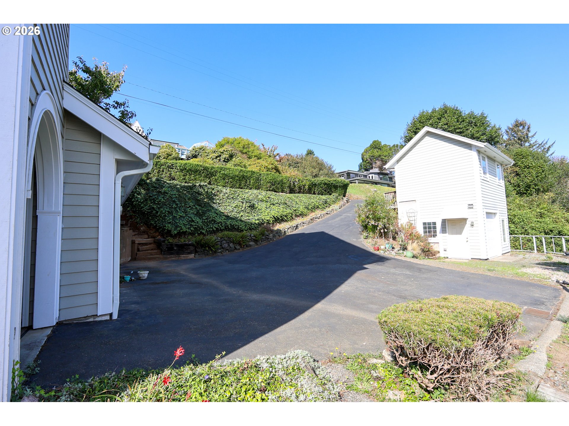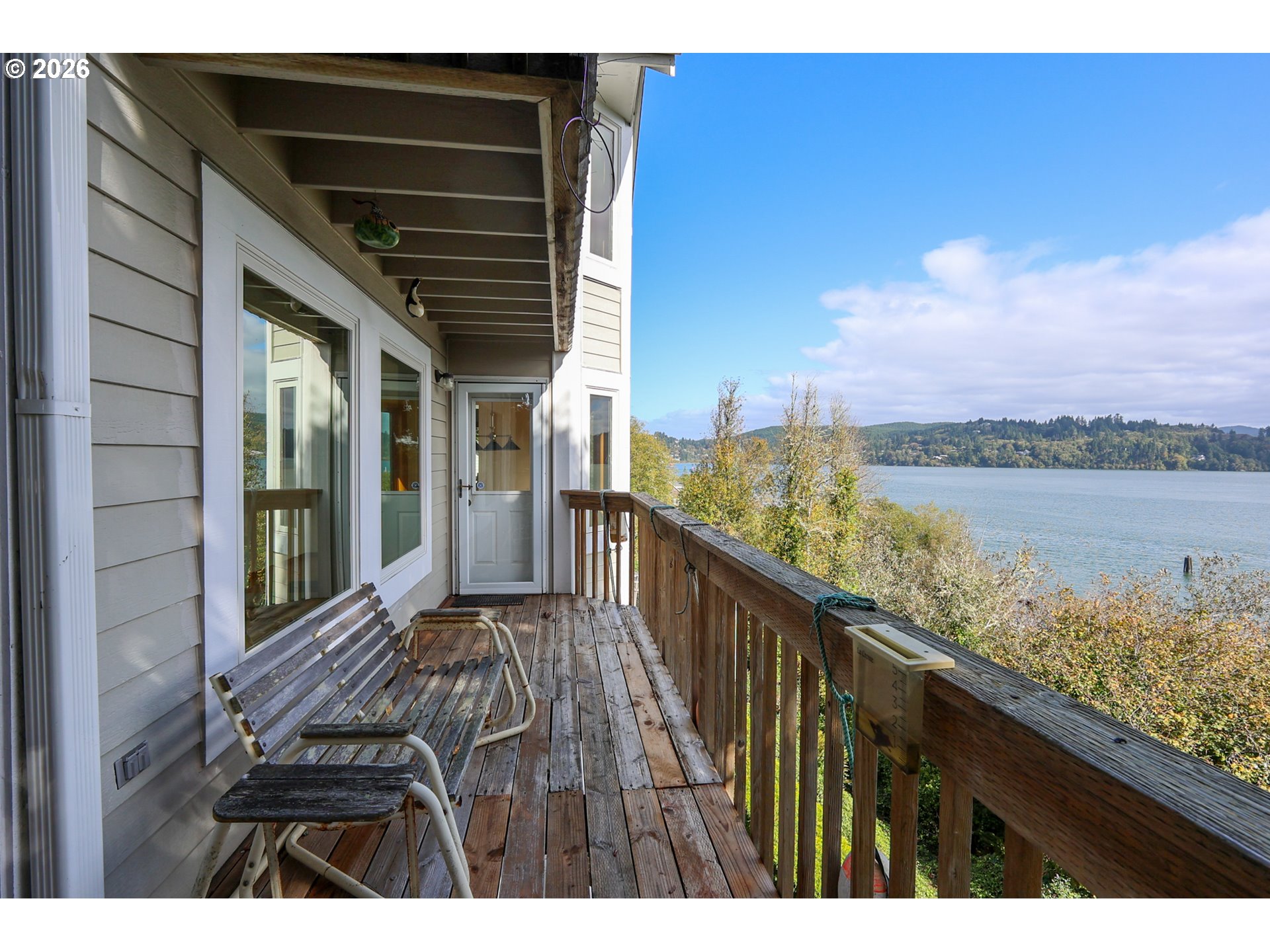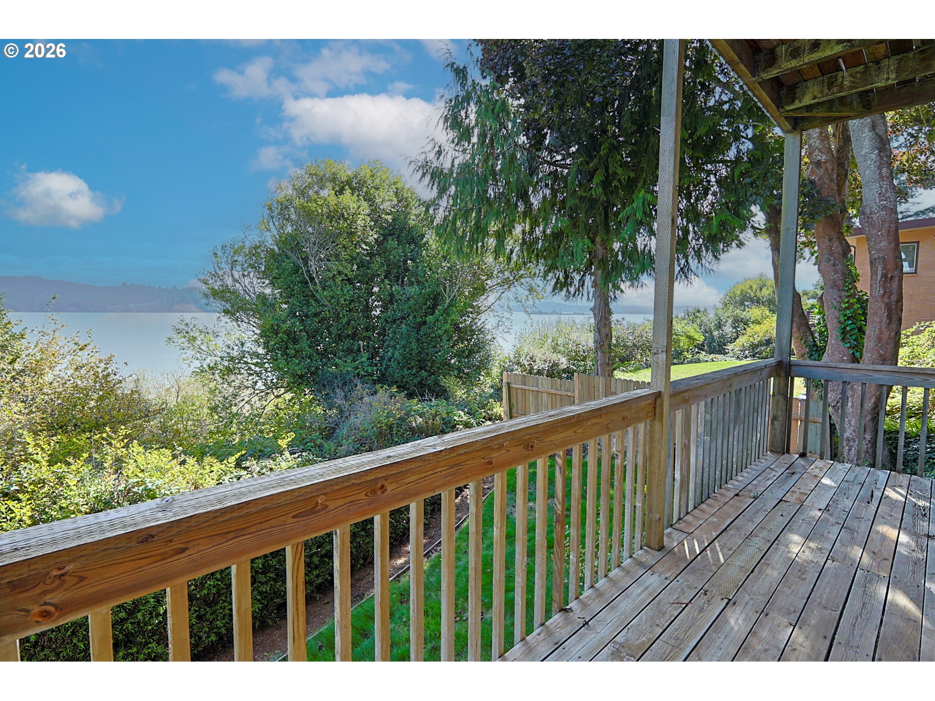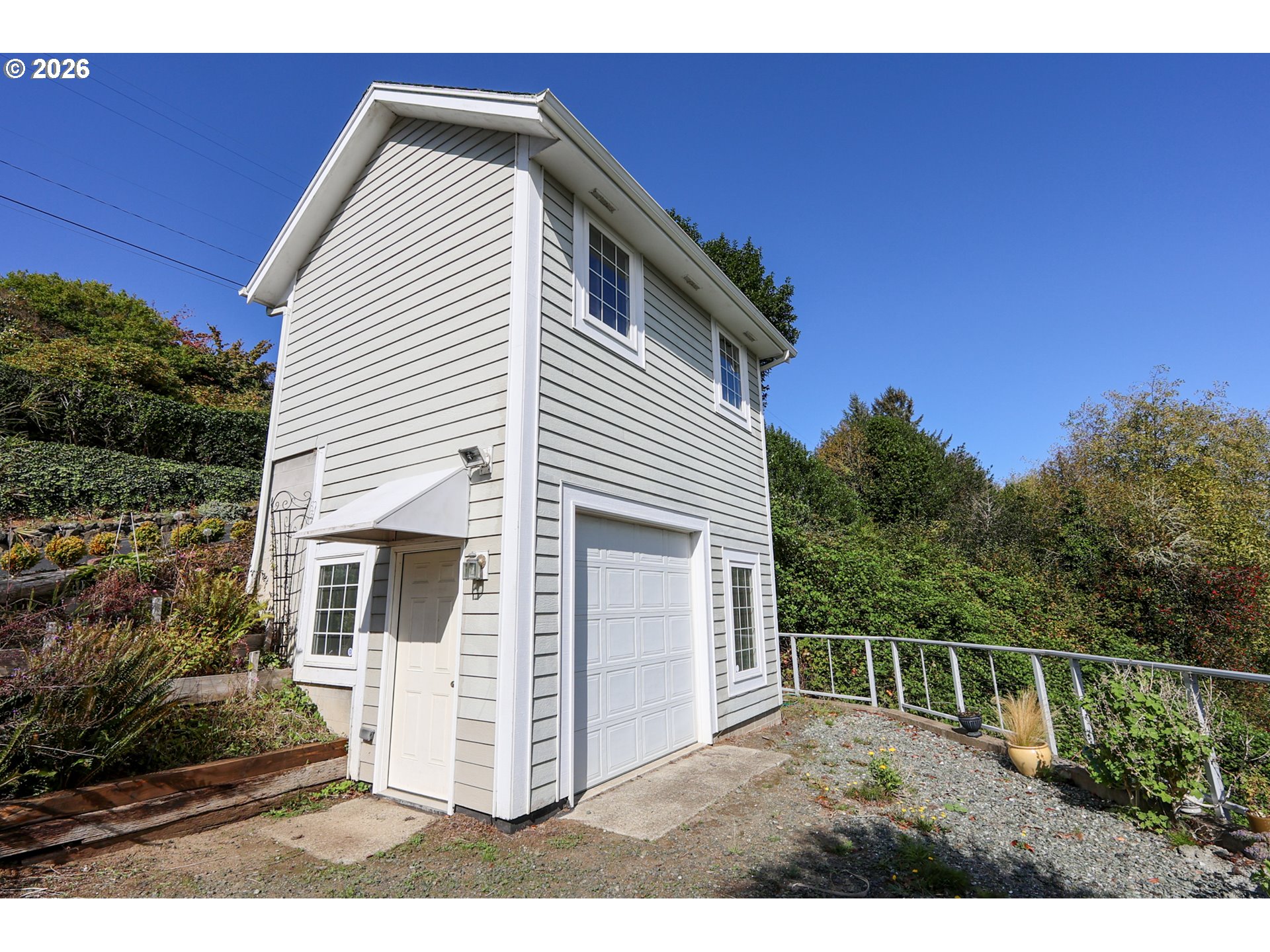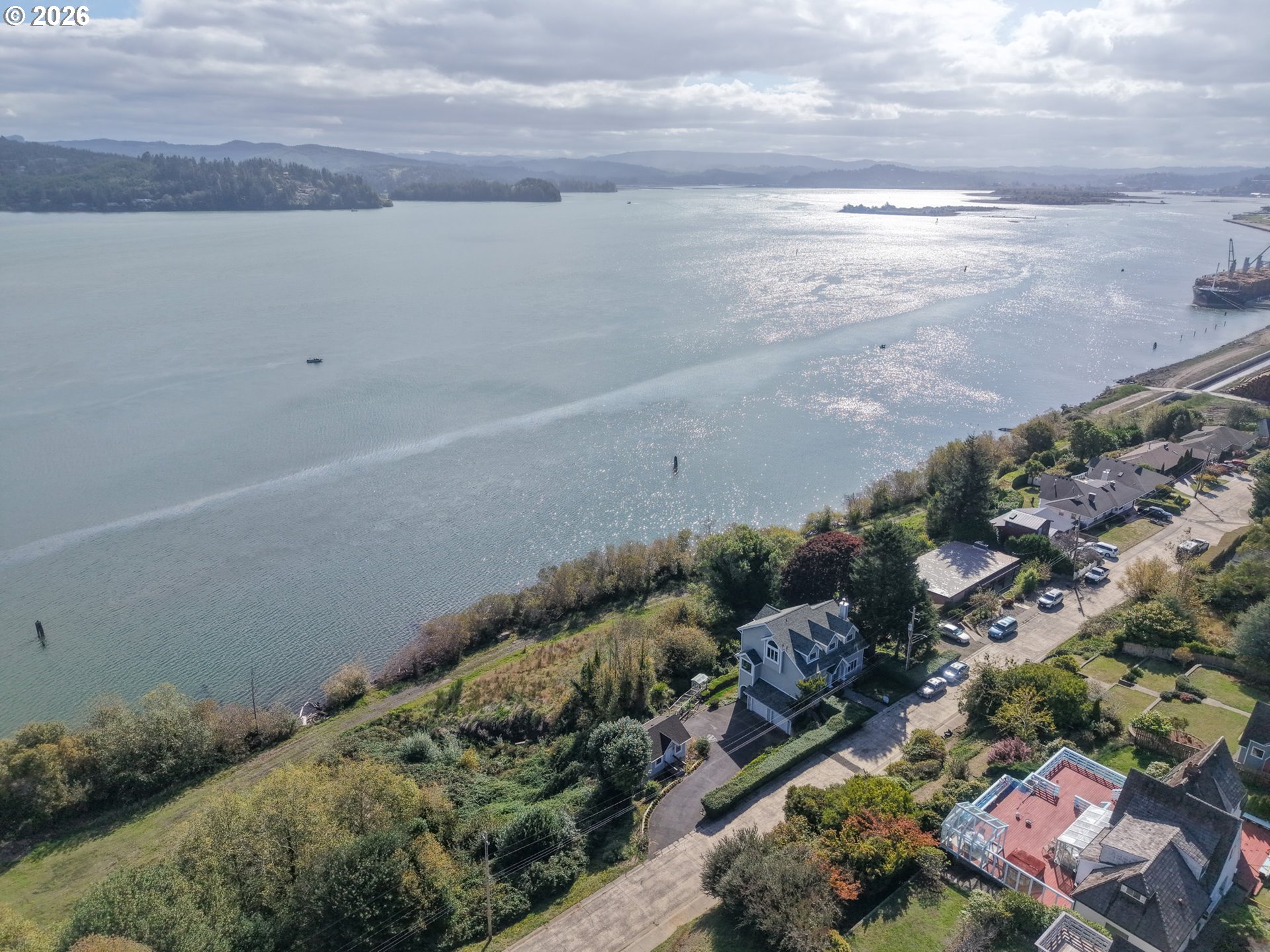 Nestled in the desirable Simpson Heights neighborhood of North Bend, this impressive 3,088-square-foot home offers four bedrooms and two and a half bathrooms, thoughtfully designed to blend comfort, elegance, and coastal charm. Upon entry, soaring vaulted ceilings, expansive Andersen windows, and artistic stained-glass accents create a bright, inviting atmosphere while capturing stunning views of Coos Bay from nearly every room. Multiple decks extend the living space outdoors, providing ideal spots to relax and enjoy the surrounding scenery. The main level features an open kitchen, a convenient laundry nook, a comfortable living area, and a cozy bedroom. Upstairs, a welcoming loft leads to the private primary suite, complete with its own balcony, a spa-inspired en-suite bathroom, a walk-in closet, and a versatile bonus room. The lower level offers excellent flexibility, including a second living area, three additional bedrooms, a full bathroom, a private balcony, and direct access to the attached garage—perfect for guests or extended family. Additional highlights include a Heatilator wood fireplace, a heat pump, and a whole-house vacuum system for effortless upkeep. A detached two-story building adds even more value, with a workshop on the ground floor and an open-concept space above ideal for potential in-law quarters or creative use. The whole interior has been newly painted. Located just a few blocks from Ferry Road Park and Winsor Park, this property delivers an exceptional blend of space, quality, and tranquility in a sought-after coastal setting. Home has great southern exposure that provides sunny days all year long.