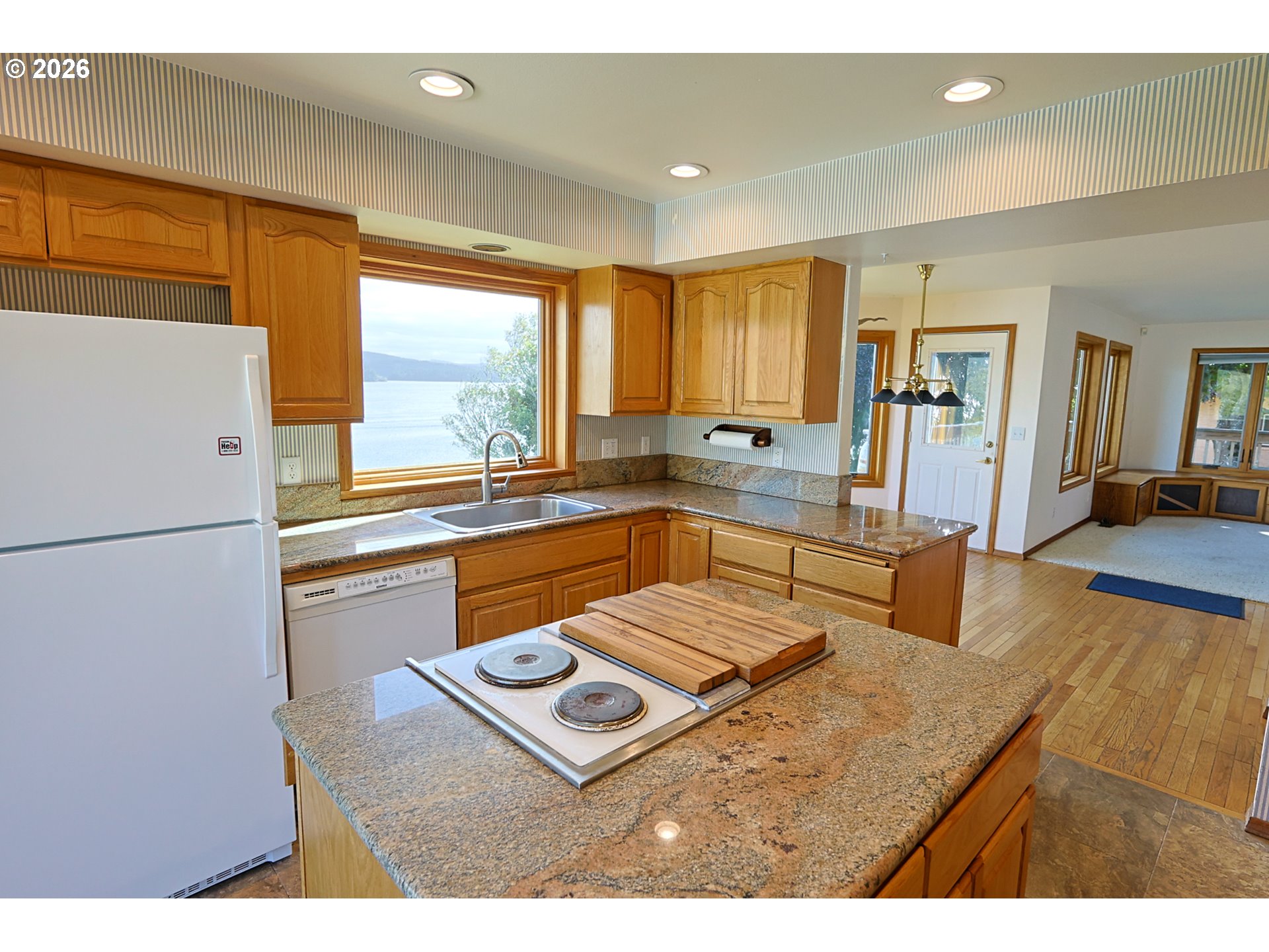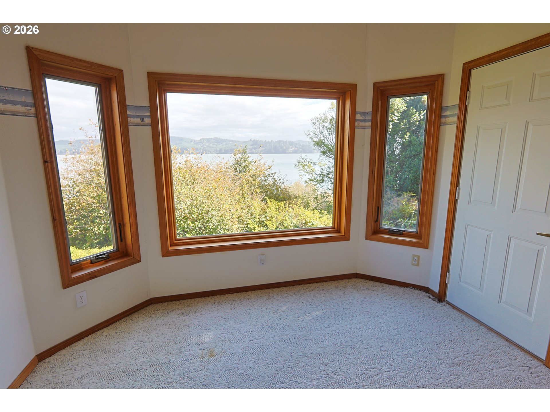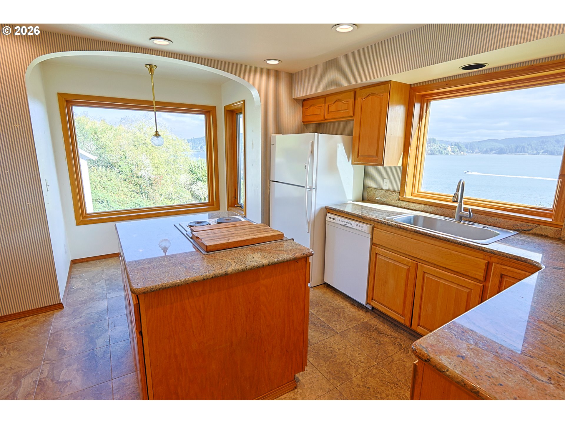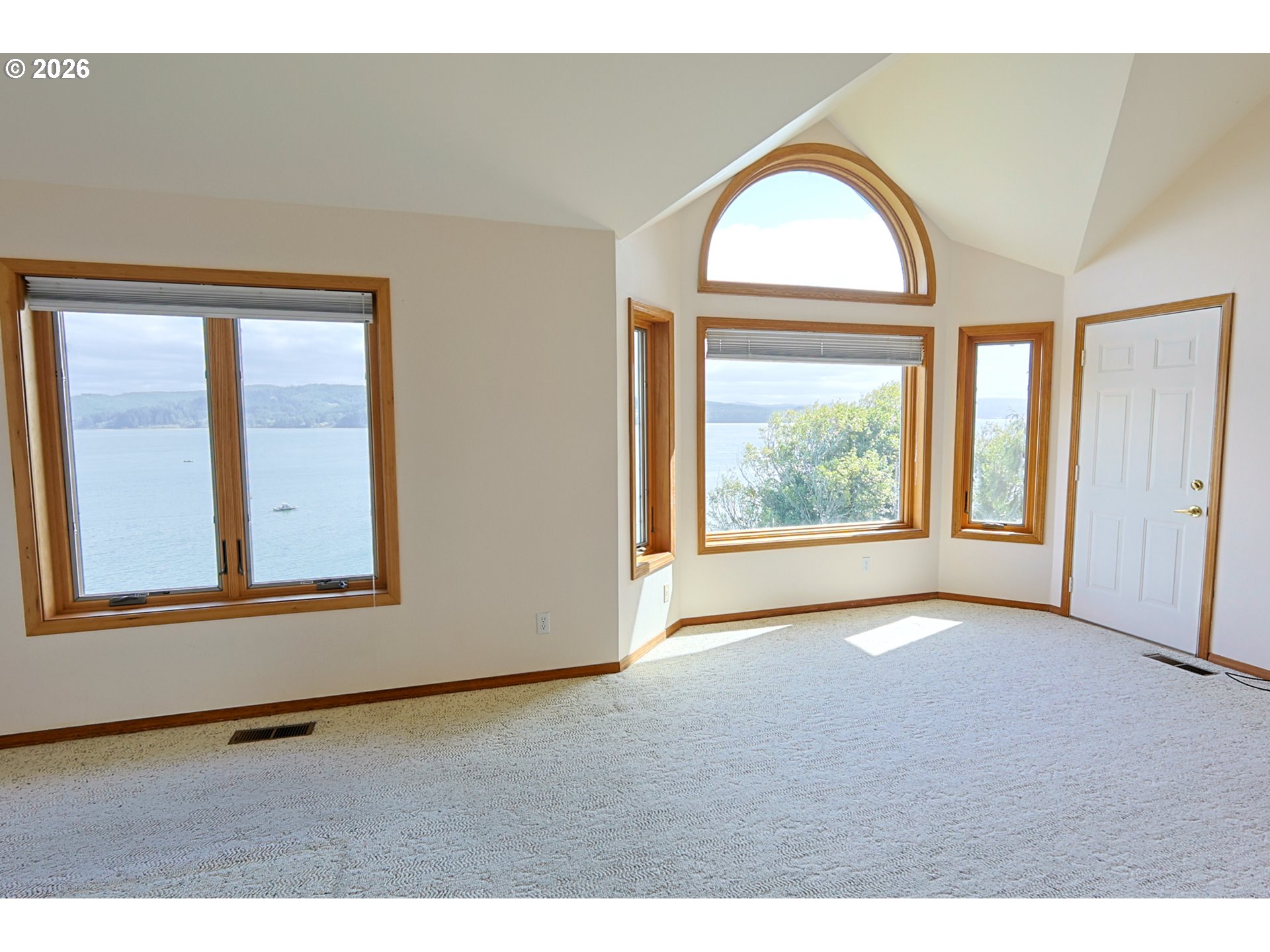 Nestled in the desirable Simpson Heights neighborhood of North Bend, this impressive 3,088-square-foot home offers four bedrooms and two and a half bathrooms, thoughtfully designed to blend comfort, elegance, and coastal charm. Upon entry, soaring vaulted ceilings, expansive Andersen windows, and artistic stained-glass accents create a bright, inviting atmosphere while capturing stunning views of Coos Bay from nearly every room. Multiple decks extend the living space outdoors, providing ideal spots to relax and enjoy the surrounding scenery. The main level features an open kitchen, a convenient laundry nook, a comfortable living area, and a cozy bedroom. Upstairs, a welcoming loft leads to the private primary suite, complete with its own balcony, a spa-inspired en-suite bathroom, a walk-in closet, and a versatile bonus room. The lower level offers excellent flexibility, including a second living area, three additional bedrooms, a full bathroom, a private balcony, and direct access to the attached garage—perfect for guests or extended family. Additional highlights include a Heatilator wood fireplace, a heat pump, and a whole-house vacuum system for effortless upkeep. A detached two-story building adds even more value, with a workshop on the ground floor and an open-concept space above ideal for potential in-law quarters or creative use. The whole interior has been newly painted. Located just a few blocks from Ferry Road Park and Winsor Park, this property delivers an exceptional blend of space, quality, and tranquility in a sought-after coastal setting. Home has great southern exposure that provides sunny days all year long.