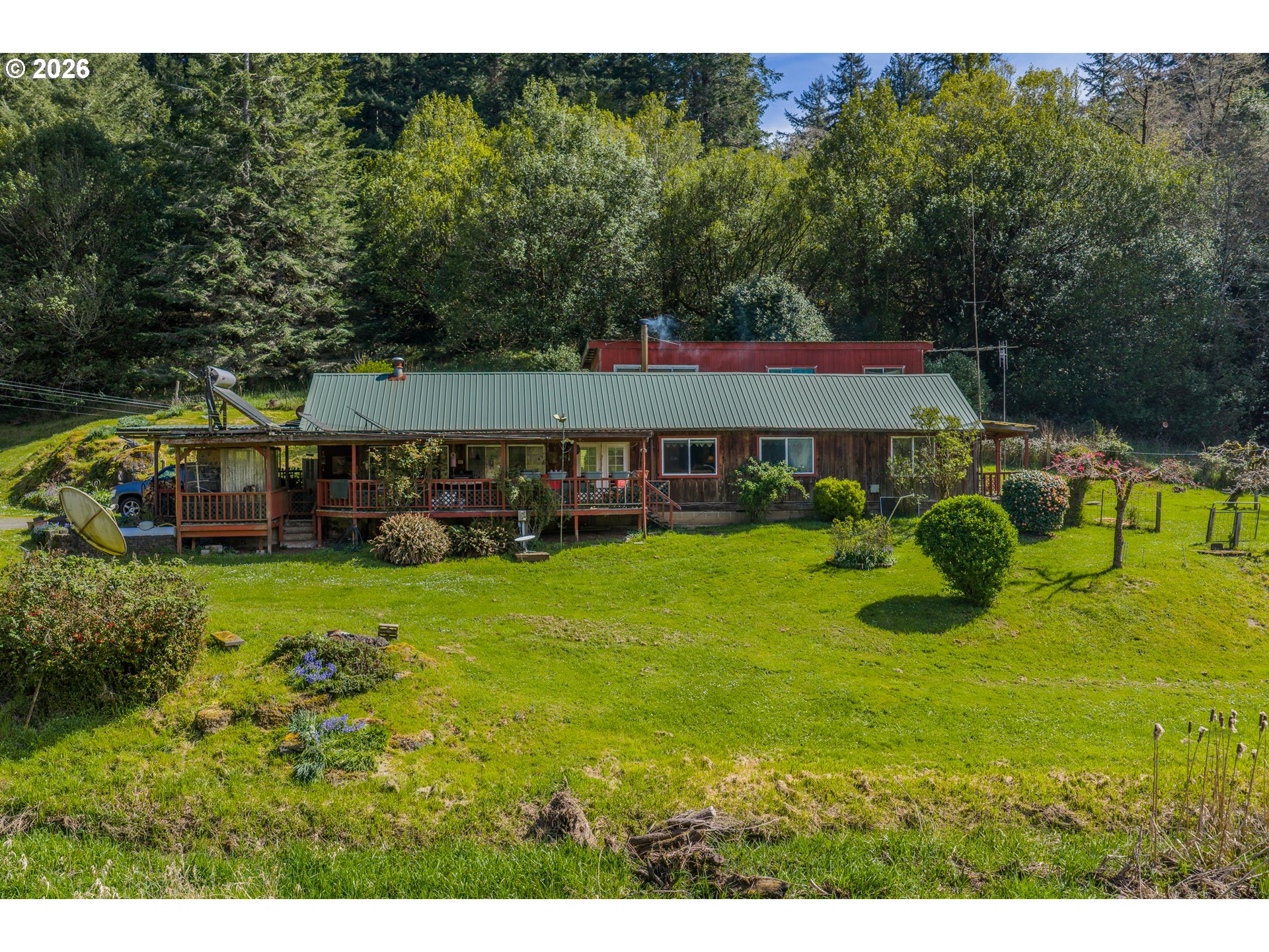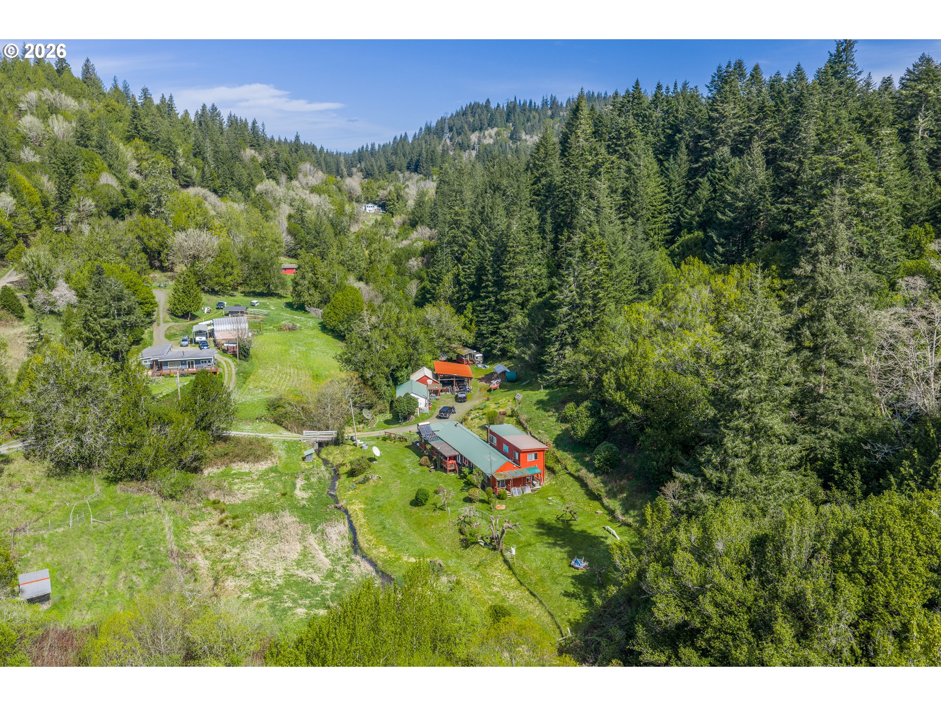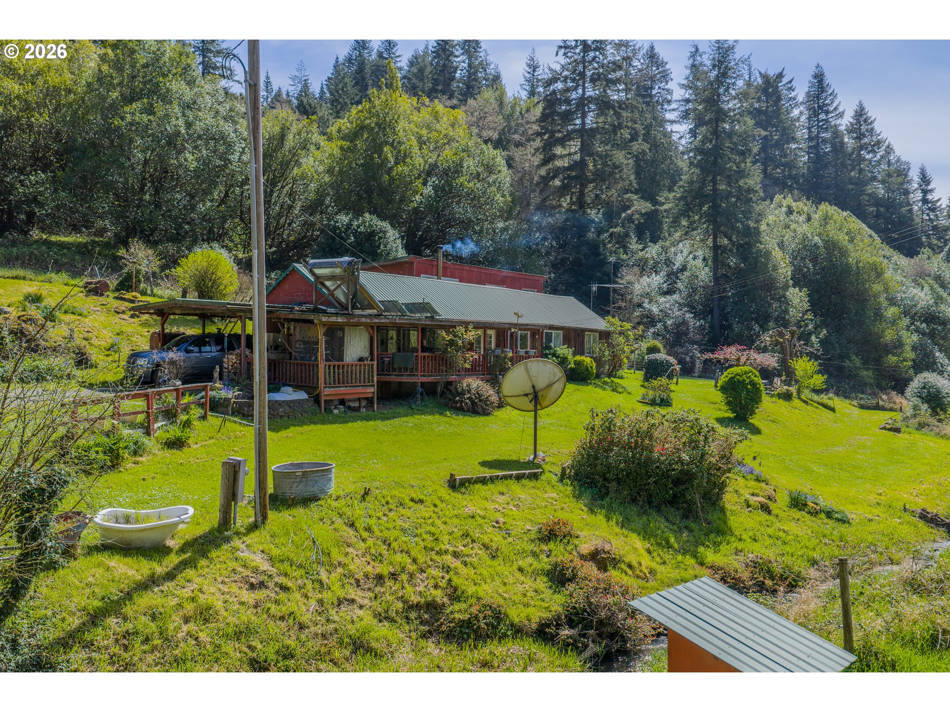 Great Year-Round Creek-Front location with 2 tax lots on 13.78 acres just minutes to Coquille! Glen Aiken Creek flows in front of this 1920s home with 3 bed/1 bath and extra bonus rooms with a friendly eat-in country kitchen. Water rights for 0.8 acre irrigation and domestic use for one family. 10-year-old large woodstove and oil monitor heat. Back porch/laundry area with canning storage. Beautiful timbered hillside behind the home. Storage building and large carport. Zoned RR-5, check with appropriate county planning for details about possible uses for the extra tax lot.