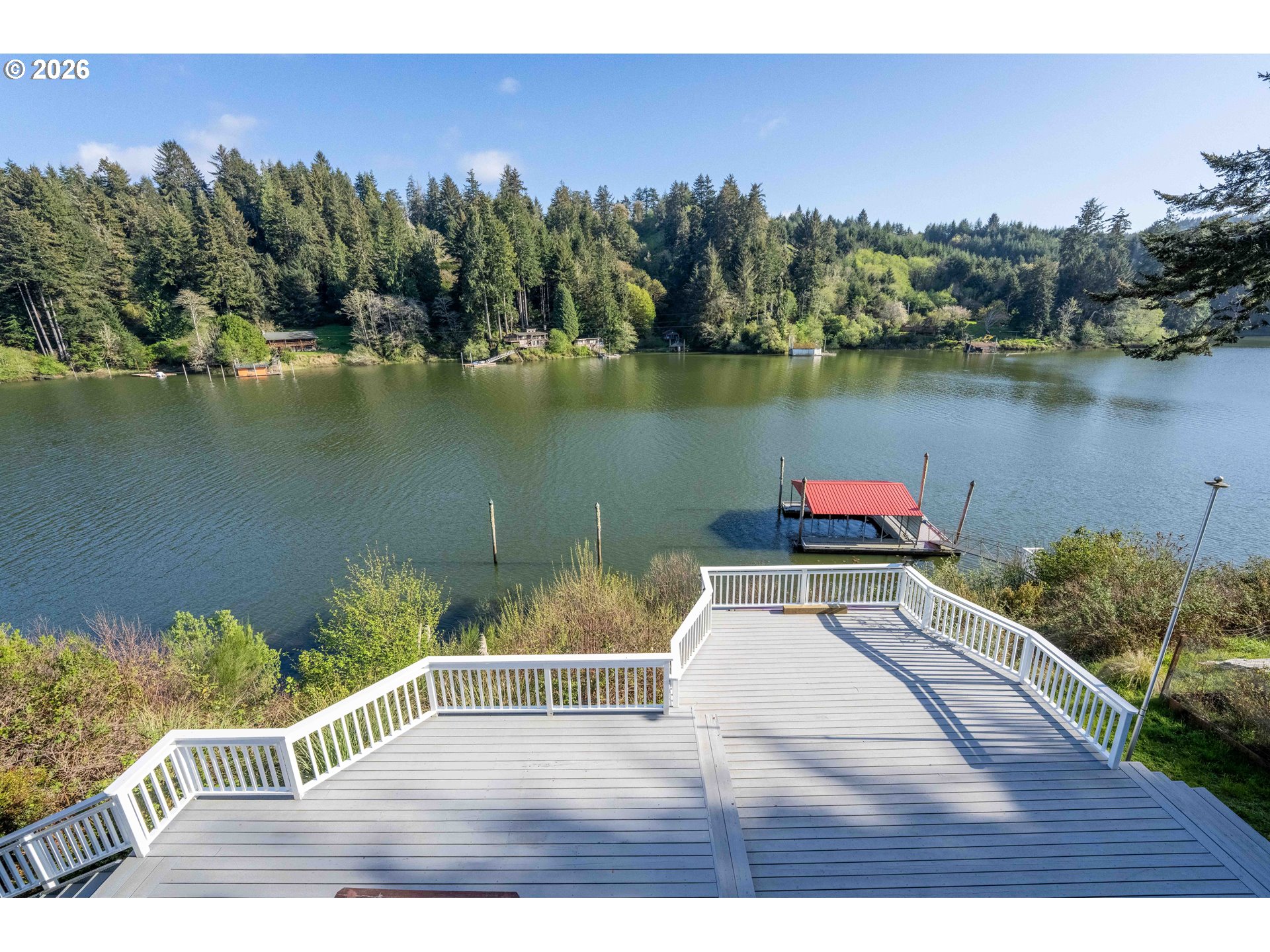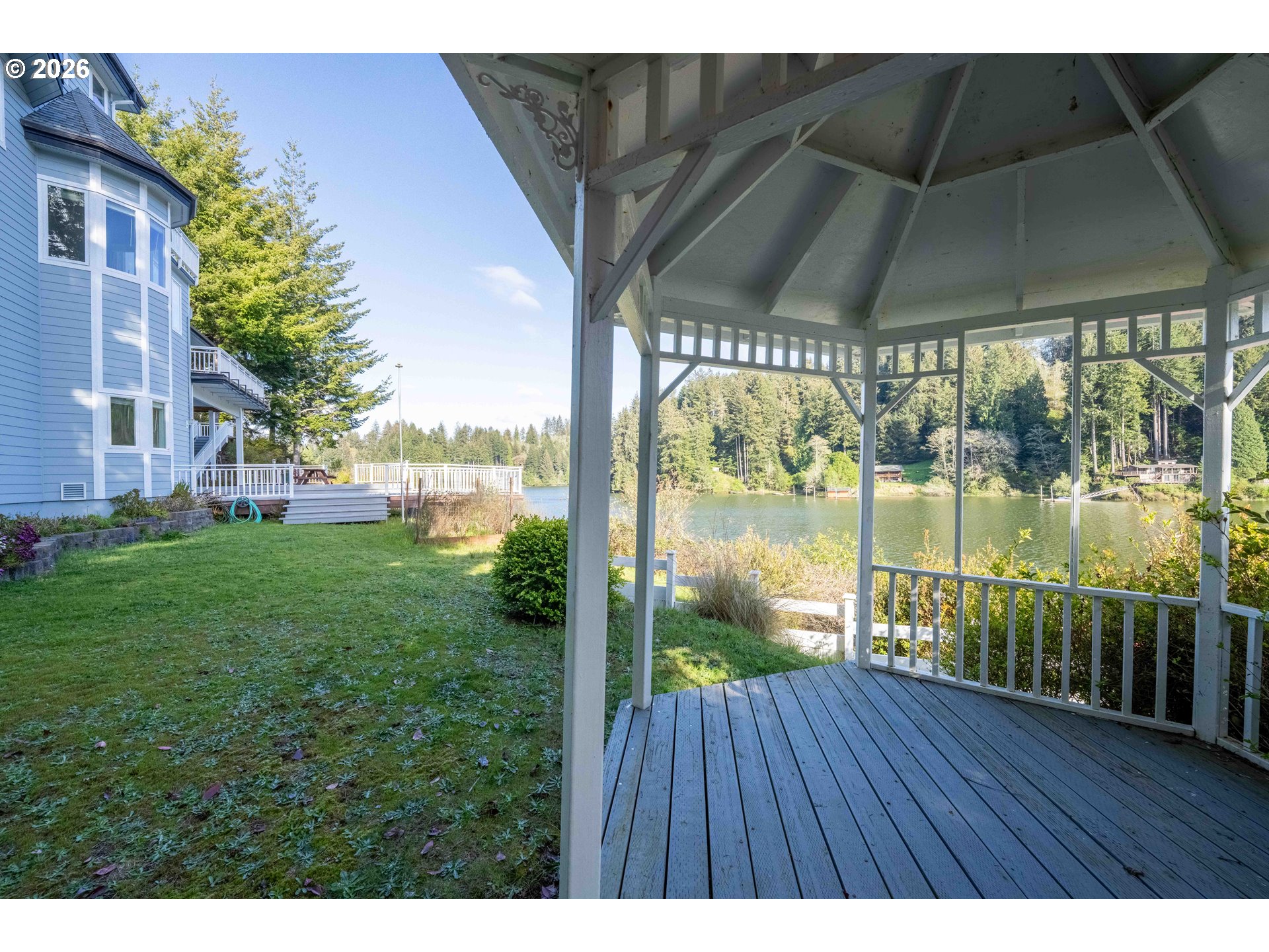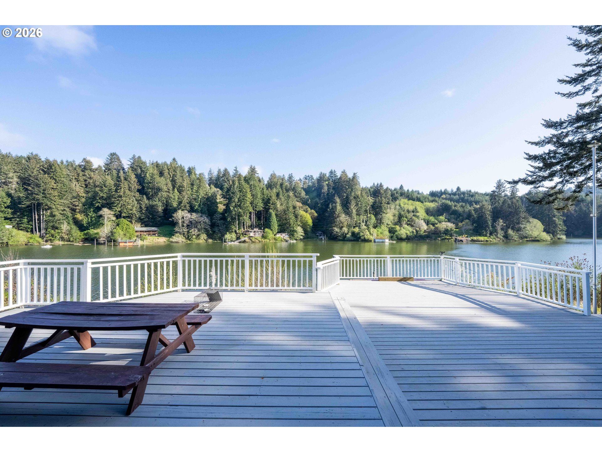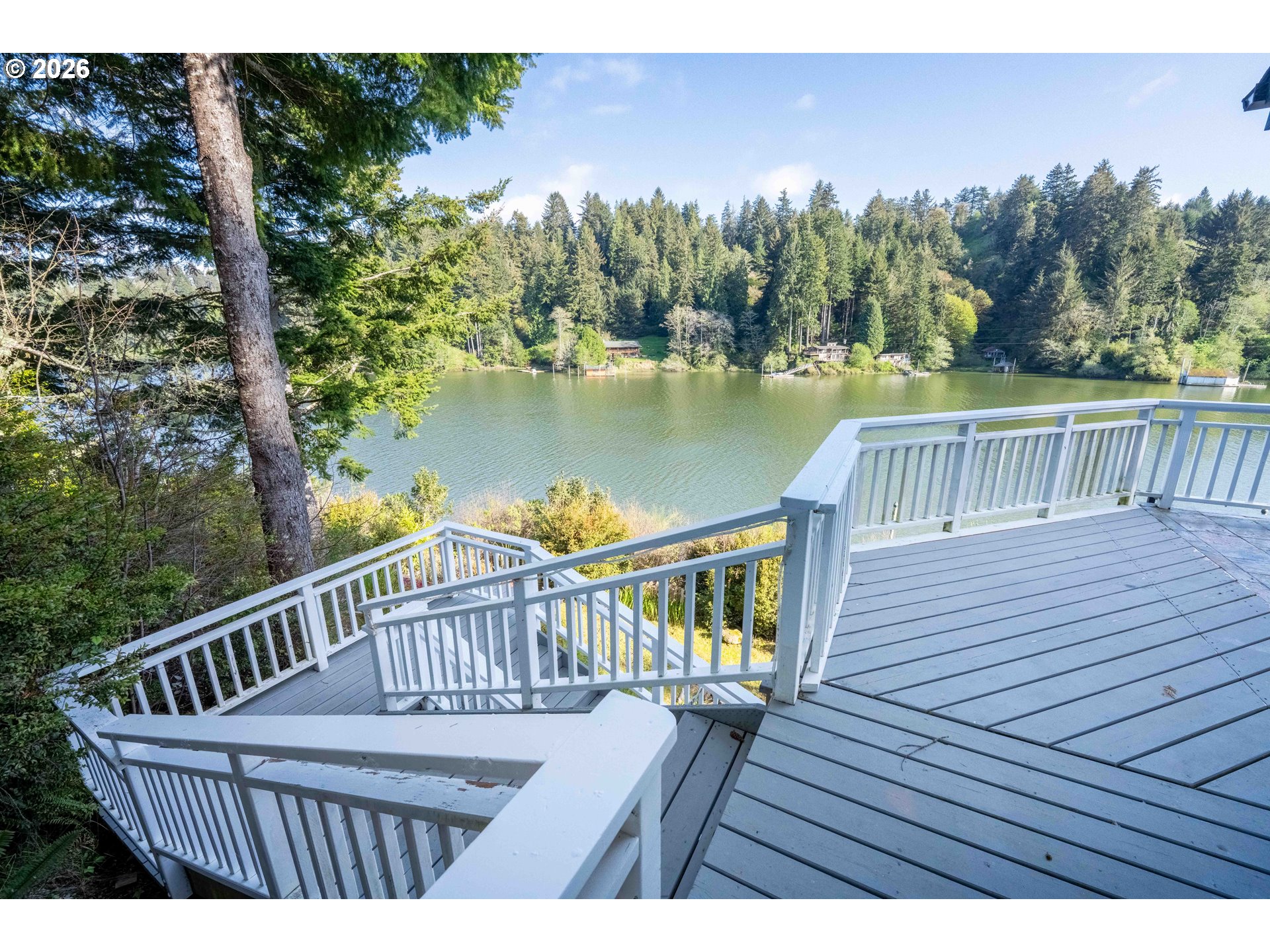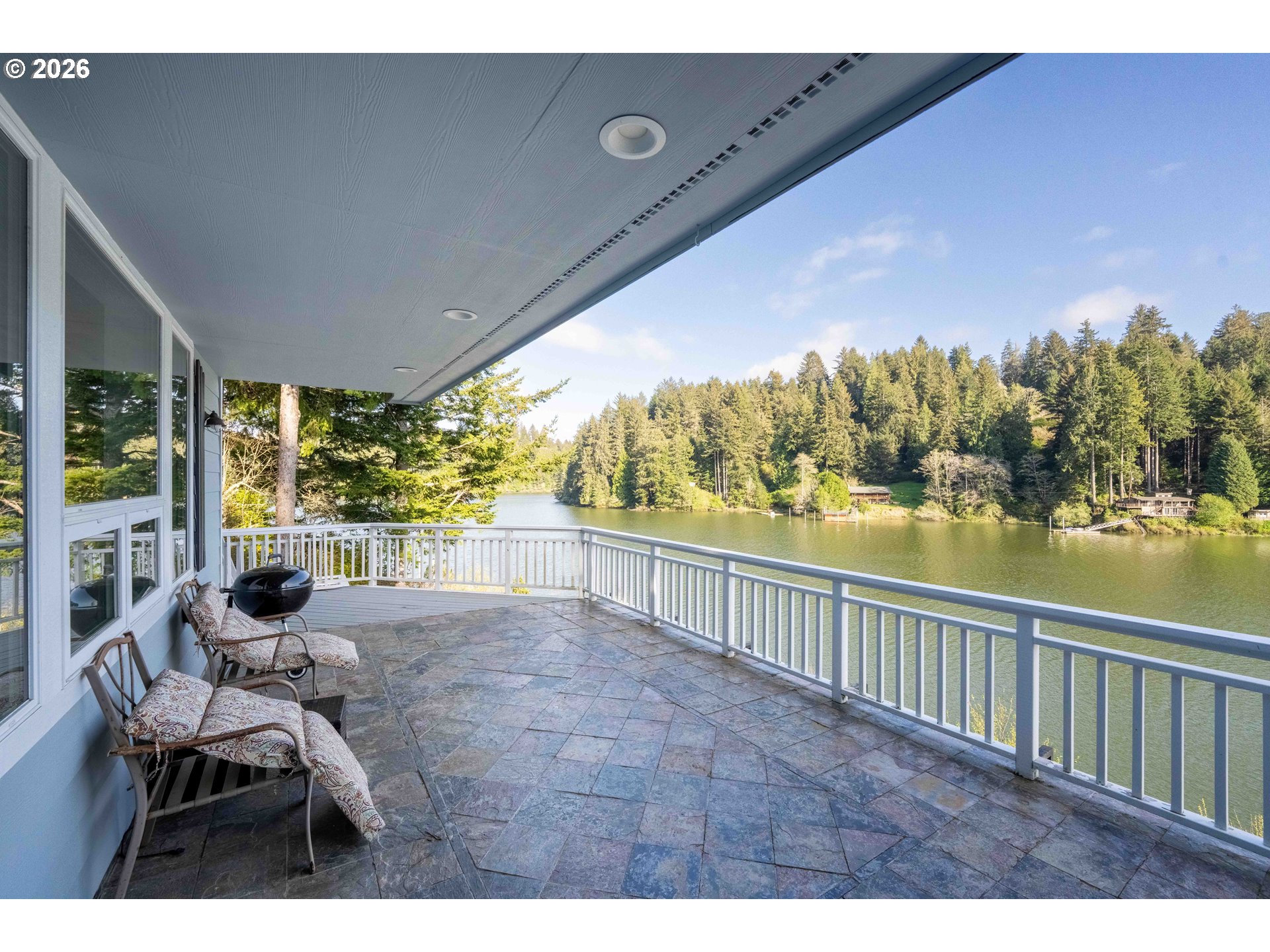 This stunning 4,500 sq. ft. home seamlessly blends natural beauty with sophisticated design. Highlights include Myrtlewood floors, vaulted Canadian Red Cedar ceilings, and an inviting stone entrance. Upon entering, you'll be greeted by spectacular lake views that flow into the grand room with a cozy fireplace and continue throughout most of the home.The gourmet kitchen features two sinks, dual ovens, a gas cooktop with a pot filler, granite countertops, and a pantry. Bathrooms boast heated tile floors, and each bedroom has an en-suite, along with a guest bathroom for visitors. Four versatile sitting areas provide ample space for relaxation, while a cedar-topped wet bar enhances entertainment. Built-in storage and laundry facilities are available on both levels.An additional dwelling unit (ADU) accommodates one large bed and three small beds in a built-in bunk, perfect for guests or rental income. The recreation room is ideal for fitness and leisure activities, with a partially finished basement offering extra storage and a potential wine cellar.Outside, enjoy lakefront decks, a gazebo, fruit and maple trees, and a pond with a fountain. Outdoor amenities include a 1,000 sq. ft. storage barn, a water and electric-equipped tool shed, a two-car garage, and a pavilion-style boathouse. The lake provides excellent fishing opportunities for trout, salmon, bass, steelhead, perch, and catfish. Located just 2 miles from shopping and dining and 10 miles from dunes, this property offers tranquility, functionality, and recreation. County-approved for vacation rentals.