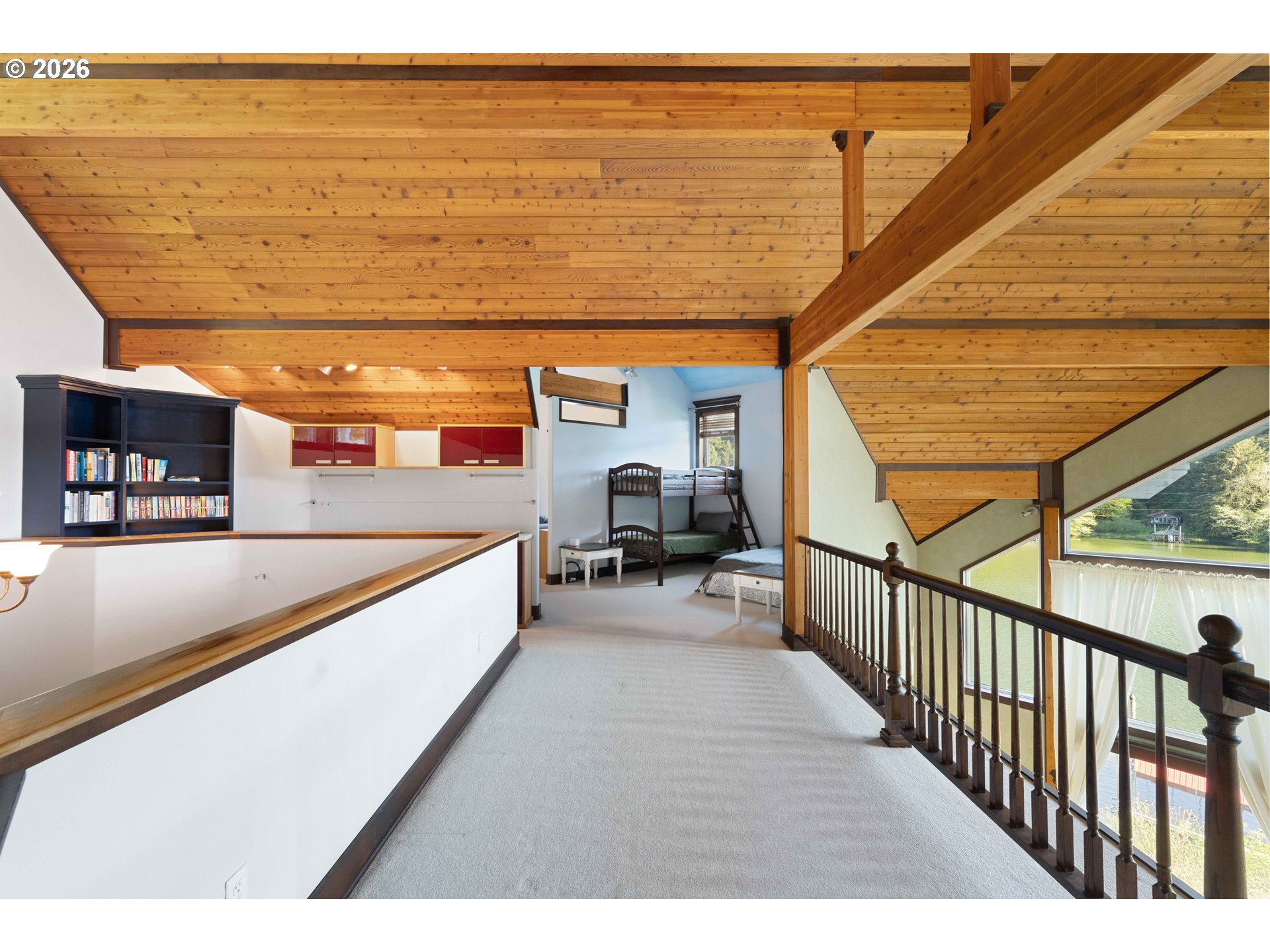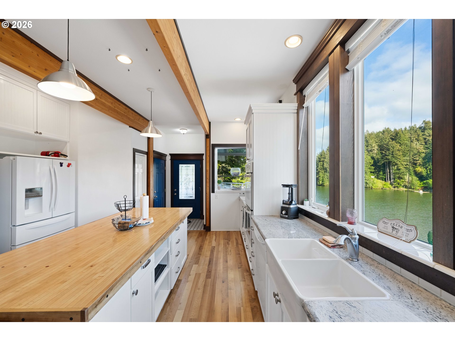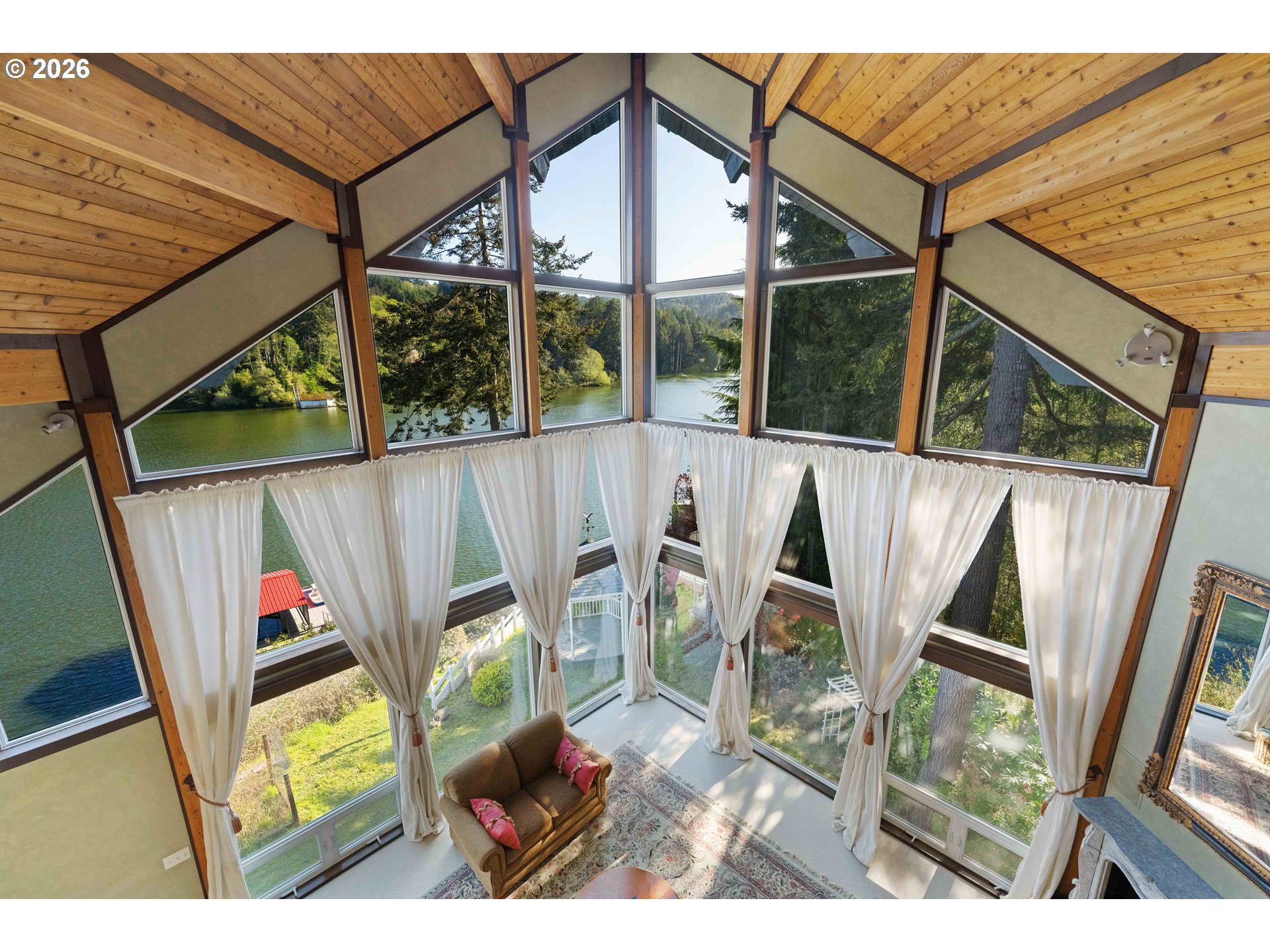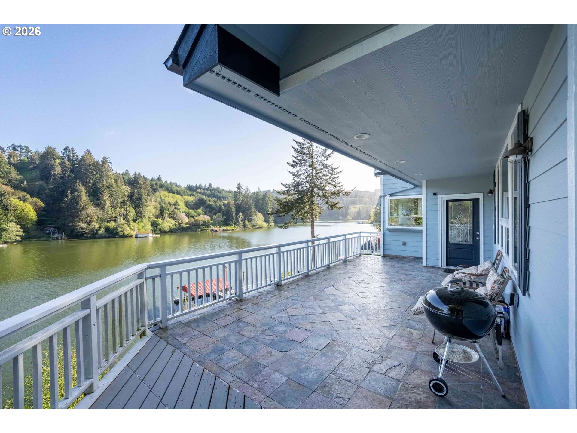 This stunning 4,500 sq. ft. home seamlessly blends natural beauty with sophisticated design. Highlights include Myrtlewood floors, vaulted Canadian Red Cedar ceilings, and an inviting stone entrance. Upon entering, you'll be greeted by spectacular lake views that flow into the grand room with a cozy fireplace and continue throughout most of the home.The gourmet kitchen features two sinks, dual ovens, a gas cooktop with a pot filler, granite countertops, and a pantry. Bathrooms boast heated tile floors, and each bedroom has an en-suite, along with a guest bathroom for visitors. Four versatile sitting areas provide ample space for relaxation, while a cedar-topped wet bar enhances entertainment. Built-in storage and laundry facilities are available on both levels.An additional dwelling unit (ADU) accommodates one large bed and three small beds in a built-in bunk, perfect for guests or rental income. The recreation room is ideal for fitness and leisure activities, with a partially finished basement offering extra storage and a potential wine cellar.Outside, enjoy lakefront decks, a gazebo, fruit and maple trees, and a pond with a fountain. Outdoor amenities include a 1,000 sq. ft. storage barn, a water and electric-equipped tool shed, a two-car garage, and a pavilion-style boathouse. The lake provides excellent fishing opportunities for trout, salmon, bass, steelhead, perch, and catfish. Located just 2 miles from shopping and dining and 10 miles from dunes, this property offers tranquility, functionality, and recreation. County-approved for vacation rentals.