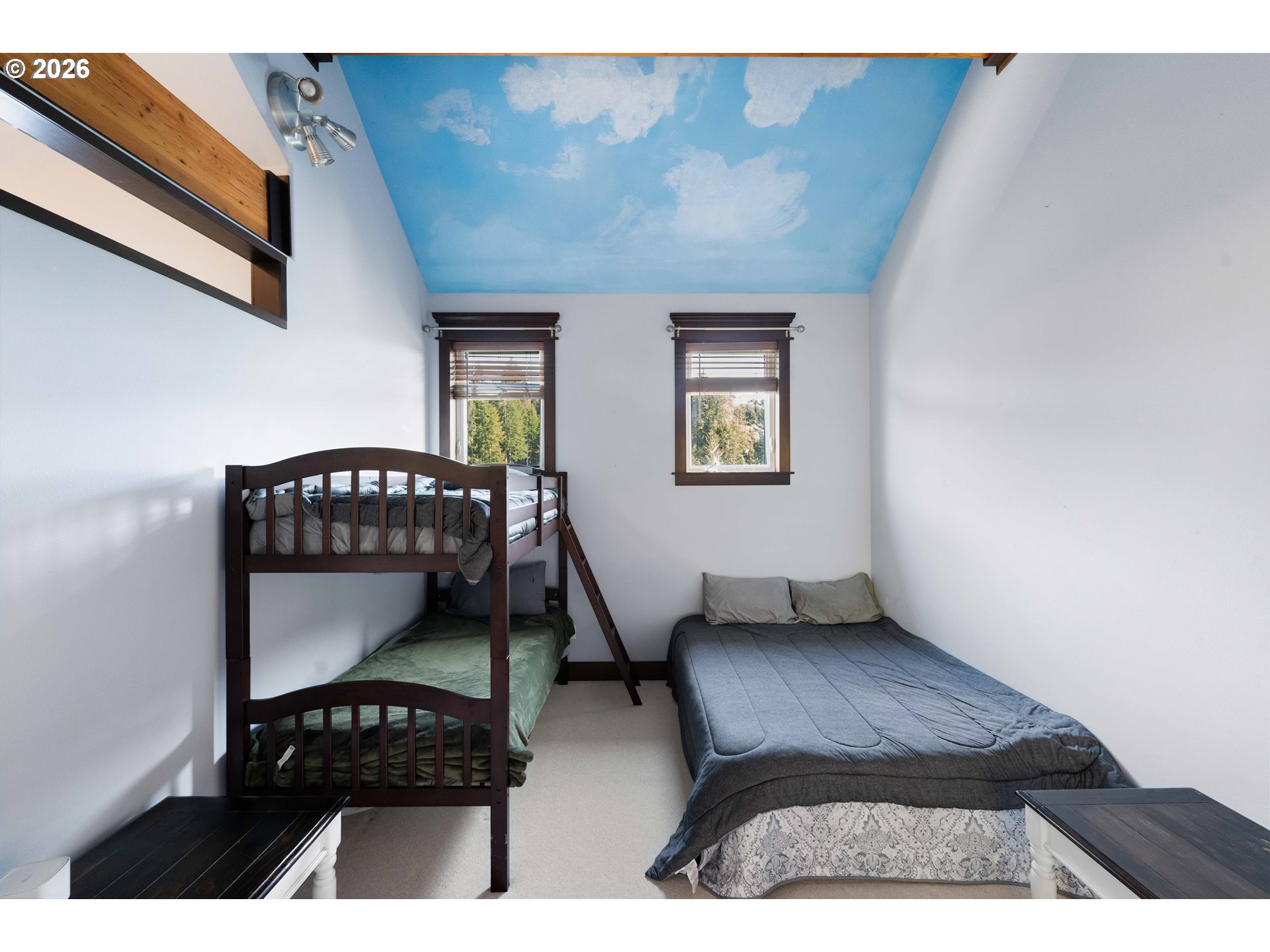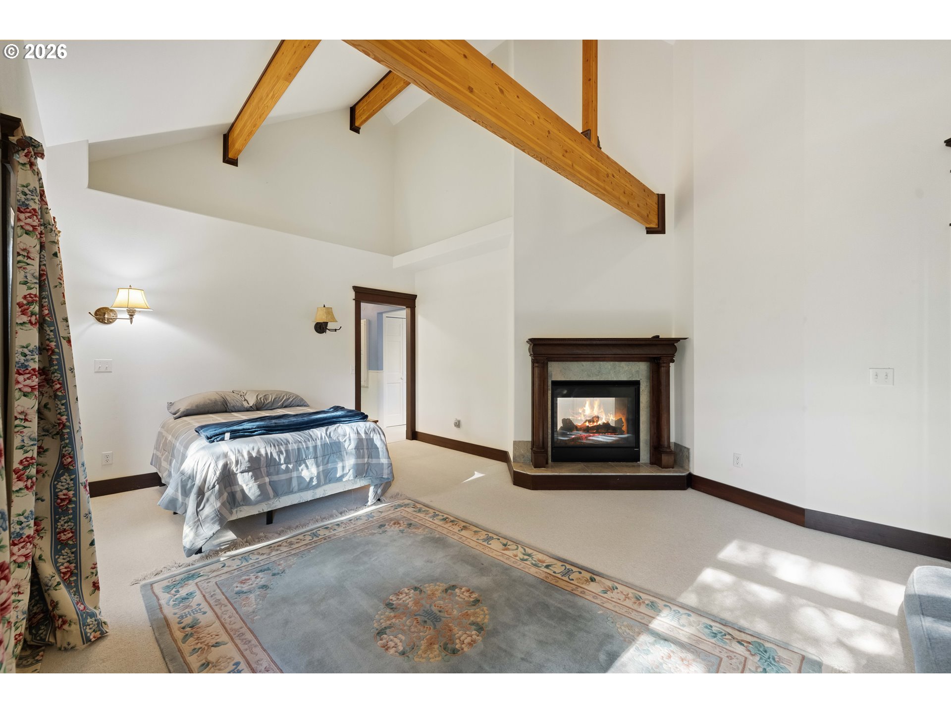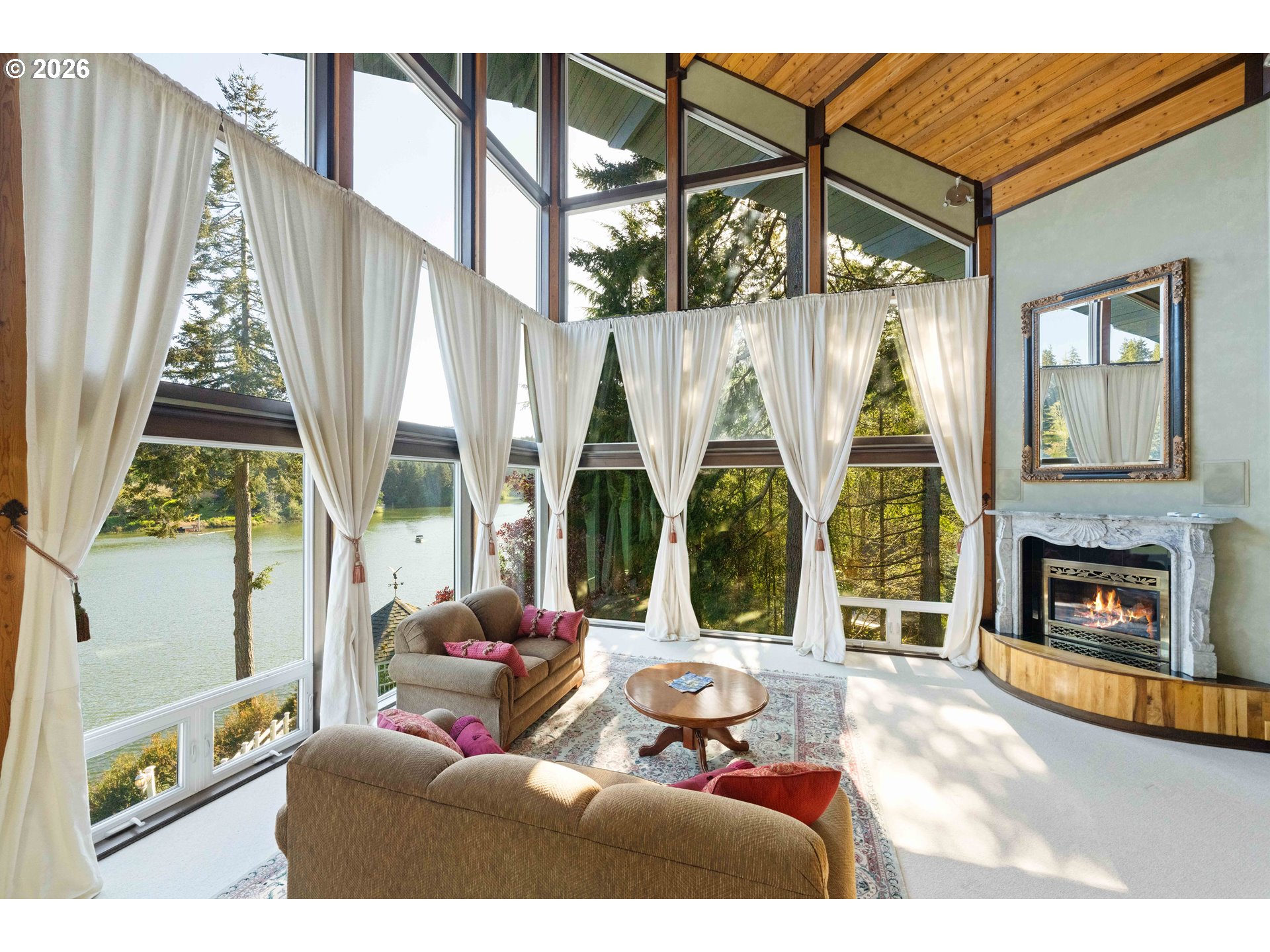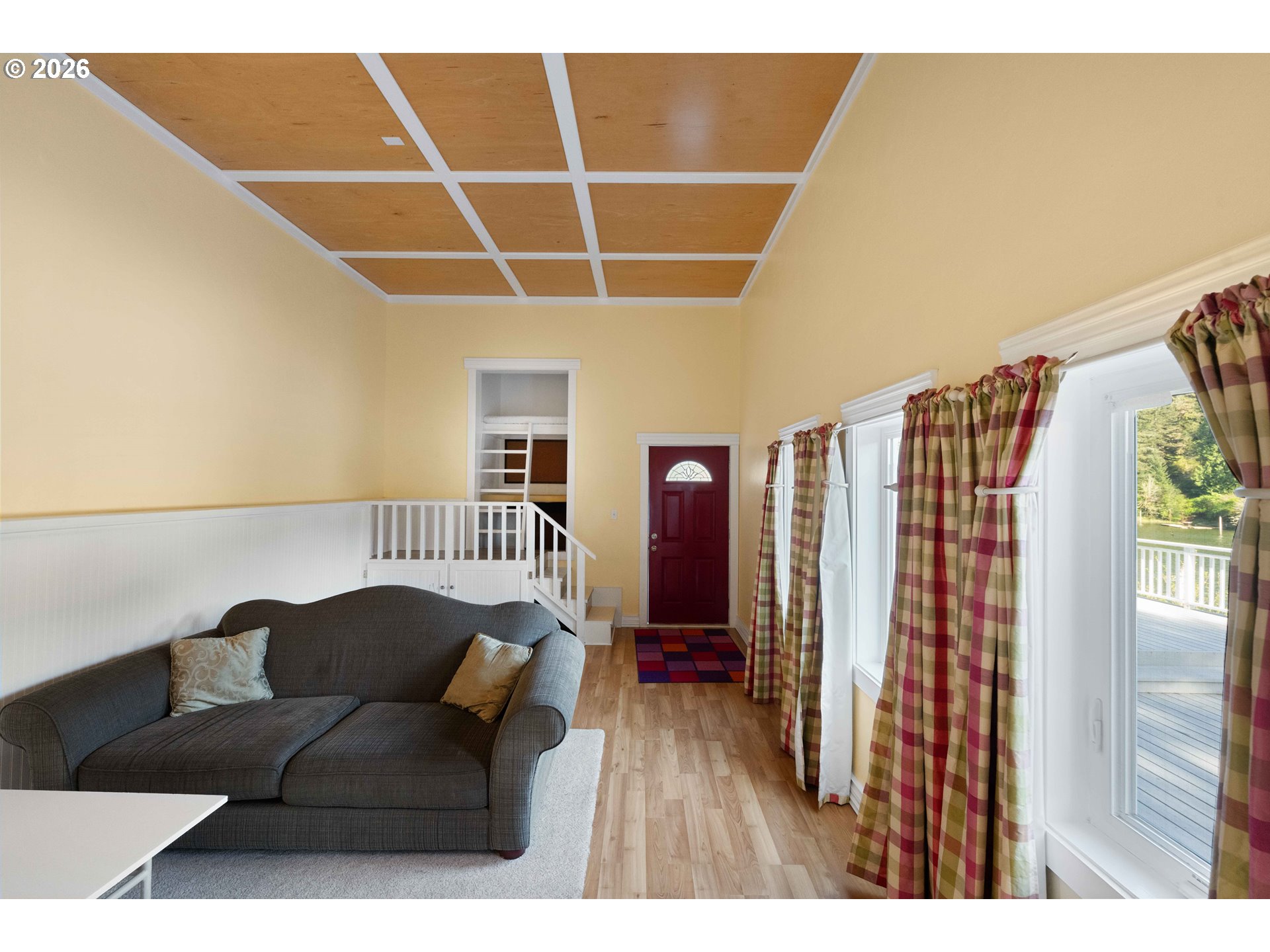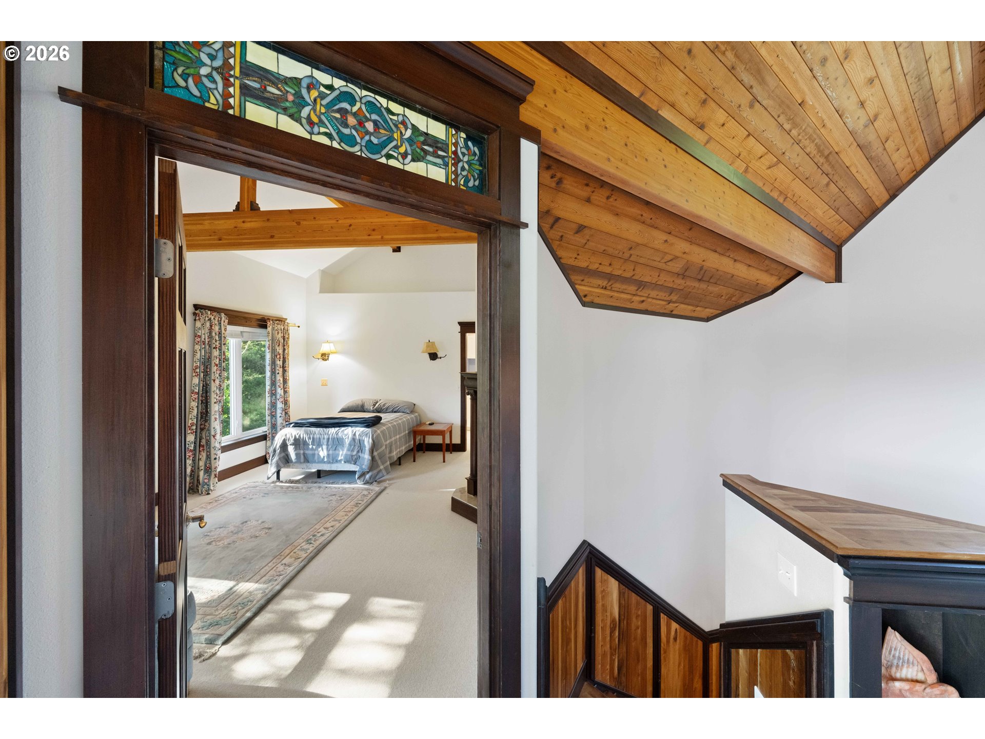 This stunning 4,500 sq. ft. home seamlessly blends natural beauty with sophisticated design. Highlights include Myrtlewood floors, vaulted Canadian Red Cedar ceilings, and an inviting stone entrance. Upon entering, you'll be greeted by spectacular lake views that flow into the grand room with a cozy fireplace and continue throughout most of the home.The gourmet kitchen features two sinks, dual ovens, a gas cooktop with a pot filler, granite countertops, and a pantry. Bathrooms boast heated tile floors, and each bedroom has an en-suite, along with a guest bathroom for visitors. Four versatile sitting areas provide ample space for relaxation, while a cedar-topped wet bar enhances entertainment. Built-in storage and laundry facilities are available on both levels.An additional dwelling unit (ADU) accommodates one large bed and three small beds in a built-in bunk, perfect for guests or rental income. The recreation room is ideal for fitness and leisure activities, with a partially finished basement offering extra storage and a potential wine cellar.Outside, enjoy lakefront decks, a gazebo, fruit and maple trees, and a pond with a fountain. Outdoor amenities include a 1,000 sq. ft. storage barn, a water and electric-equipped tool shed, a two-car garage, and a pavilion-style boathouse. The lake provides excellent fishing opportunities for trout, salmon, bass, steelhead, perch, and catfish. Located just 2 miles from shopping and dining and 10 miles from dunes, this property offers tranquility, functionality, and recreation. County-approved for vacation rentals.