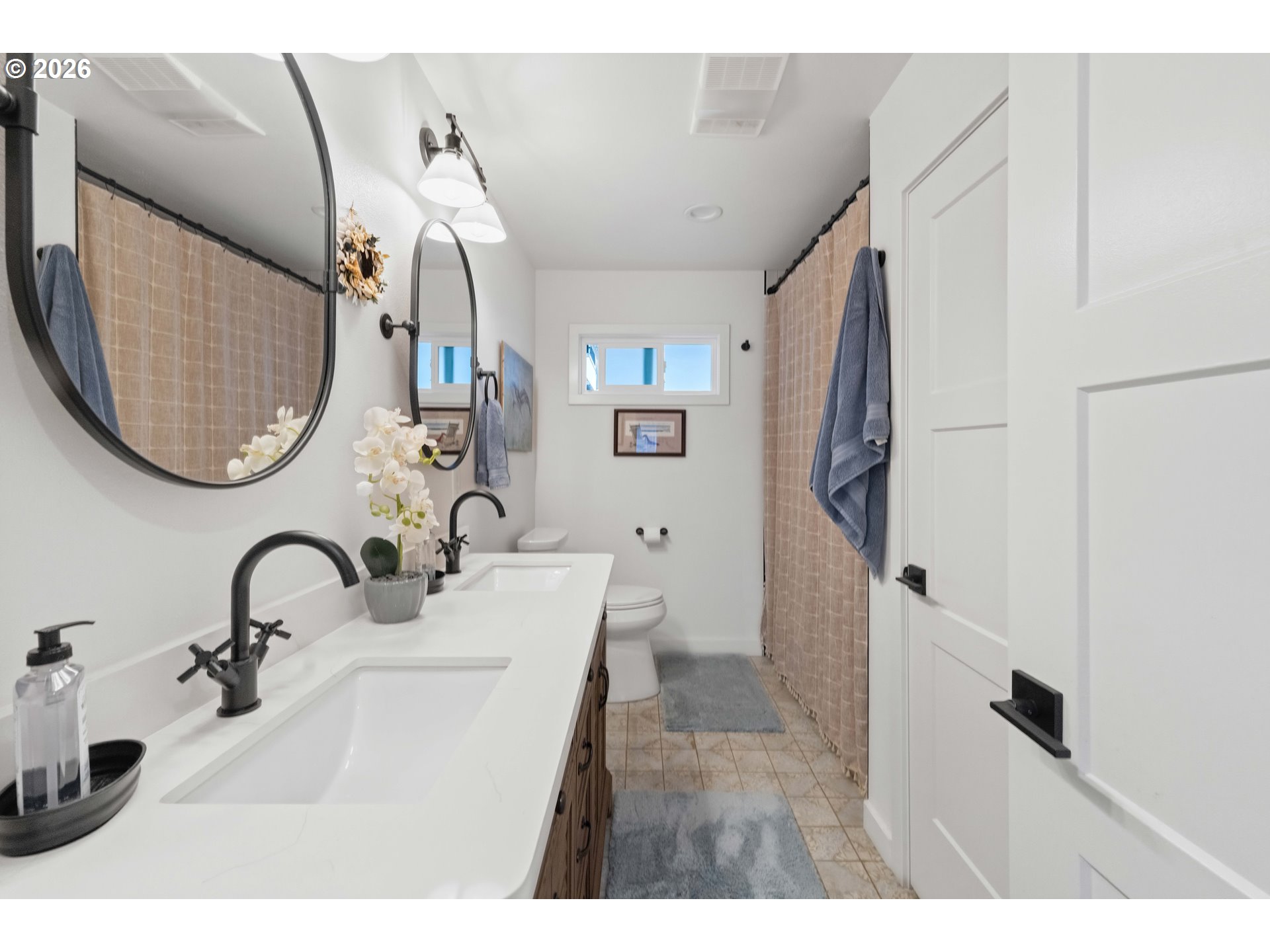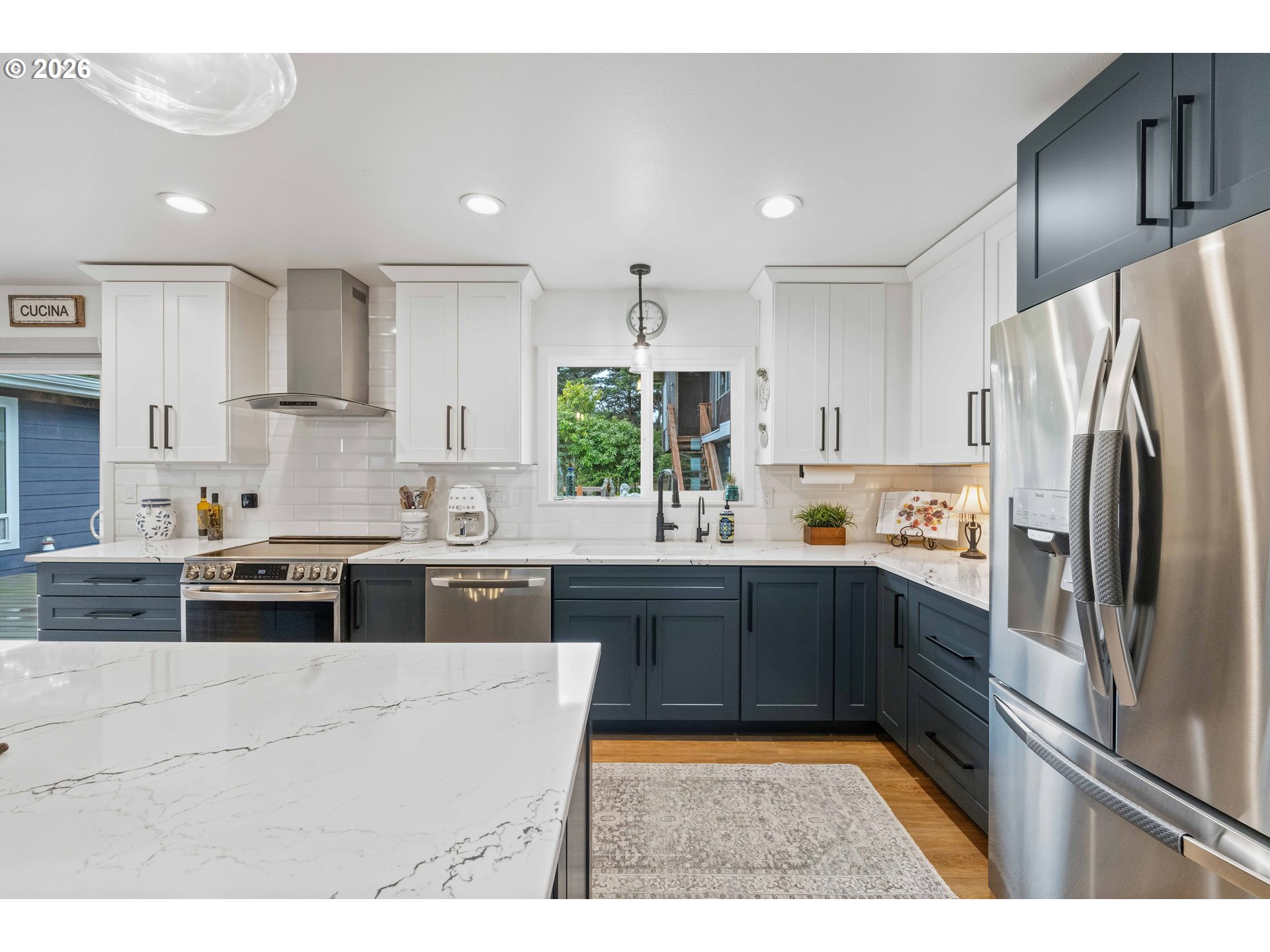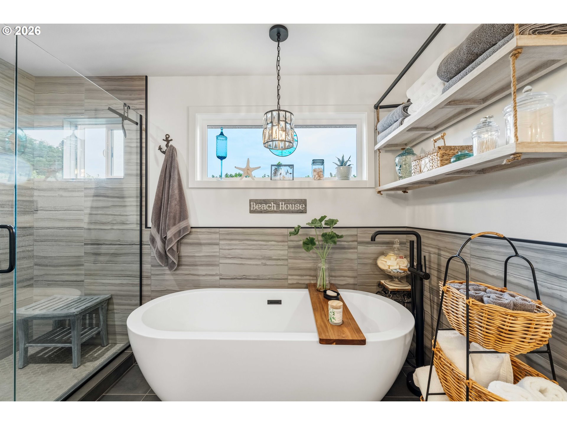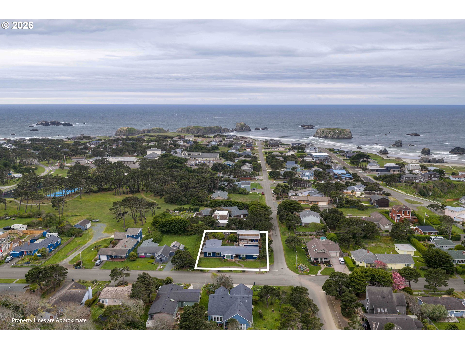 Located at 820 Jackson Ave SW in West Bandon, this exceptional property offers far more than a single residence, featuring a fully remodeled main home along with a beautifully updated guest apartment above a detached three-car garage, all just a few blocks from the beach. Set on a spacious 0.29-acre corner lot, the main home was taken down to the studs, expanded with additional living area and a new primary suite, and rebuilt with impressive attention to detail, resulting in over 2,700 square feet with four bedrooms and two bathrooms designed for both comfort and functionality. The interior showcases a generous living and dining area, a well-appointed kitchen with a large island, quartz countertops, quality cabinetry, and a full stainless appliance package, all complemented by durable luxury vinyl plank flooring throughout the home. Expansive windows provide abundant natural light, while a stately stone fireplace anchors the main living space. The roomy primary suite offers a spacious, well-appointed bath with marble counter, large soaking tub with a tiled walk-in shower exude this fine interior. The large laundry room with washer and dryer adds to everyday convenience. A new membrane roof enhances long-term value, and a sliding glass door opens to a composite deck overlooking a private backyard complete with a functional greenhouse and mature rhododendrons The detached guest quarters are a standout feature, offering impeccable living space complete with a full kitchen, one bedroom, stack washer/dryer unit and a bathroom with a beautifully tiled walk-in shower, along with a large balcony that makes it ideal for guests, extended living, or rental potential. Additional amenities include a paved circular driveway, RV hookup, pre-wiring for a hot tub, all in a highly regarded West Bandon location that offers excellent proximity to the coast and the many amenities of Bandon. Be sure to watch the video tour and call for your appointment to view this incredible residence.