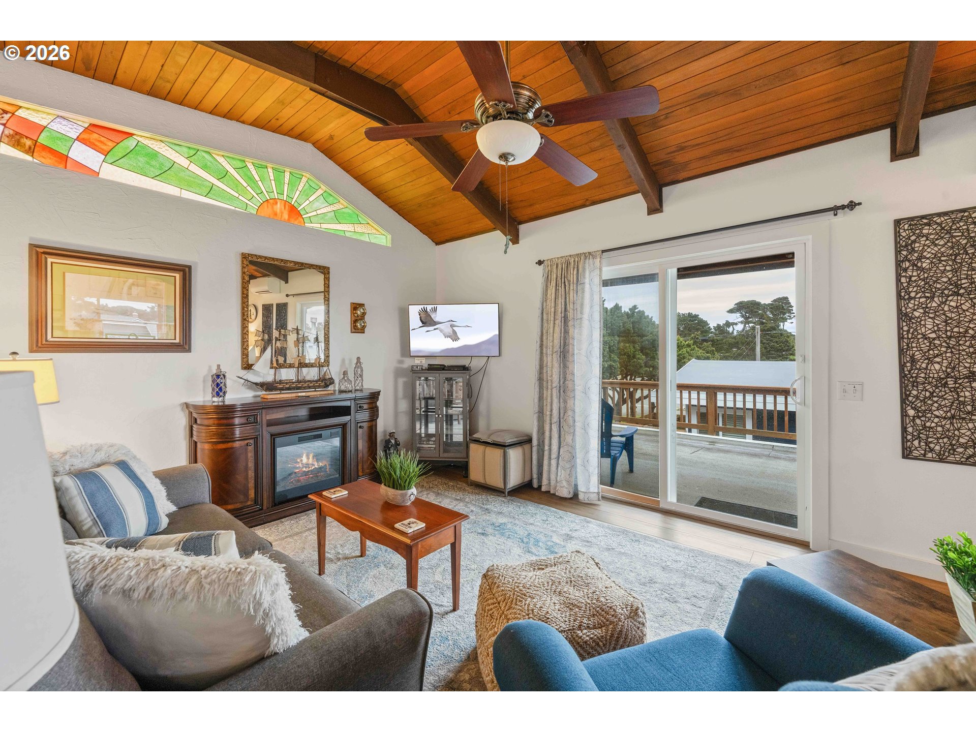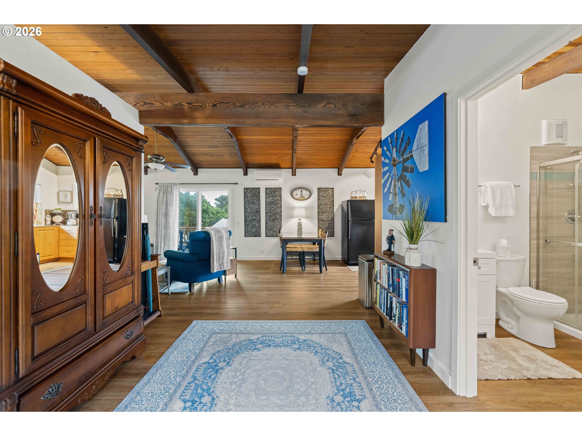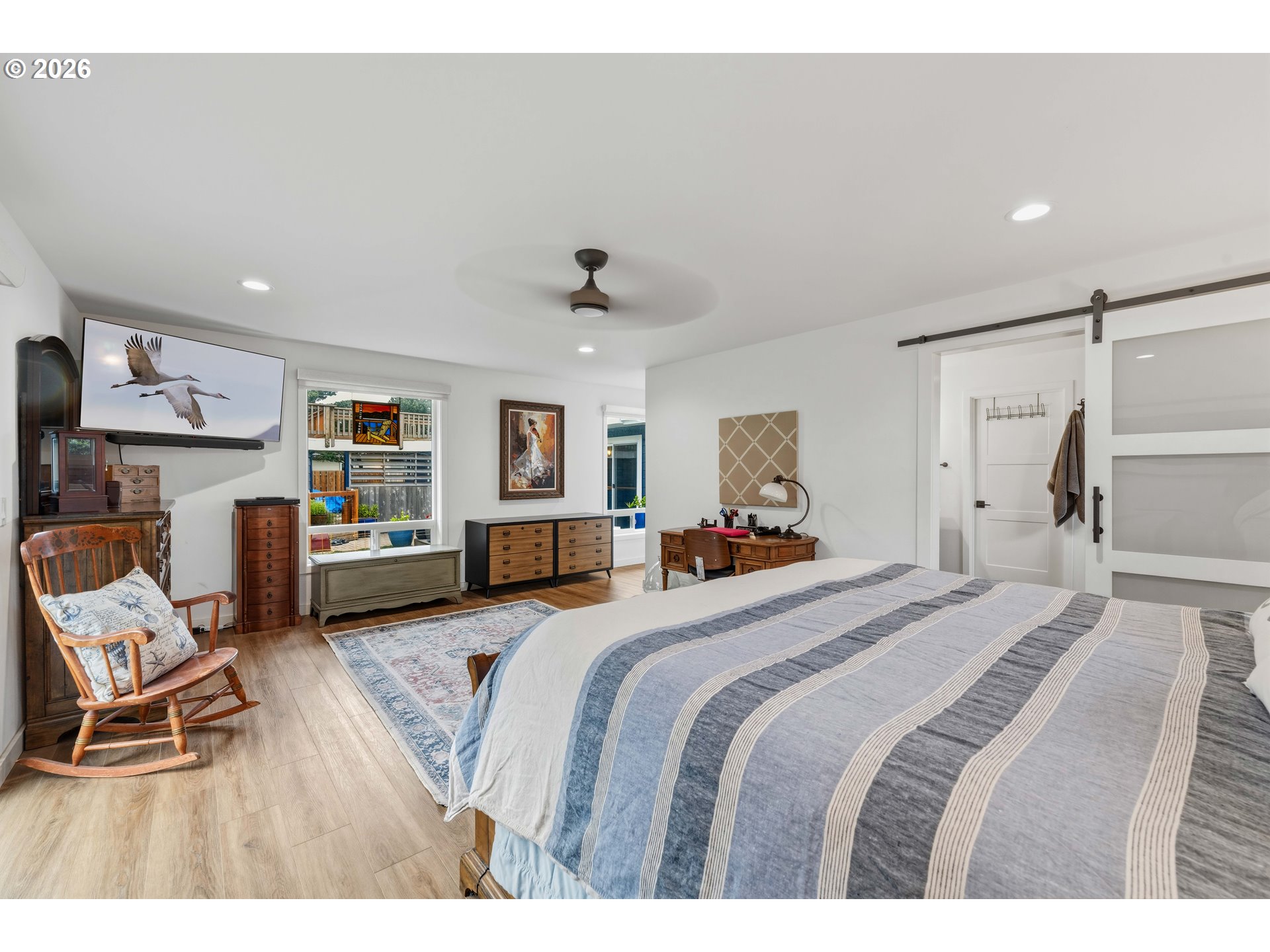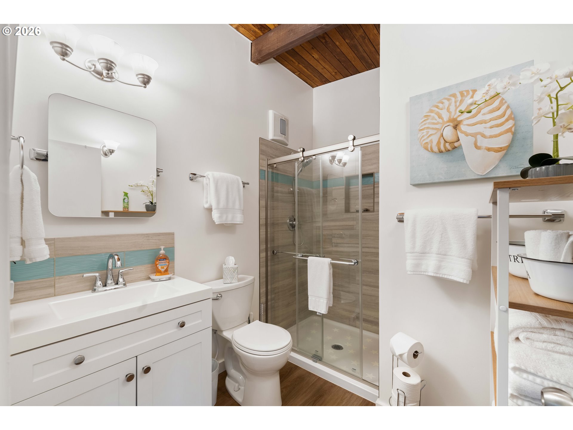 Located at 820 Jackson Ave SW in West Bandon, this exceptional property offers far more than a single residence, featuring a fully remodeled main home along with a beautifully updated guest apartment above a detached three-car garage, all just a few blocks from the beach. Set on a spacious 0.29-acre corner lot, the main home was taken down to the studs, expanded with additional living area and a new primary suite, and rebuilt with impressive attention to detail, resulting in over 2,700 square feet with four bedrooms and two bathrooms designed for both comfort and functionality. The interior showcases a generous living and dining area, a well-appointed kitchen with a large island, quartz countertops, quality cabinetry, and a full stainless appliance package, all complemented by durable luxury vinyl plank flooring throughout the home. Expansive windows provide abundant natural light, while a stately stone fireplace anchors the main living space. The roomy primary suite offers a spacious, well-appointed bath with marble counter, large soaking tub with a tiled walk-in shower exude this fine interior. The large laundry room with washer and dryer adds to everyday convenience. A new membrane roof enhances long-term value, and a sliding glass door opens to a composite deck overlooking a private backyard complete with a functional greenhouse and mature rhododendrons The detached guest quarters are a standout feature, offering impeccable living space complete with a full kitchen, one bedroom, stack washer/dryer unit and a bathroom with a beautifully tiled walk-in shower, along with a large balcony that makes it ideal for guests, extended living, or rental potential. Additional amenities include a paved circular driveway, RV hookup, pre-wiring for a hot tub, all in a highly regarded West Bandon location that offers excellent proximity to the coast and the many amenities of Bandon. Be sure to watch the video tour and call for your appointment to view this incredible residence.