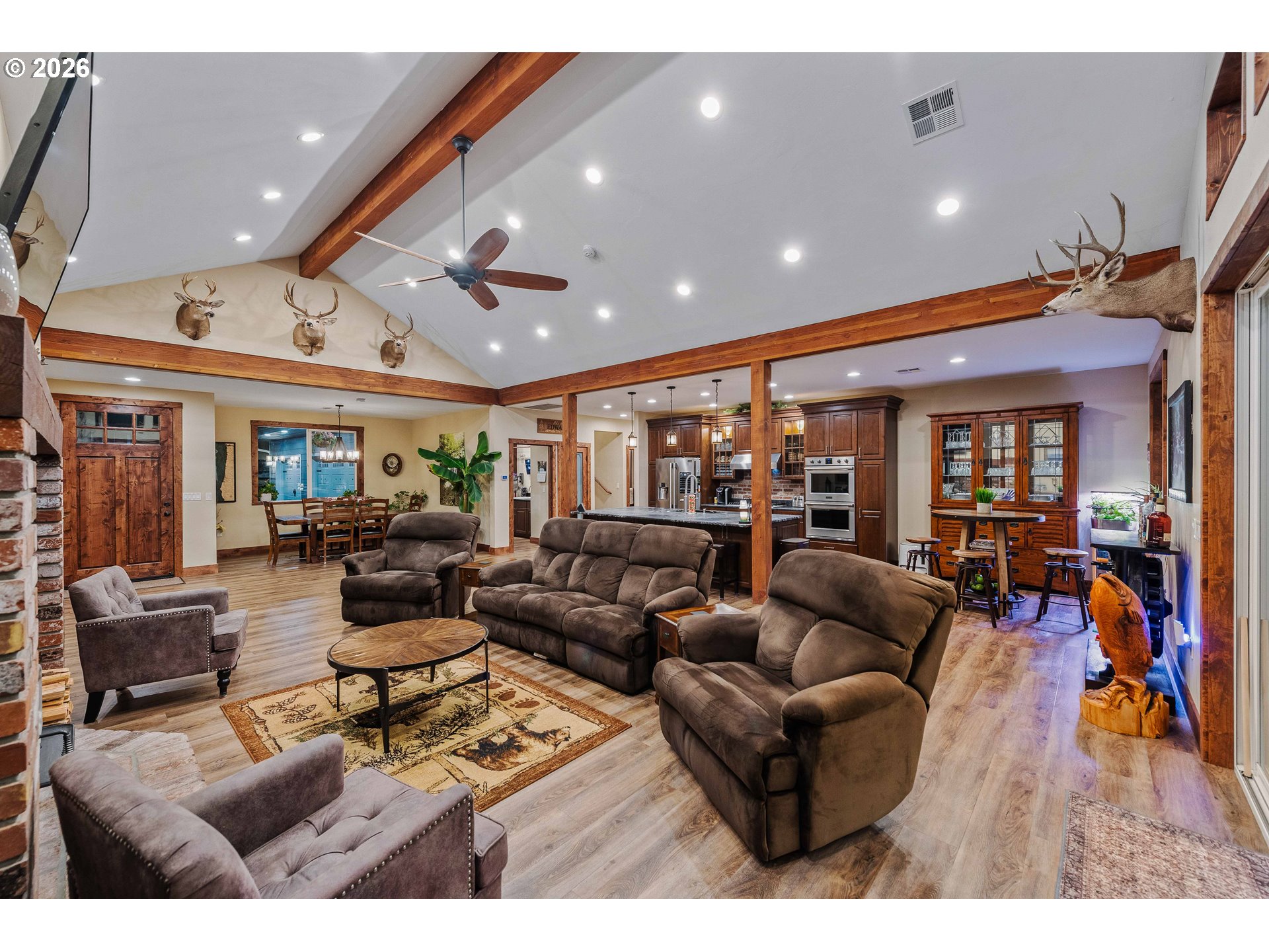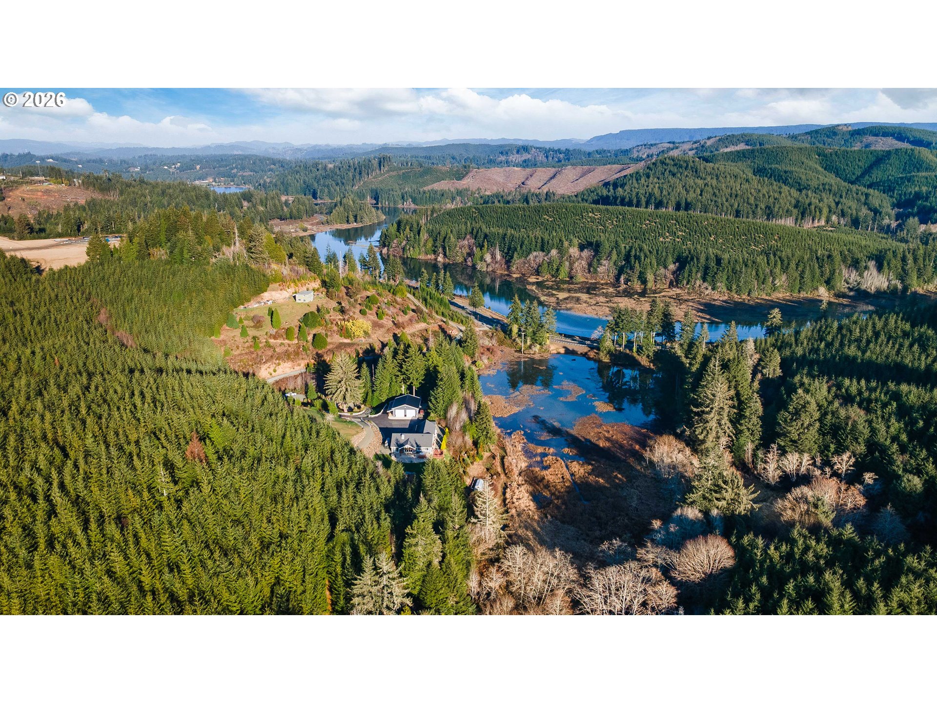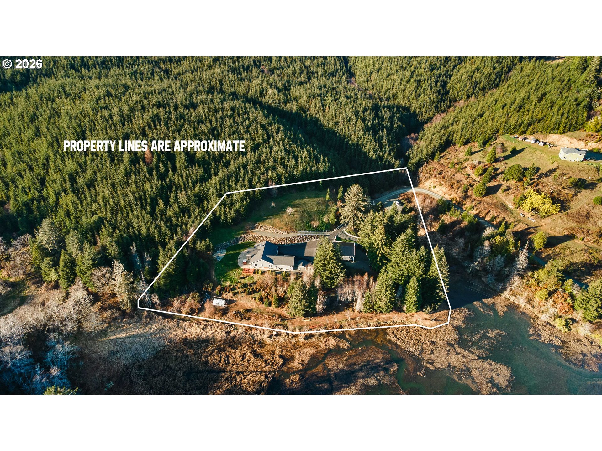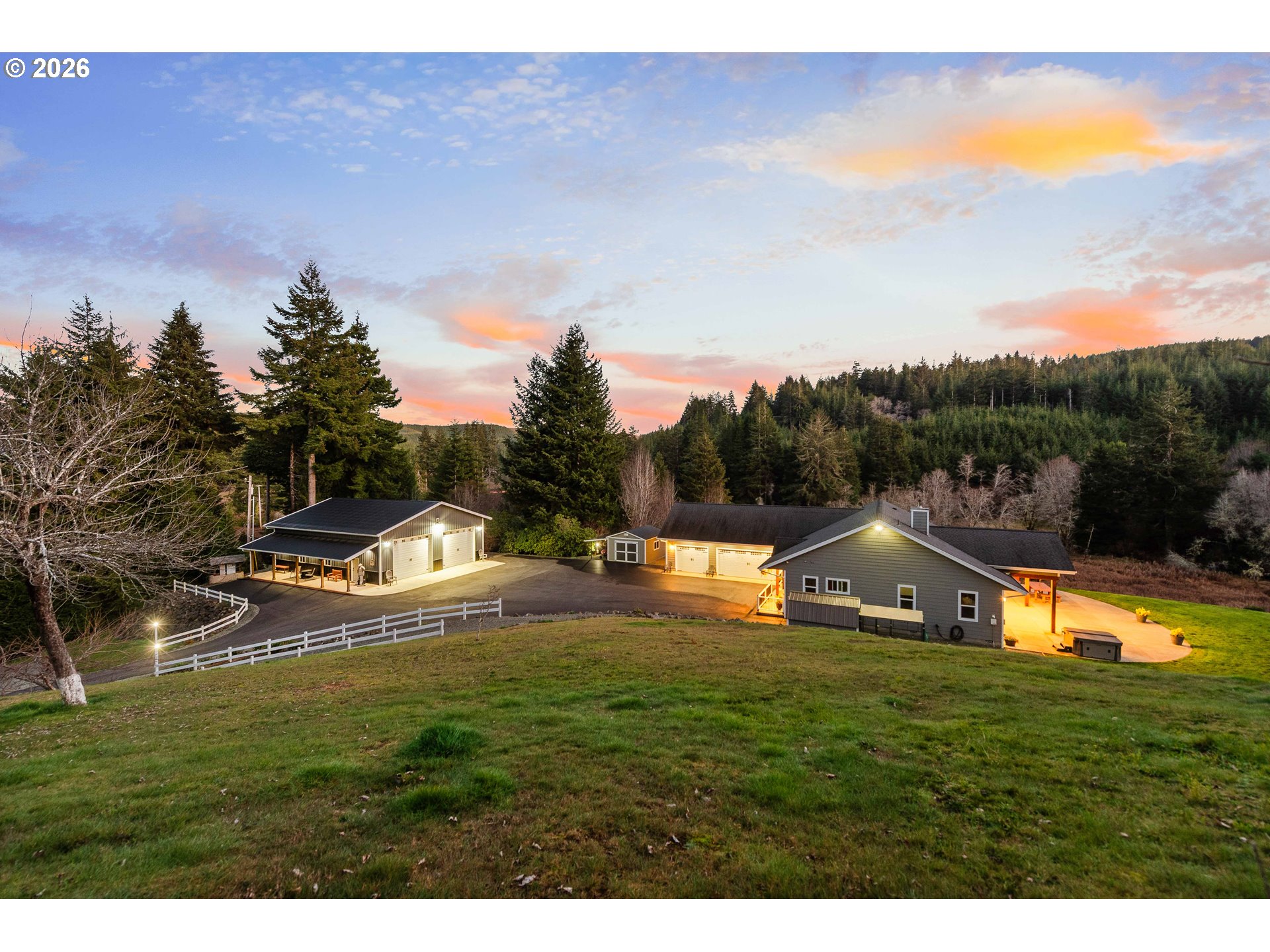 Stunning 2,886 square foot home with 3 bedrooms, 2.5 baths, and a spacious bonus room set on a private 3.15 acre property with beautiful estuary views, pond and large shop! The vaulted floor plan features soaring ceilings with exposed beams, rich knotty alder cabinetry and trim throughout, and a gourmet kitchen with granite island, dual wall ovens, gas range, stainless steel appliances, and pantry. The large primary suite offers a jetted soaking tub, walk in tile shower with rain head, dual granite vanity, and two walk in closets. Additional highlights include a custom brick wood stove alcove, heat pump, tankless water heater, backup generator, security system, abundant storage, and over 100 recessed lights.Outdoor living is designed for comfort and entertaining with a large concrete patio, covered tongue and groove ceiling, exposed beams, hot tub, fire pit, exterior propane hookup, and additional deck space. The grounds feature mature producing fruit trees, a year round pond with fountain, white fencing, stone retaining walls, and an asphalt driveway leading from a gated entrance. Property borders private timber land and enjoys peaceful natural surroundings.Outbuildings and utilities include a large shop with power, greenhouse with raised beds and water access, wood and storage sheds, and dog kennel. Private well produces 26 gallons per minute and is supported by a reverse osmosis system with dual holding tanks, propane service, HVAC system, and automatic generator transfer switch. 8 Golf courses within 15 miles including the Bandon Dunes Resort, Coos Bay just 6 miles North, this warm wind protected microclimate is the ideal location for your coastal forever home! Schedule your appointment today! Please no drivebys, private gated road.