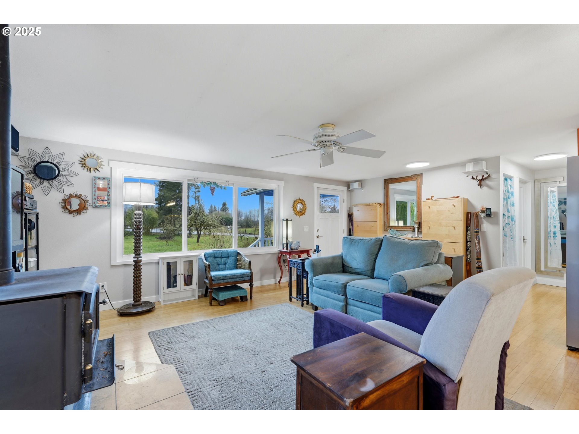 Unique country living in this one-story home on elevated foundation. The open-concept and thoughtfully designed 2 bedroom, 1 full bath home sits on 2 acres and is a true delight. Inside, the layout is warm and inviting with bamboo flooring, cozy wood stove, and natural light throughout. Bedrooms are spacious and comfortable. The exterior has fiber cement siding, New Roof (2024), New Exterior Paint (2024), and a durable Composite-type Deck ideal for morning coffee or relaxing evenings. The detached garage offers parking, storage, or workshop space. New septic system installed in 2025 adds peace of mind. The elevated foundation provides exceptional access with its impressive 8-ft crawlspace. Most of the acreage is level and ready for gardening, animals, or future possibilities. Enjoy several varieties of apple and other fruit-producing trees, perfect for fresh pies, cider, or simply welcoming wildlife! Come see this well-cared-for home and make it yours!