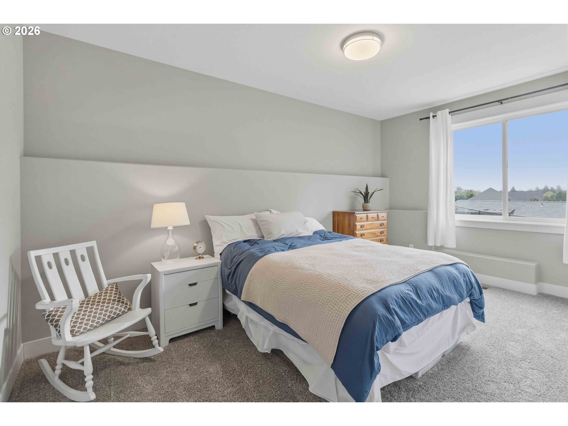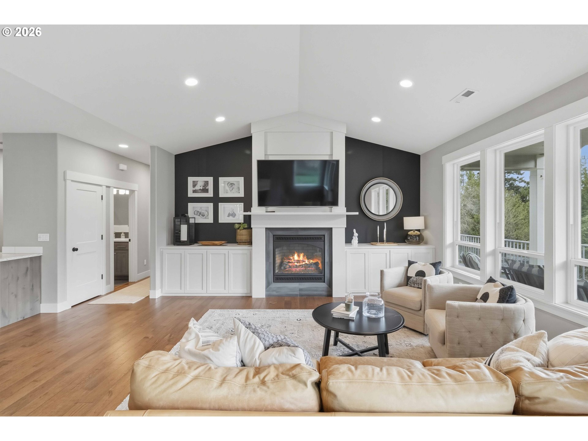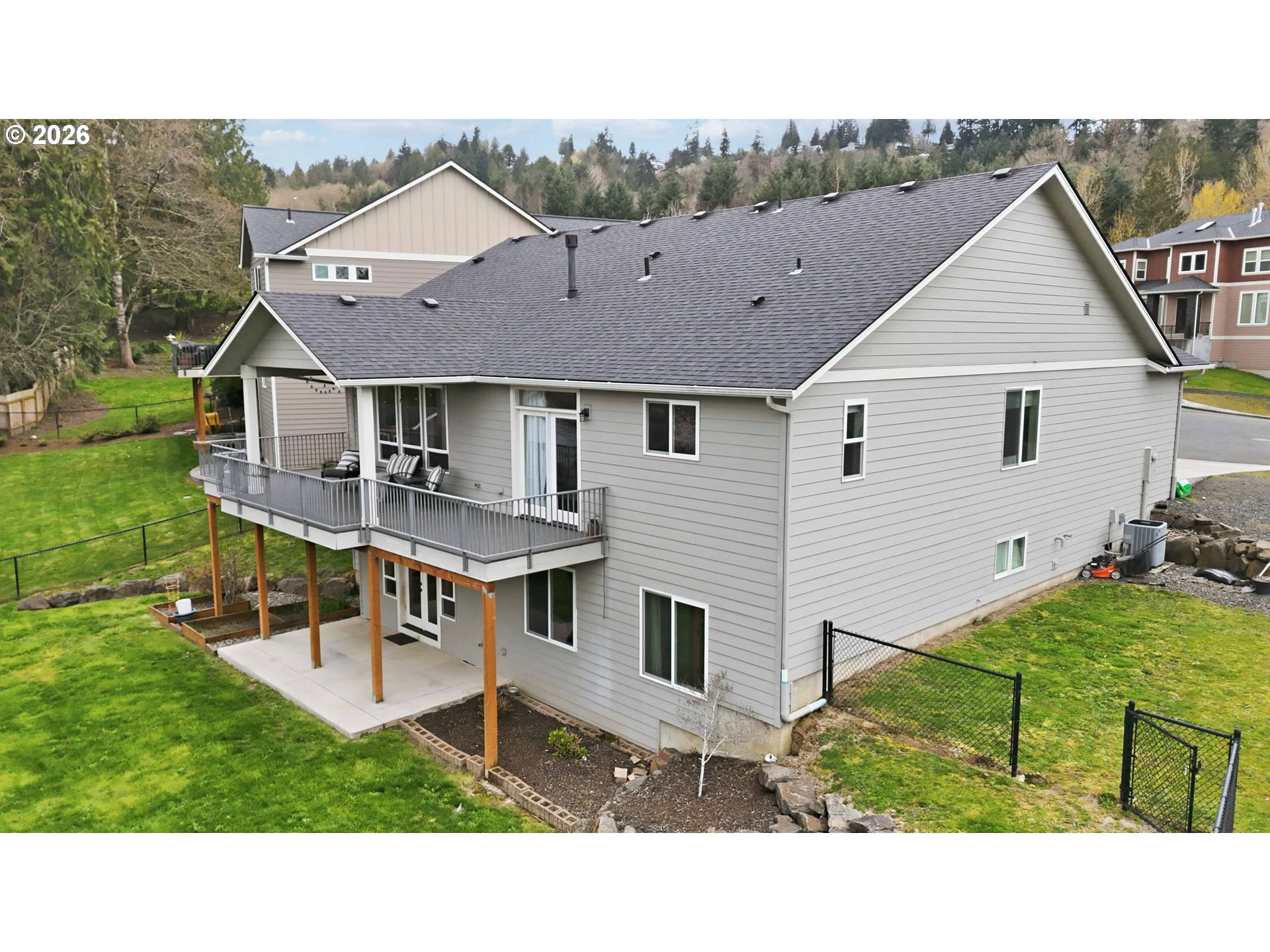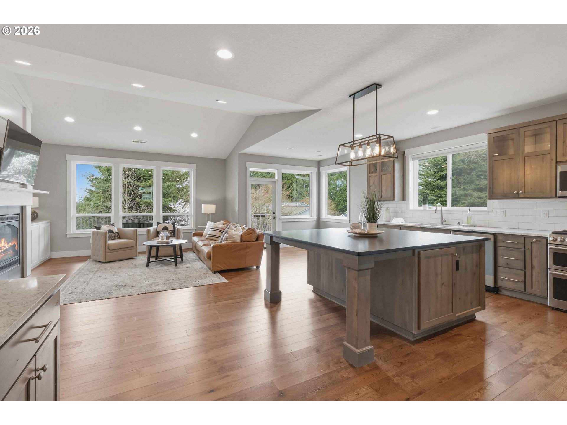 Custom-built 5-bedroom, 3-bath home with a versatile bonus room, sweeping views, and a thoughtfully designed layout filled with natural light throughout. The open kitchen and great room anchor the main level, centered around a gas fireplace and designed for both comfort and connection. Alder cabinetry, a generous granite island, quartz countertops, and a dual-fuel range (gas cooktop, electric oven) create a kitchen that blends function with understated elegance. The main-level primary suite offers a spacious walk-in closet, oversized walk-in shower, and Atrium doors opening to a Trex deck—an ideal place to take in the surrounding views. Two additional bedrooms and a full bathroom on the main level provide flexibility for guests or everyday living. The lower level extends the living space with a large family or game room featuring a wet bar, along with two bedrooms and a spacious bathroom with a walk-in shower—well suited for guests or multi-use living. A generous laundry room offers space for hobbies or crafts and includes a specially built storage room of over 400 square feet, providing exceptional organization and flexibility. Nine-foot ceilings throughout both levels enhance the sense of space, complemented by prefinished engineered oak flooring and quality finishes. Additional features include a zoned gas furnace with dual thermostats, natural gas, and an on-demand water heater. A fully fenced backyard, expansive deck, and RV parking with 50-amp service complete the home.