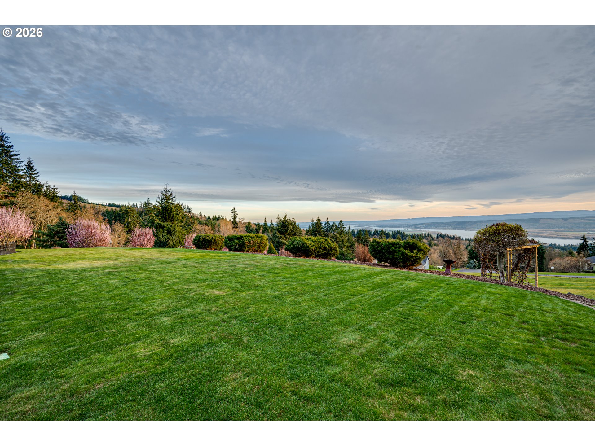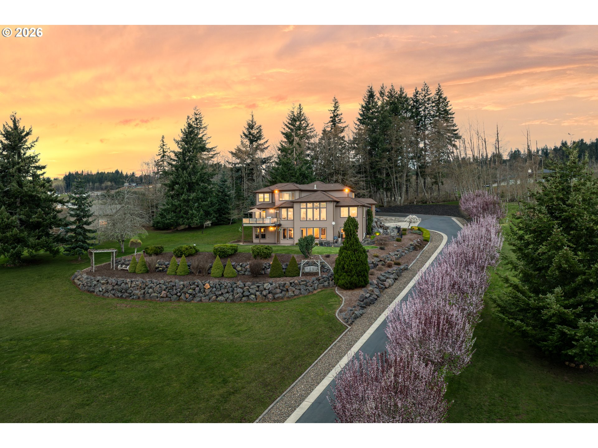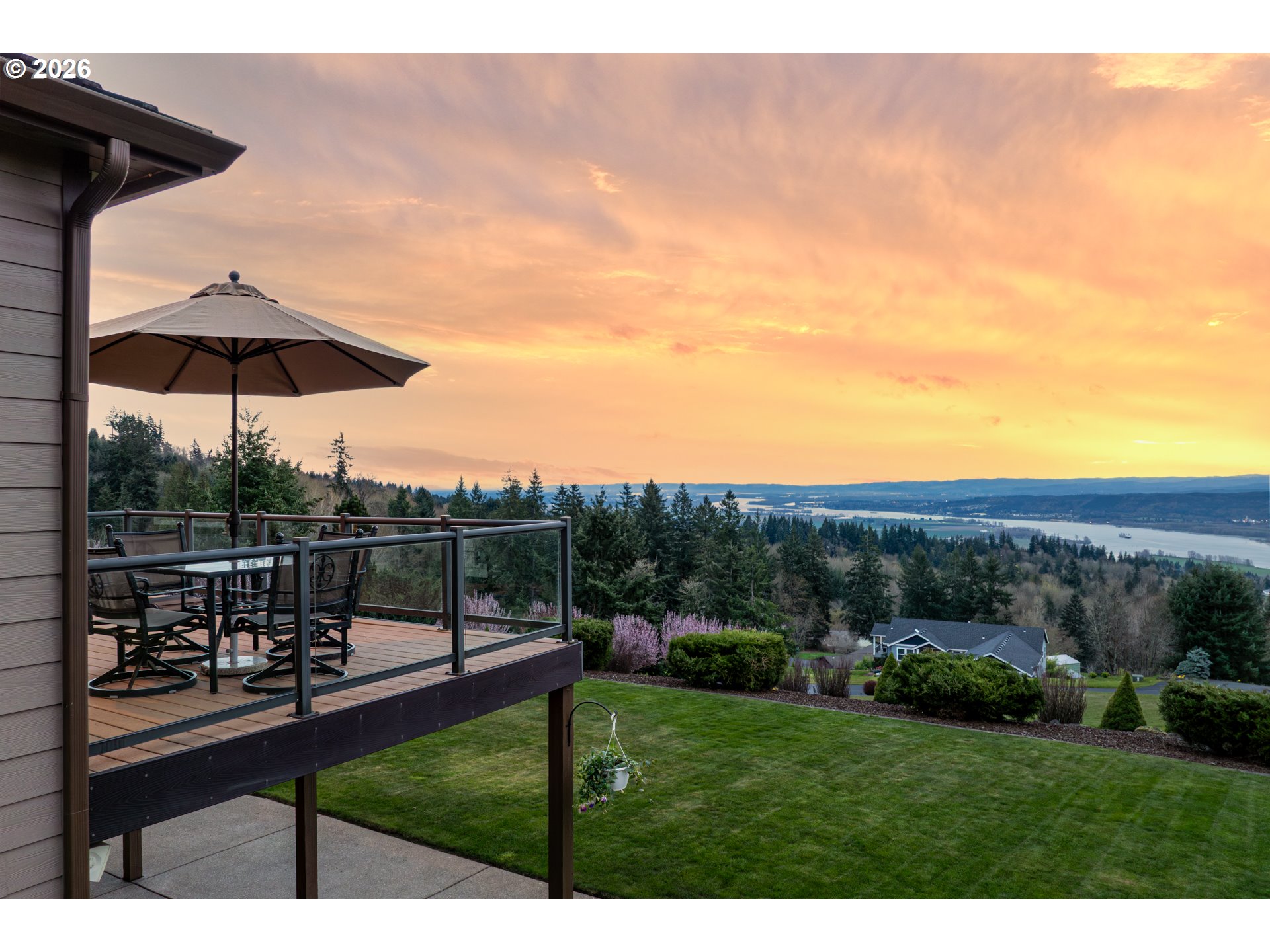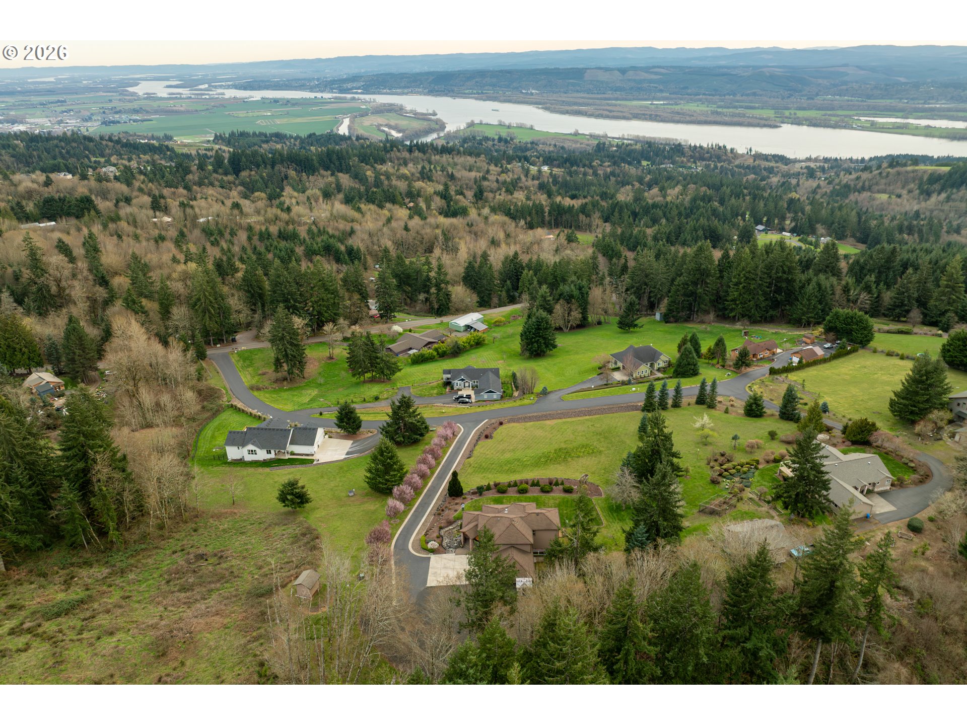Custom home with sweeping Columbia River, city, and valley views. Nearly every window is positioned to capture natural light and the views. One owner home that has been meticulously maintained. Expansive floor plan offering over 4,580 square feet with 5 bedrooms, an office, flex space, bonus room, and theater room. Gourmet kitchen features granite countertops, cherry cabinetry, gas appliances, walk-in pantry, and it is open to the main living areas. Walkout basement extends to a concrete patio and is plumbed for a future hot tub. Tri level HVAC zoning provides efficient and comfortable climate control throughout. Thoughtfully designed property with paved driveway, 3 car attached garage, RV parking, and generous additional parking. Electrical panel in place for future shop. Serene setting enhanced by a handcrafted koi pond. Located just 40 minutes to PDX and under 10 minutes to I-5.