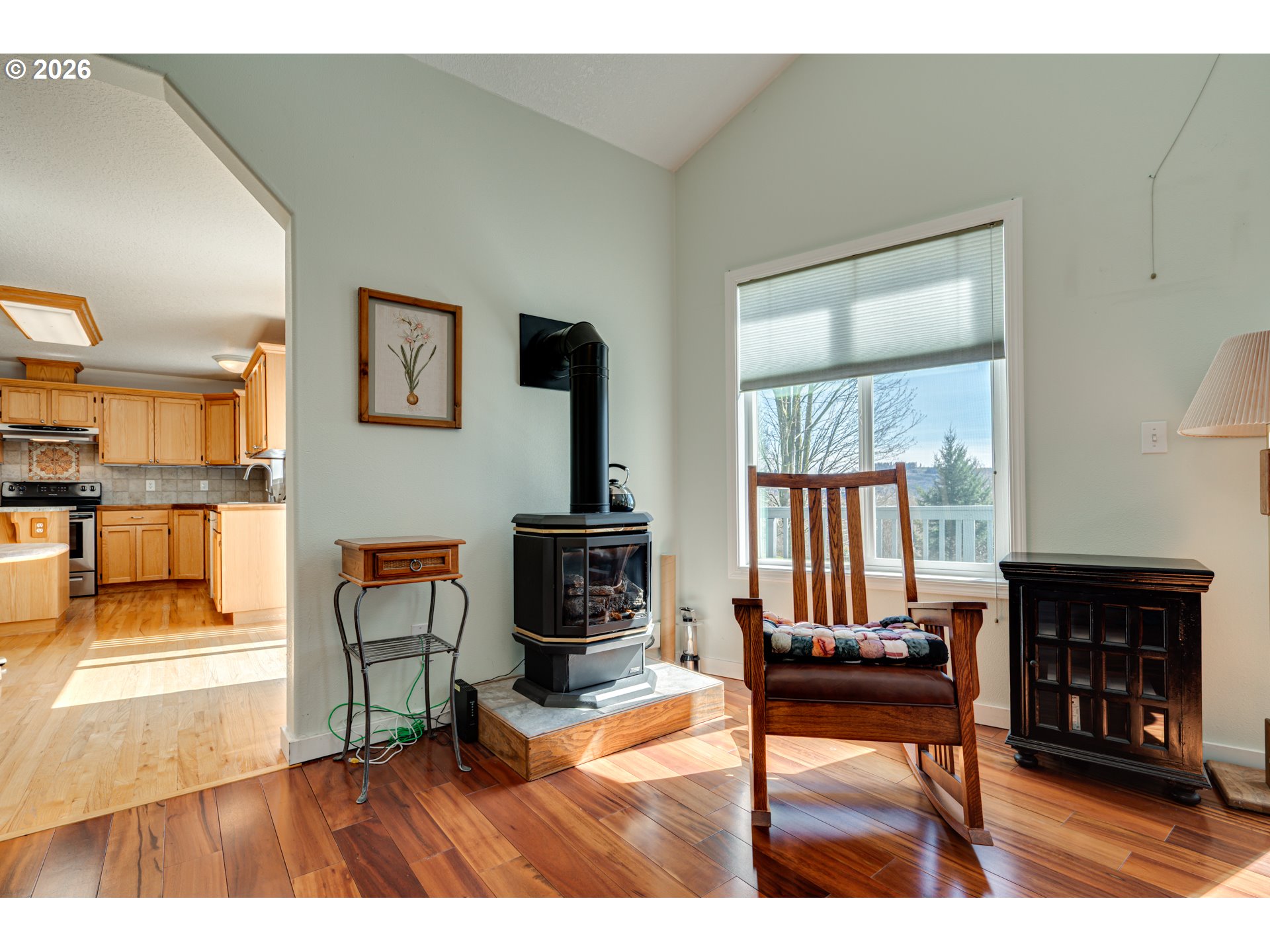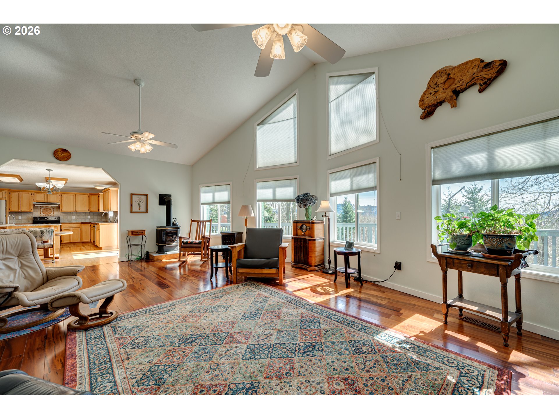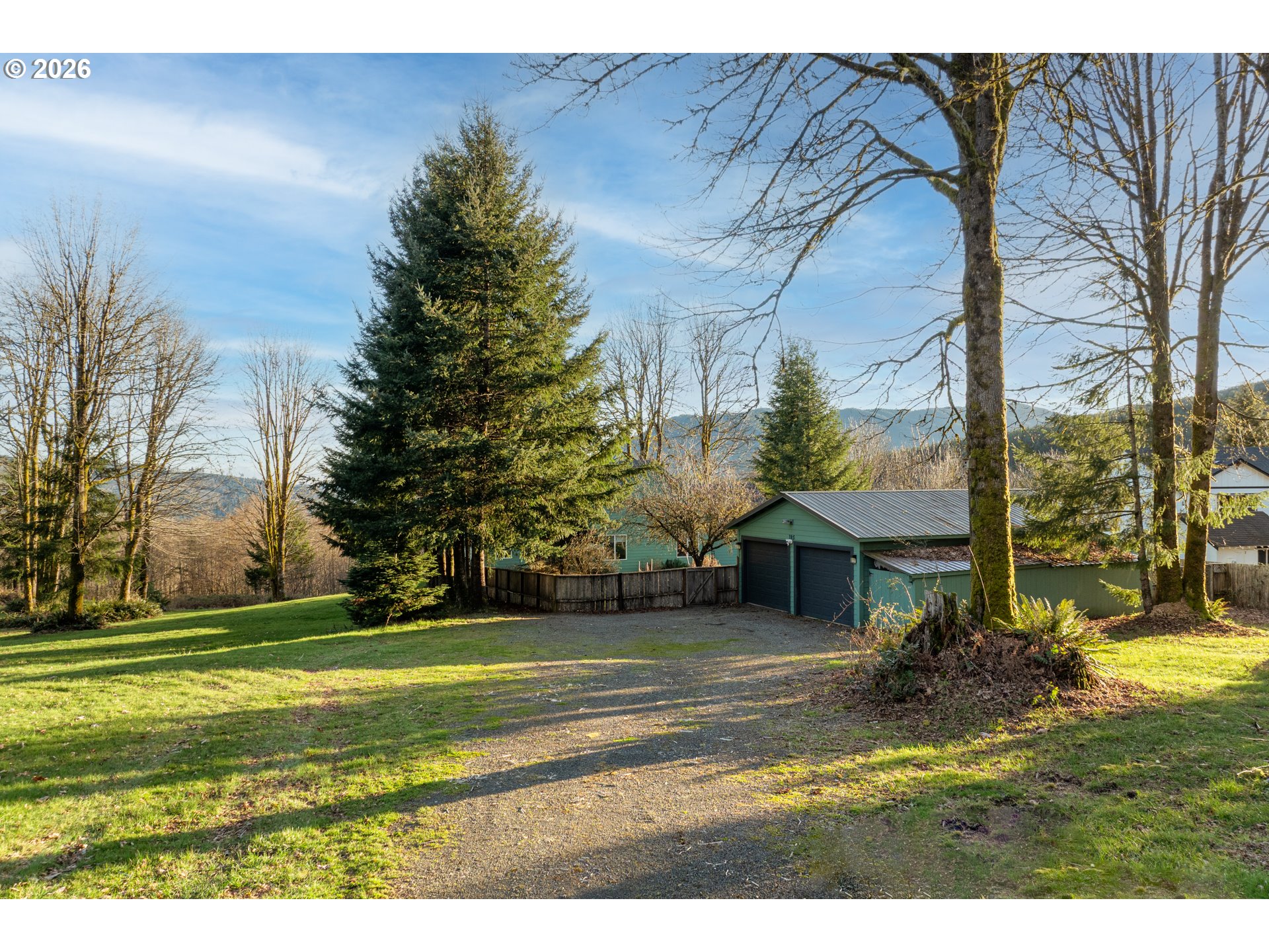 A-frame style living with expansive windows and natural light throughout. This custom 3 bed, 2 bath home sits on 5 private and usable acres. Open concept layout with 15' vaulted ceilings creates a bright, airy feel. Kitchen features granite counters, an island with a second sink, and a walk-in pantry. Dining opens to a large deck with peaceful views. Detached oversized garage with workshop space, and RV parking with hookups. Whole-house generator, forced-air heating and A/C, and a cozy propane fireplace. Close to Merwin Park, hiking, fishing, and more!