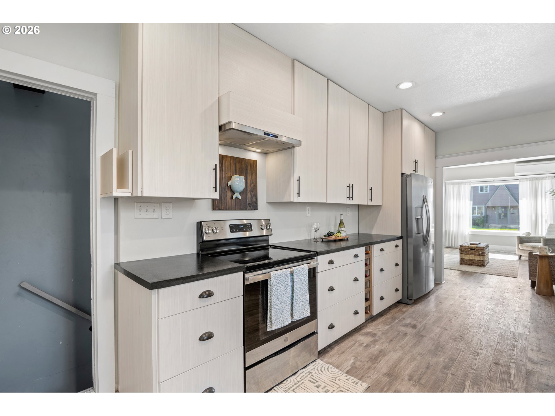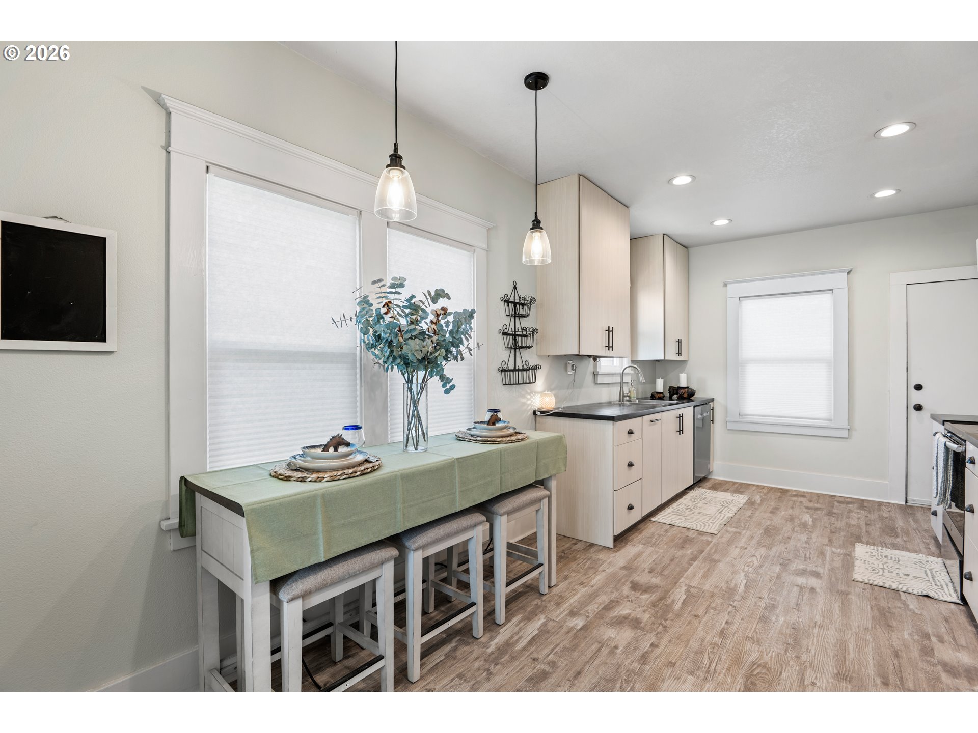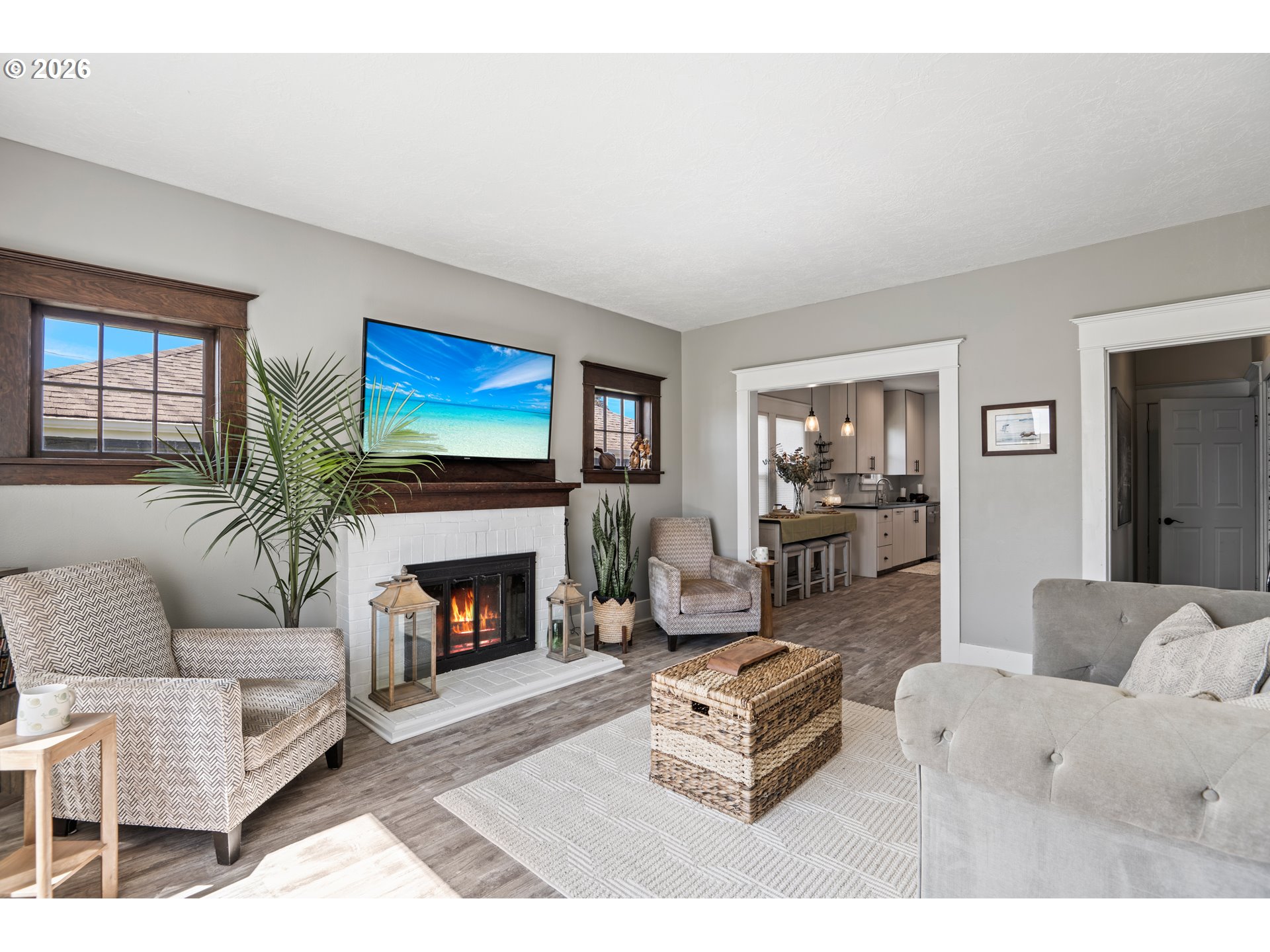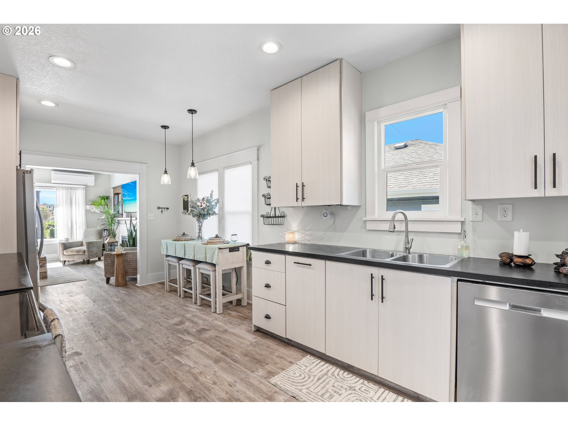 Beautifully updated 2-bedroom cottage offers a perfect blend of comfort and modern style. The home features a fully remodeled kitchen with new cabinetry and Corian counters. New waterproof luxury vinyl plank flooring throughout for durability and easy maintenance. The primary bedroom has been tastefully enhanced with crown molding and classic beadboard detailing, adding architectural character and a polished, upscale feel. The main bathroom includes a relaxing soaking tub, perfect for unwinding after a long day. The washer and dryer were relocated to the main floor for added ease. Outdoors, a lush bamboo-lined backyard creates an exceptional sense of privacy, transforming the space into a tranquil garden retreat, perfect for quiet mornings or intimate gatherings.