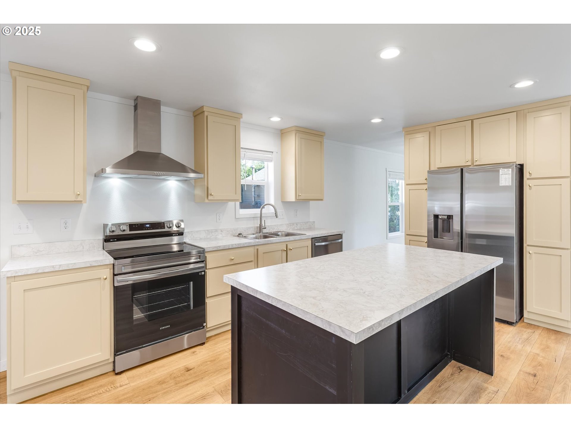 Dishwasher, FreeStandingRange, FreeStandingRefrigerator, Island, RangeHood, SolidSurfaceCountertop, Stainl