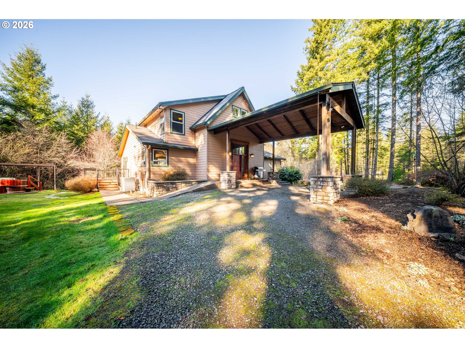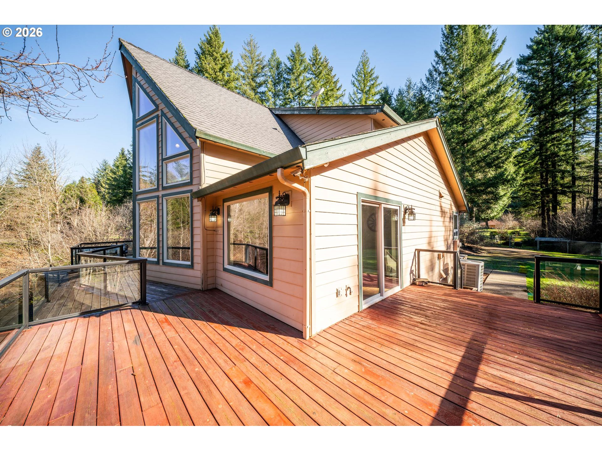 Two homes on park-like acreage surrounded by hundreds of acres of Pacificorp land (the utility company that owns neighboring Yale Lake) for ultimate privacy! Nestled at the end of a private road with a gated driveway, you can truly escape from it all here. Main home is a gorgeous lodge with soaring ceilings, stone fireplace, and a wall of windows looking at outside greenery. The gourmet kitchen has Wolf and Subzero appliances and a large walk-in pantry. Beautiful craftsmanship throughout. Upstairs are two generous bedrooms, full bath, and a loft open to below. Main floor primary bedroom and office. Finished daylight basement with flex spaces to fill your every need! Outside a deck stretches across the home with a cedar sauna and hot tub nearby. Separate home is a 1950's cabin with pellet stove, real wood panel walls, two bedrooms and one bath. Cute as can be and makes a great rental! Beautiful flat acreage, detached workshop building, fenced in dog run, and fruit trees. Backup generator system and propane tank. Roughly one-mile trail from the yard takes you right to Yale Lake! So much to offer here, must see to appreciate! Shown by appointment only.