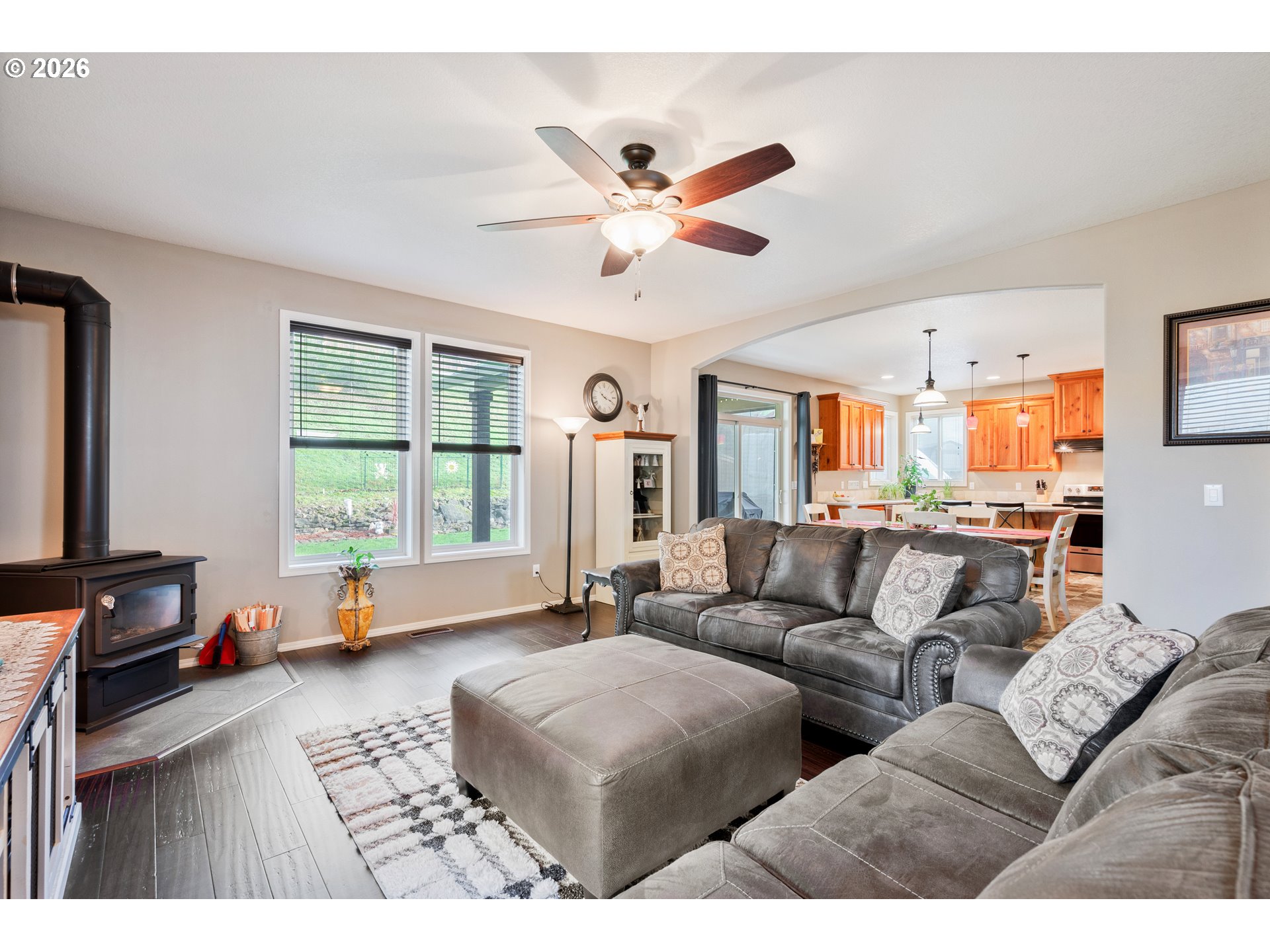 Exquisite home in the desirable Stone Forest development in Kalama w/views of the Columbia River & Oregon Hills! Beautifully maintained home boasting 3 bdrms, 3bthrms, stunning entry porch and foyer w/17 ft ceiling & designer ceiling fan, frml living rm w/engineered hardwood Bamboo floors-cozy wood stove-ceiling fan, frml dining rm w/slider to large covered patio, nicely appointed chef's kitchen w/wood cabinetry-SS appls-center island w/eating bar-large corner window over sink, spacious primary bedrm w/ensuite & 2 walk-in closets, family rm/office w/Fr doors, fully finished 2 car oversized garage w/utility & abundant storge, private fenced back yard w/storage shed, heat pump, hardi plank siding, RV or boat parking behind fence & concrete driveway w/parking for 5 cars. The HOA provides and maintains a park and walking paths.